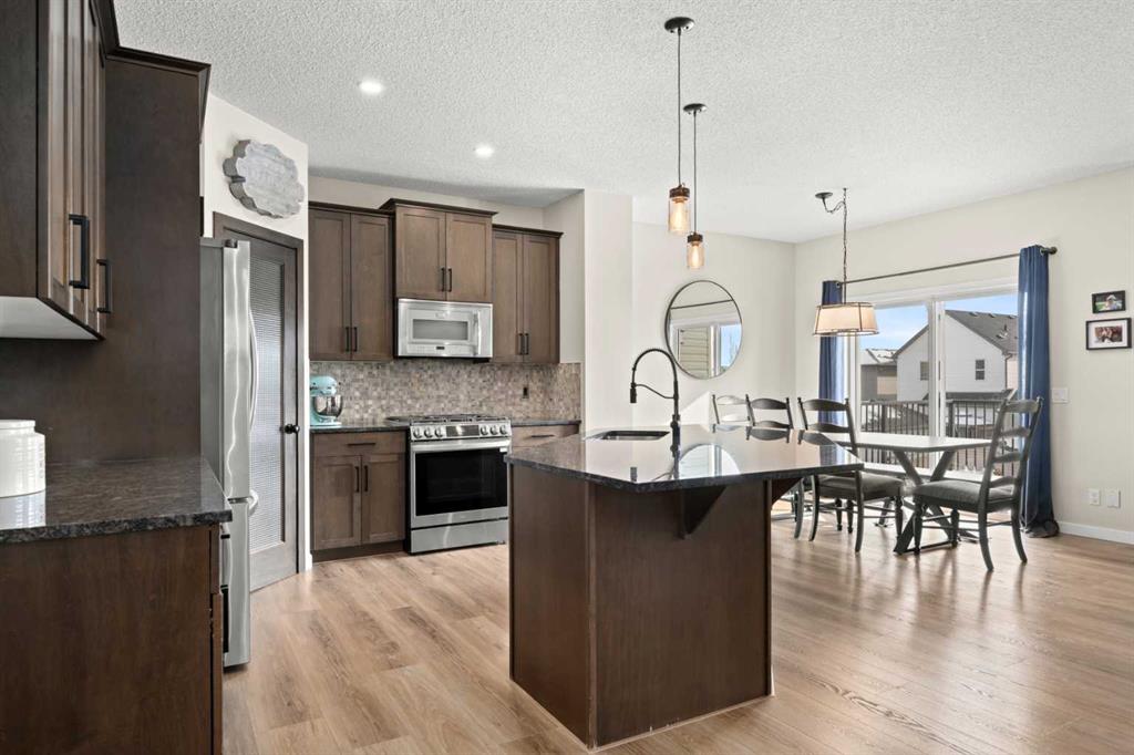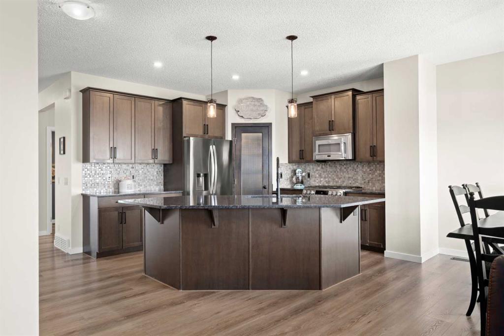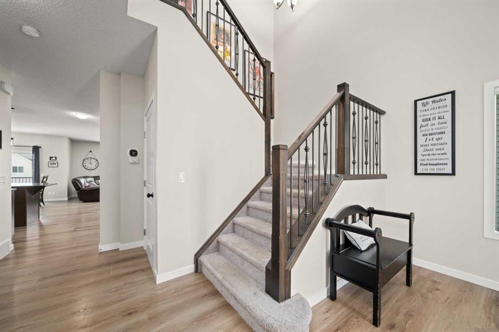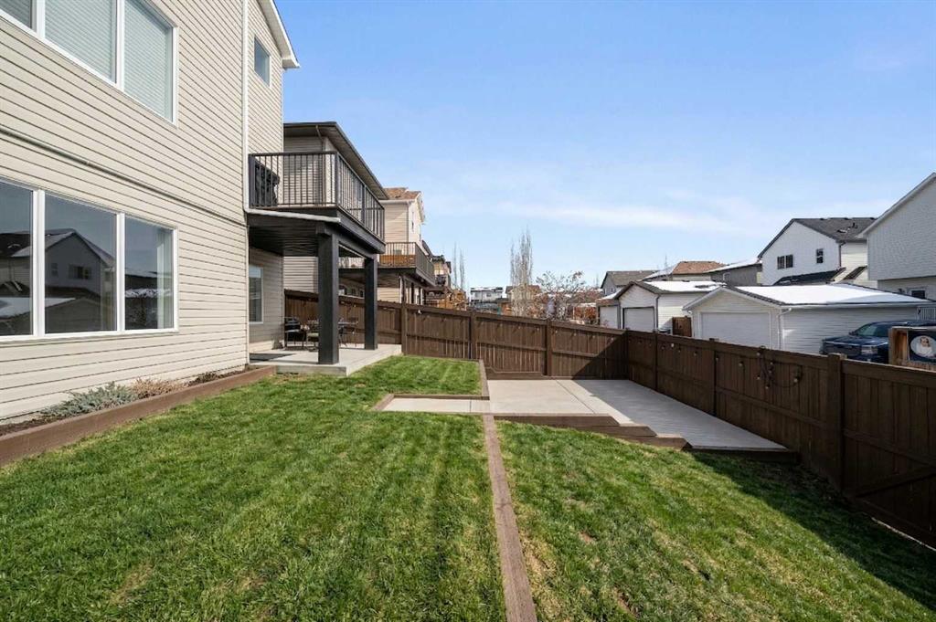 5 BEDROOMS. WALKOUT. SEPARATE LOWER LEVEL. MEANINGFUL UPGRADES. This five-bedroom walkout in Reunion offers over 3,300 square feet of finished living space across three levels. Updated where it counts and maintained with meticulous care, this home is complete, functional, and ready. The 2024 roof carries one of the highest available hail resistance ratings, a meaningful upgrade in this market. The heated garage goes beyond parking, with high ceilings, tire racks, and overhead shelving that keep seasonal items, sports equipment, and gear organized. Central air conditioning, a gas water heater, and a water softener keep the home comfortable year round. Inside, the main floor opens with an open-to-above foyer fitted with an automatic blackout blind, a small detail that makes a noticeable difference on hot summer afternoons. Nine-foot ceilings stretch across the rest of the level. The kitchen is anchored by granite countertops, a large centre island with bar seating, a gas range, and a walk-through pantry that connects directly to the mudroom. Stainless steel appliances have been updated within the past year, and additional pot lights brighten the space. A breakfast nook off the kitchen opens onto the balcony, equipped with a gas line for the BBQ. The mudroom connects directly to the garage and features a sink and built-in bench seating with storage underneath. New luxury vinyl plank flooring runs throughout the main level, and select windows are fitted with custom coverings. Upstairs, the bonus room offers a flexible space for a media room, playroom, or casual family lounge. The primary bedroom has a walk-in closet and an ensuite with dual vanities, a soaker tub, and a separate shower. Two additional bedrooms, a main bathroom with updated countertop and cabinetry, and upper-level laundry with a brand new washer and dryer complete this floor. The lower level adds nearly 1,000 square feet of fully finished living space, complete with two bedrooms, a den, a full 4-piece bathroom, a gas fireplace with blower fan, and a separate laundry hookup for a future washer and dryer. With walkout access to the backyard, this illegal suite functions independently. Whether used for extended family, older teenagers, long-term guests, or generating additional income, it offers flexibility that is increasingly hard to find. The backyard reflects the same level of care. A generous concrete pad, walkways, and steps along both sides of the home create a clean and functional flow from front to back. The covered patio below has been retrofitted with weather shielding that redirects rain to the sides, allowing the space to be used comfortably even on stormy days. Reunion is one of Airdrie’s most established communities. Herons Crossing School is walkable, Genesis Place recreation centre is nearby, and Nose Creek Park and its pathways are woven throughout the neighbourhood. QE II keeps Calgary within easy reach. This is a home that has been lived in with care and maintained with intention.