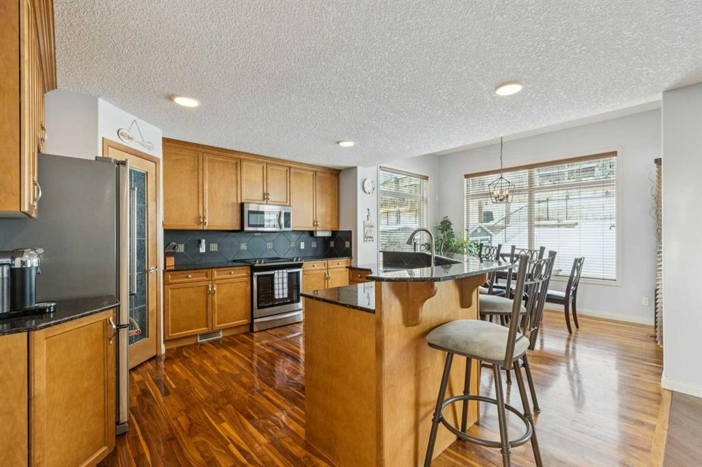 Welcome to 160 Sunset Close. A fully developed two storey home offering nearly 2,900 sq ft of comfortable living space in the heart of Sunset Ridge. Ideally located on a quiet street backing onto a walking path, this property is just minutes from St. Timothy School and nearby playgrounds, making it a fantastic option for families. Step inside to an impressive front foyer highlighted by soaring vaulted ceilings that create an immediate sense of space. The main floor is thoughtfully laid out with a generous kitchen featuring granite countertops, stainless steel appliances, a central island, and ample cabinetry. The adjoining dining area and living space make everyday living and entertaining easy, while a dedicated main floor office provides a quiet and functional work from home setup. A convenient 2 piece bathroom completes this level. Upstairs, you’ll find three well sized bedrooms and two full bathrooms, including a spacious primary retreat with a walk in closet and private ensuite. The fully finished basement expands your living options with two additional bedrooms, a full bathroom, a large family or recreation room, and plenty of storage space. Notable upgrades include newer upstairs windows, a two stage furnace installed in 2024, hot water tank replaced in 2020, and central air conditioning added in 2021. Take advantage of this fantastic opportunity to move into an established, family friendly community in desirable Cochrane.