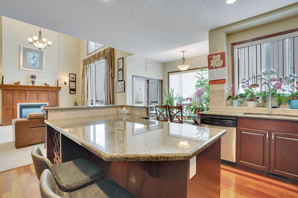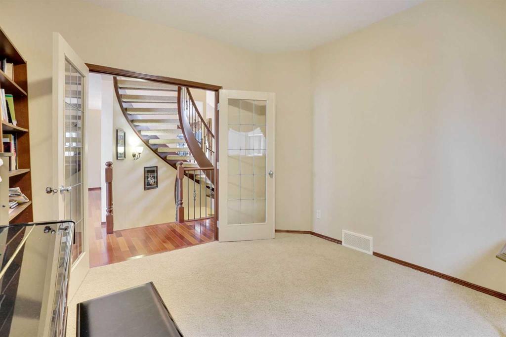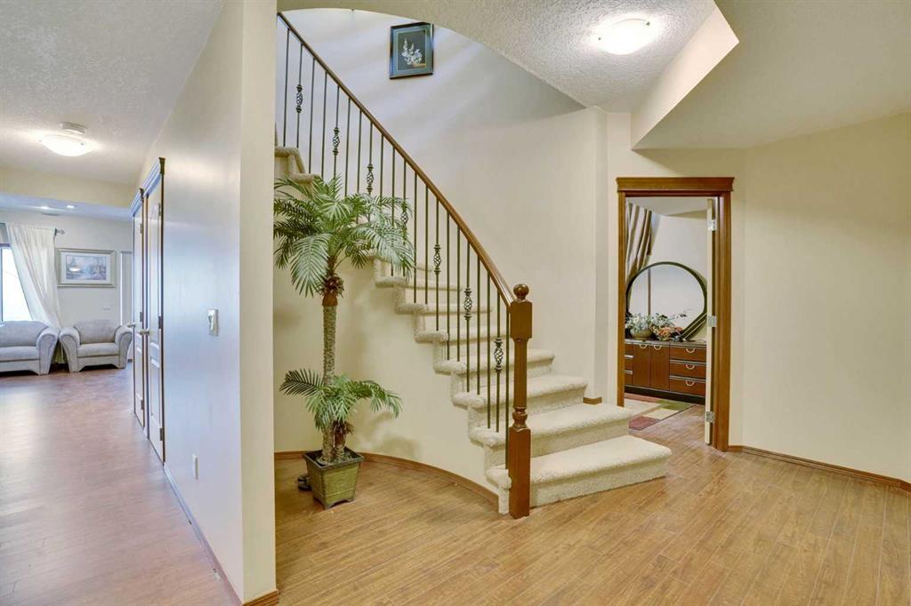 This stunning two-story house offers breathtaking views and is situated on a spacious lot of over 9,900 square feet. The attractive layout features elegant curved stairs. On the main floor, you will find an office, a living room with soaring ceilings, a formal dining room, a kitchen with a breakfast nook, a two-piece bath, and a generous mudroom. Upstairs, the alluring staircase leads to three large bedrooms, a full bathroom, and a master bedroom complete with a cozy sitting area that showcases the spectacular view. The master suite includes a luxurious five-piece en suite and a walk-in closet. The curved staircase also leads down to the walk-out basement, which features a large family/recreation room with a wet bar, an additional bedroom, and another full bathroom. The south-facing backyard boasts a full rear deck and low-maintenance landscaping. This beautiful home is located in the prestigious community of Springbank Hill, close to Calgary’s excellent private and public schools, shopping centers, and a wide array of amenities.