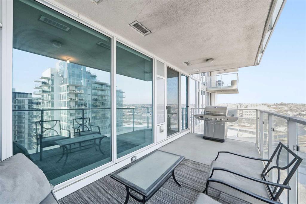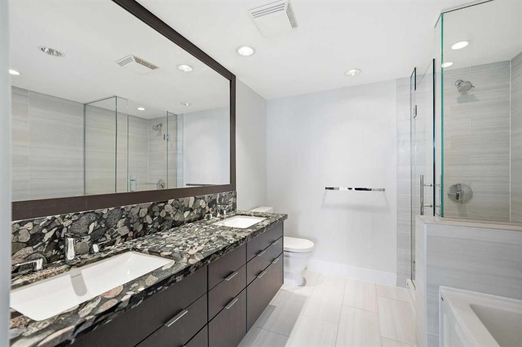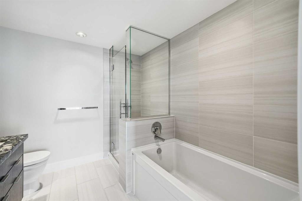 Welcome to this bright and beautifully maintained condo in the heart of East Village, one of Calgary’s most vibrant and walkable communities. This 2-bedroom, 2-bathroom suite in the highly sought-after Evolution complex offers exceptional value for buyers seeking upscale finishings, comfort, and long-term potential. Freshly painted and move-in ready, this modern home features a spacious open-concept layout with floor-to-ceiling windows that flood the space with natural light. The stylish kitchen is equipped with full-size stainless steel Jenn-Air appliances, granite countertops, and sleek cabinetry — perfect for both everyday living and entertaining. Heated tile floors in the bathrooms add an extra touch of luxury that today’s homeowners and renters alike will appreciate. The primary suite offers a walkthrough double closet and a generous ensuite complete with dual sinks, a soaker tub, and a separate shower. The second bedroom is thoughtfully positioned near the second full bathroom, making it ideal for guests, roommates, or a home office. Additional features include central A/C, in-suite laundry, underground parking, and assigned storage. Step outside to your large private balcony with a BBQ gas line and take in beautiful views toward the Bow River. Residents of Evolution enjoy an exceptional lifestyle with 24/7 concierge service, a fully equipped fitness centre, sauna and steam rooms, a rooftop patio with BBQs, a social lounge, bike storage, and underground visitor parking. Located just steps from the RiverWalk, CTrain, Superstore, the new Arena District, Calgary Public Library, Studio Bell, and countless restaurants and cafés, this location truly can’t be beat. Whether you’re entering the market or adding to your investment portfolio, this is a rare opportunity to own a low-maintenance, high-appeal property in one of Calgary’s most desirable downtown neighbourhoods.