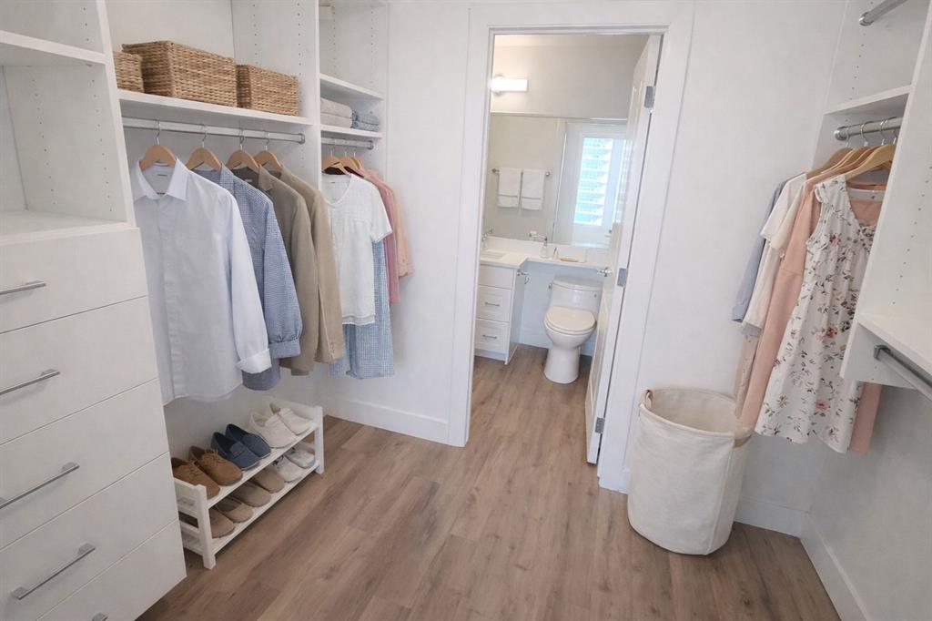 The spacious primary bedroom offers a relaxing retreat with a walk-through closet customized by California Closets and a private, spa-inspired ensuite complete with a deep soaker tub. A second well-sized bedroom and a full bathroom with a walk-in shower provide flexibility for guests, family, or a home office. The convenience of in-suite laundry adds to the ease of everyday living.