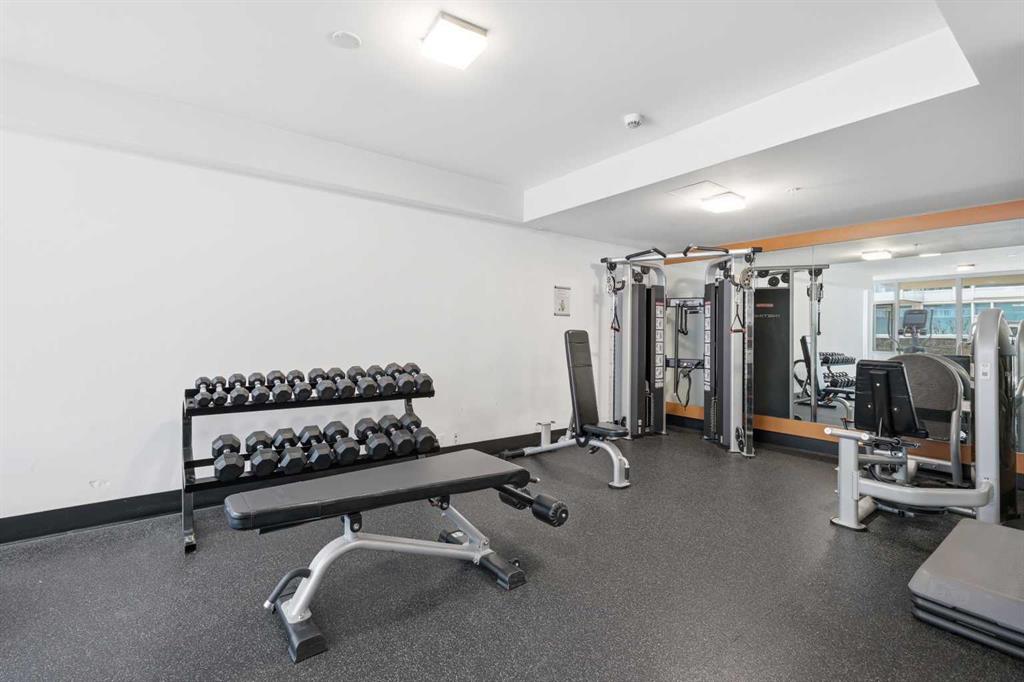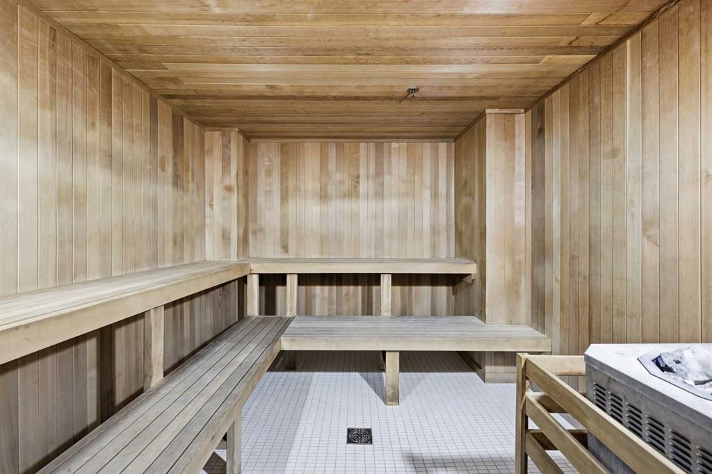 The building is called Evolution and it delivers. Two gyms, a social lounge, a steam room, a sauna, and an outdoor patio. Concierge at the front desk and overnight security. Key fob access throughout the building. Your parking stall is underground and you have a storage locker in the parkade too. Condo fee covers heat. Central AC is in the unit.