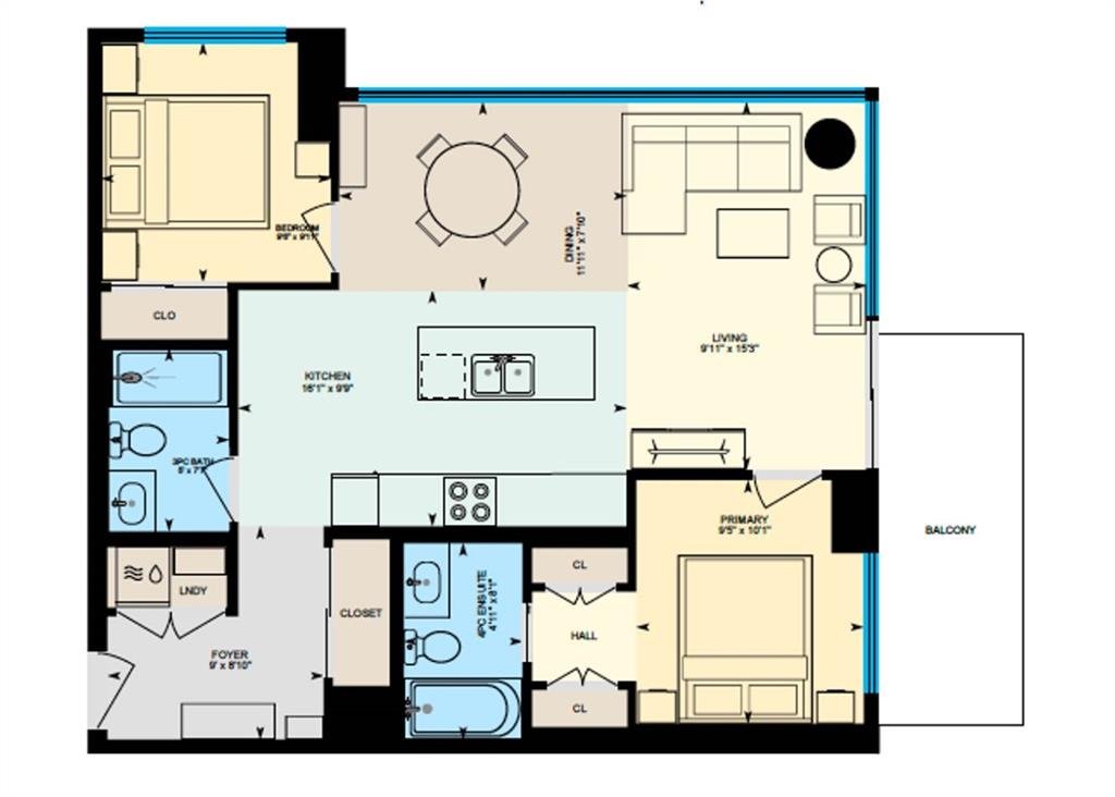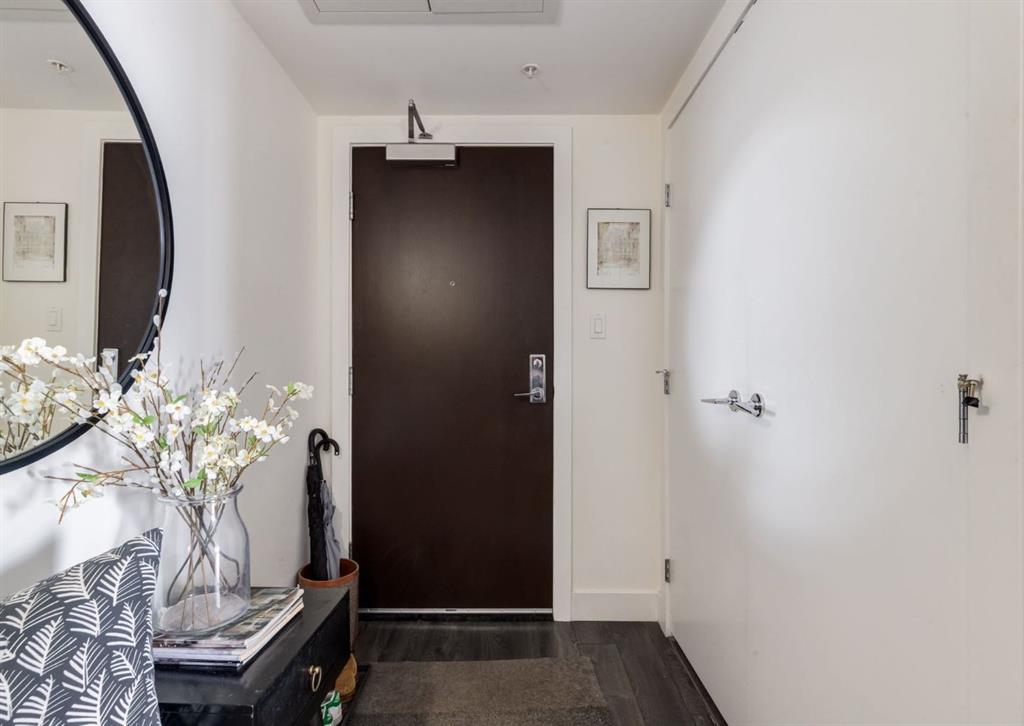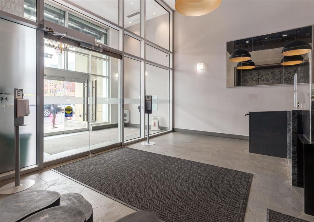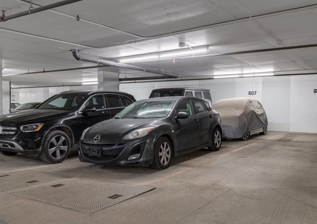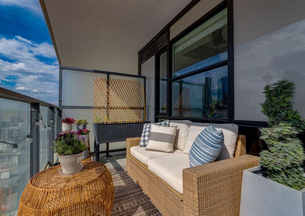 CITY & MOUNTAIN VIEWS from this stunning southwest corner unit! This bright and welcoming open-concept home is filled with natural light and offers 2 bedrooms, 2 full bathrooms, tandem titled parking for two vehicles, and a large balcony with breathtaking views you’ll enjoy every day. The modern kitchen features sleek cabinetry, stainless steel appliances including panelled refrigeration, quartz countertops, and plenty of storage. The primary bedroom easily fits a king-size bed and includes a walk-through closet with custom built-ins leading to a contemporary ensuite. The second bedroom is conveniently located next to a full 3-piece bathroom—perfect for guests, roommates, or a home office. Enjoy the perks of this executive concrete building, which offers concierge service, a fitness centre, party room, rooftop terrace, workshop, air conditioning, high-speed elevators, visitor parking, and a separate assigned storage locker. Impeccably maintained by its original owners, this move-in-ready home is also pet friendly (with board approval) and ideally located—just steps from Pixel Park, river pathways, the LRT, Stampede Grounds, Central Library, restaurants, cafes, shops, and groceries. Floor plans and a 3D tour are readily available, providing a glimpse into this stylish condo!