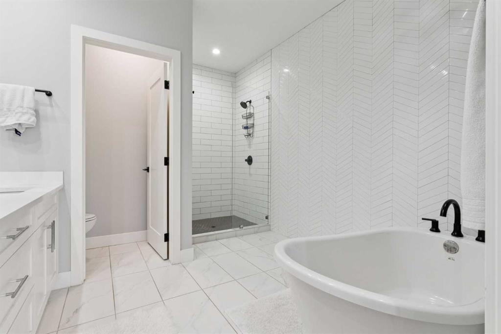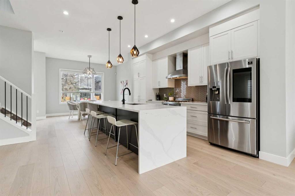This sophisticated, contemporary semi-detached infill in Capitol Hill offers exceptional value with over 2,700 square feet of functional living space featuring 4 bedrooms, 3 and half bathrooms, premium finishes, and a south facing yard. The main floor boasts brand new engineered wide plank oak hardwood flooring, ten-foot ceilings, and generously proportioned living areas. These include a formal dining room, a living room with a sliding glass door to the rear yard, and a modern kitchen equipped with stainless steel appliances and shaker-style cabinetry. A tiled mudroom provides direct access to the double detached garage and includes built-in millwork for organized storage. A privately situated powder room completes this wonderful main floor. The upper level comprises three spacious bedrooms, two full bathrooms, and convenient second-floor laundry. The master suite features a sizable walk-in closet and a private five-piece ensuite with a freestanding soaker tub, a separate water closet, and an oversized glass shower. The fully finished basement includes a large recreation room with a wet bar, a fourth bedroom, and a fourth bathroom. Finally, the home is complete with air conditioning, charming landscaping, a very useful at-grade concrete patio, and irrigation. Book your private tour today.