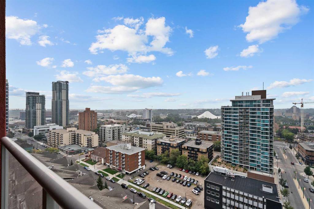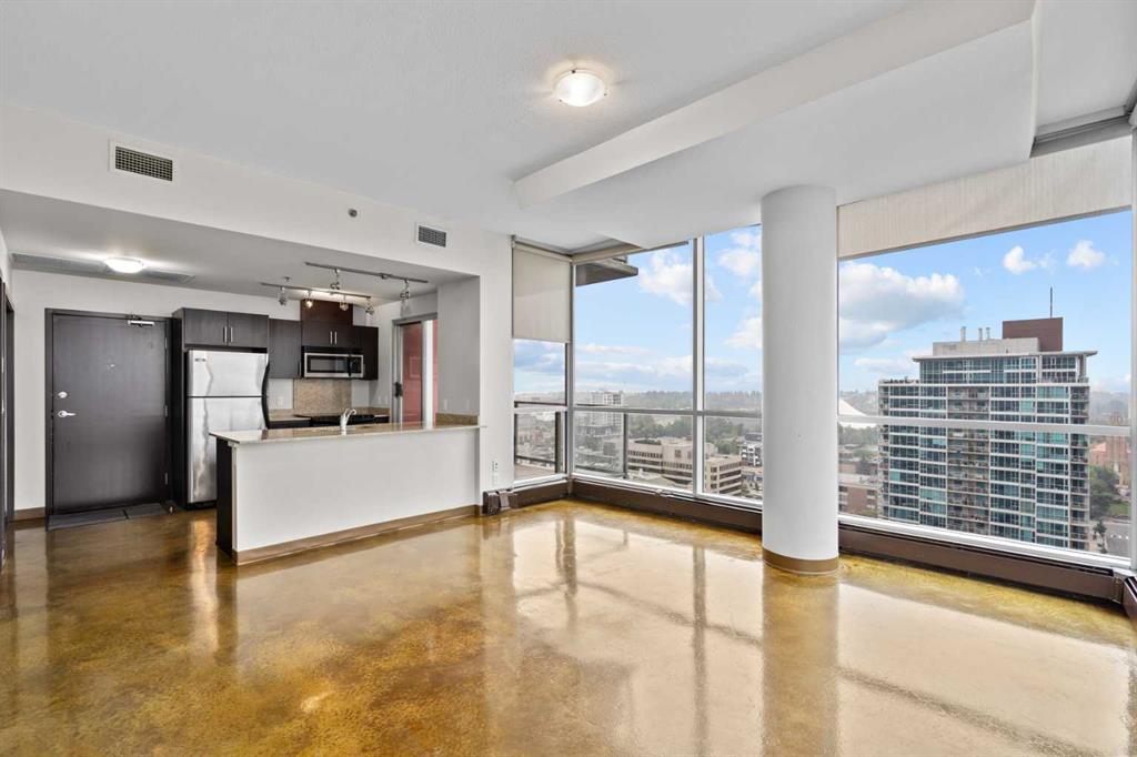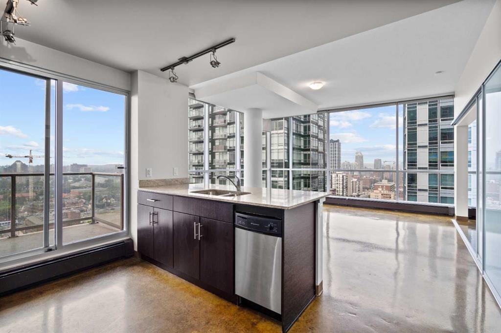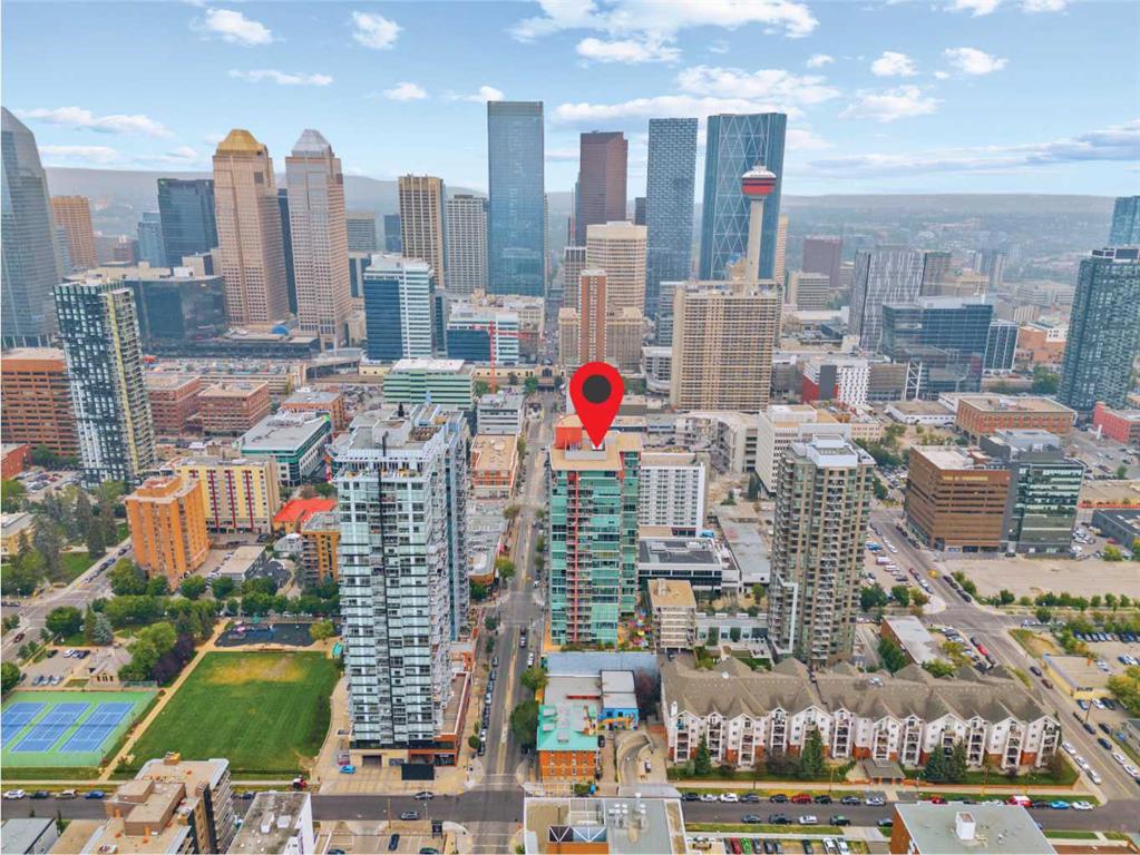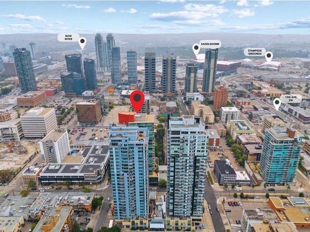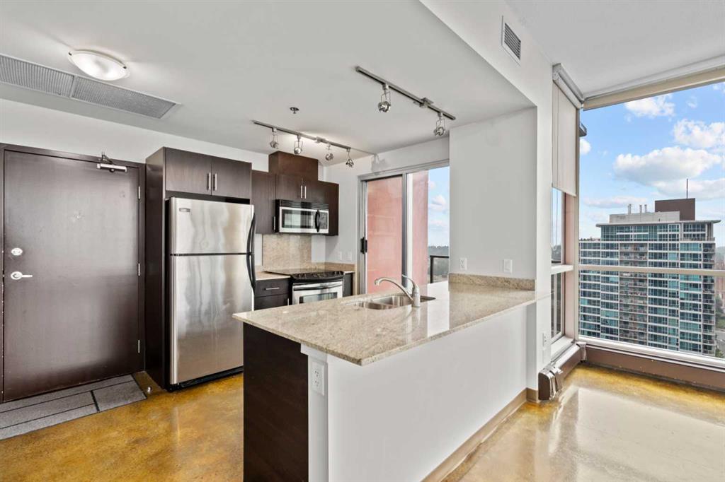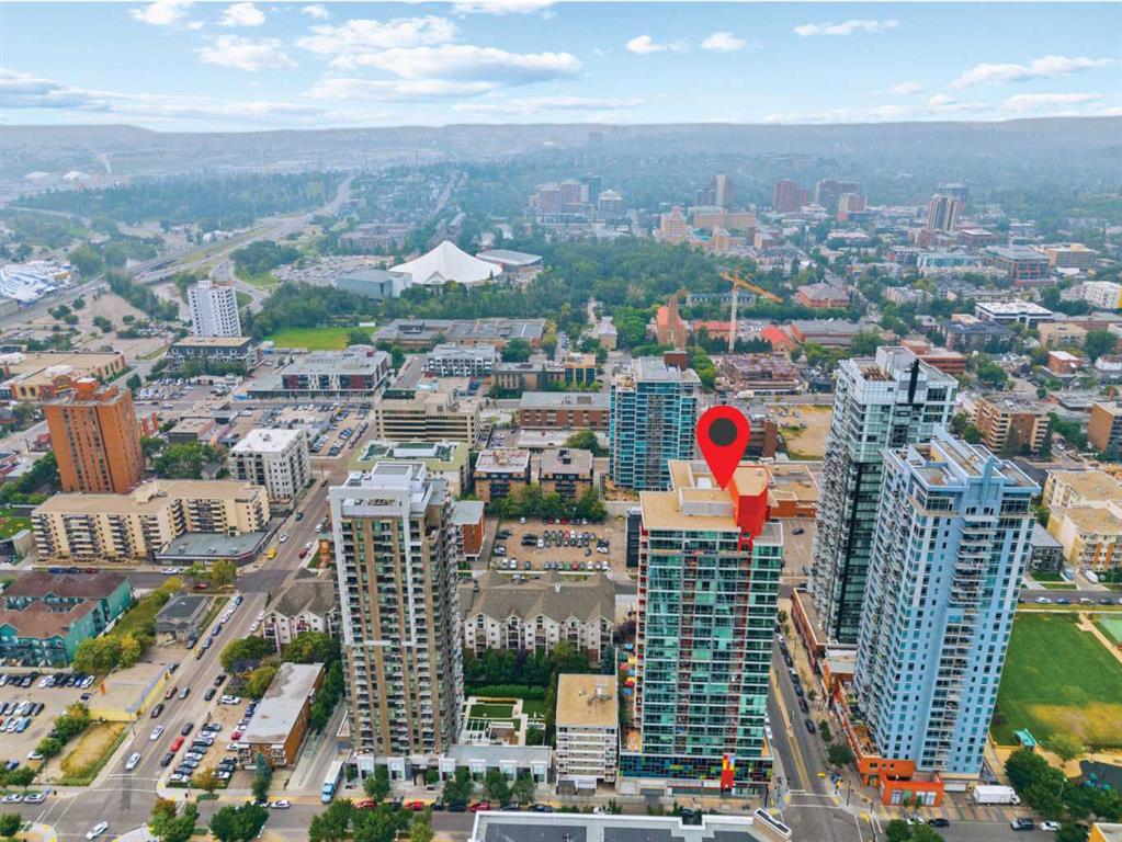 Perched high on the 16th floor of Colours in Calgary’s vibrant Beltline, this stylish end unit offers an urban lifestyle wrapped in unforgettable views. Floor to ceiling windows flood the open layout with natural light while framing iconic cityscapes including the Calgary Tower and Stampede grounds. The modern kitchen blends design with function, featuring stone counters, stainless steel appliances, a peninsula island with seating and direct access to the balcony where summer barbeques can be enjoyed against a skyline backdrop. The dining area is perfectly positioned to take in the twinkling lights of downtown while the adjacent living room provides a relaxing retreat with ever-changing vistas. A private bedroom pairs with a 4-piece bathroom finished with stone counters and in-suite laundry adds everyday convenience. Polished concrete floors, central air conditioning and secure heated underground parking enhance comfort and style. From your balcony, watch fireworks light up the sky and soak in Calgary’s energy from a personal vantage point. Outside the building’s door, discover one of the city’s most dynamic neighbourhoods with premier dining, pubs, coffee shops and shopping steps away, along with Central Memorial Park, Haultain Park tennis courts, the Stampede grounds and the nightlife of 17th Avenue. With pet-friendly and short-term rental friendly policies upon board approval, Colours is a community that embraces flexibility. This residence balances design, comfort and location, offering a truly connected downtown lifestyle!