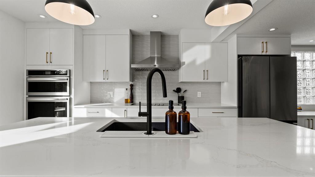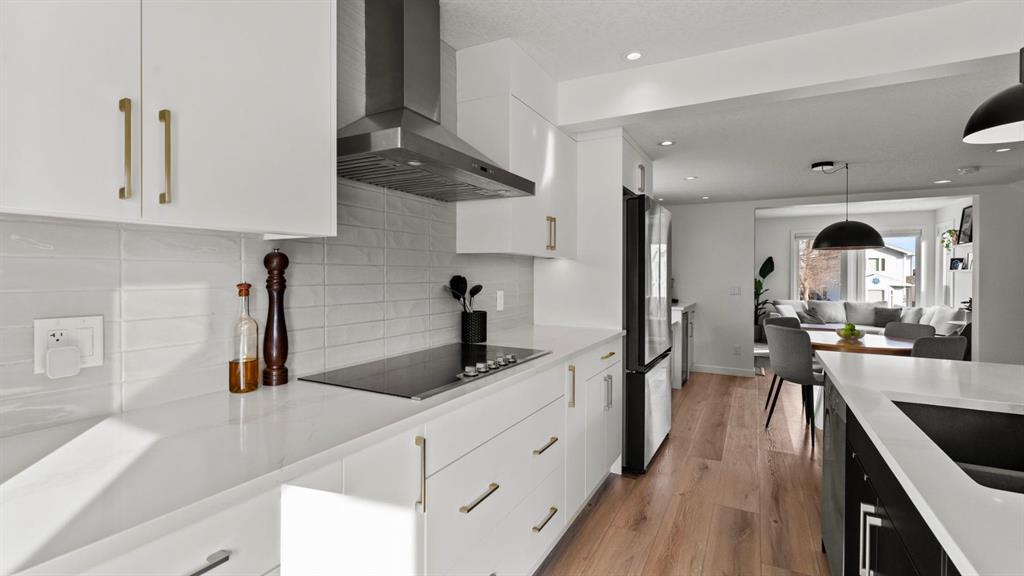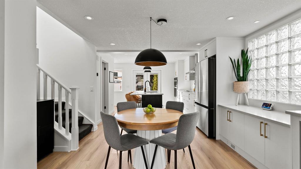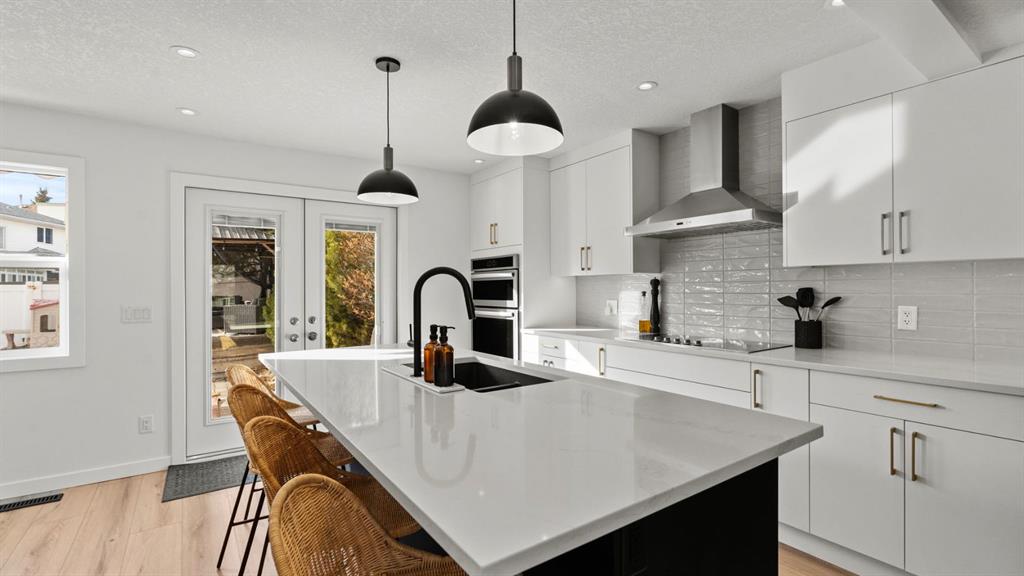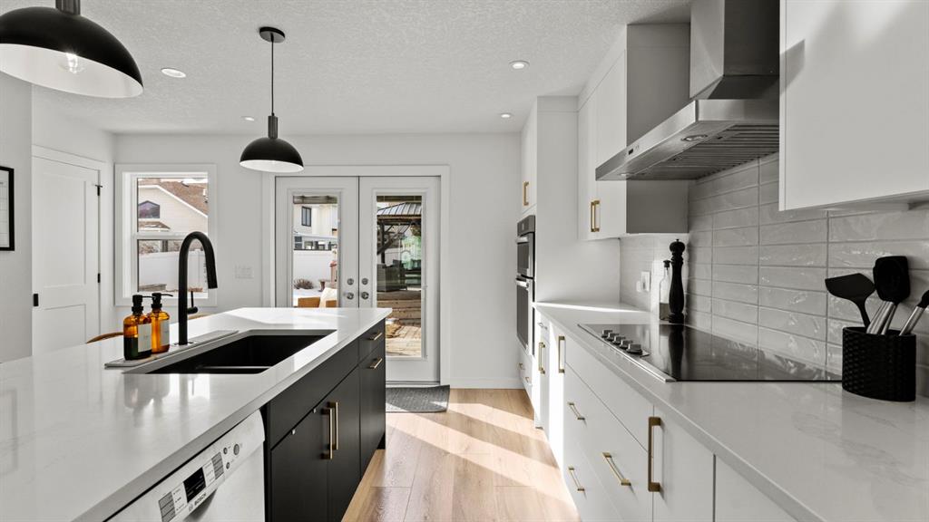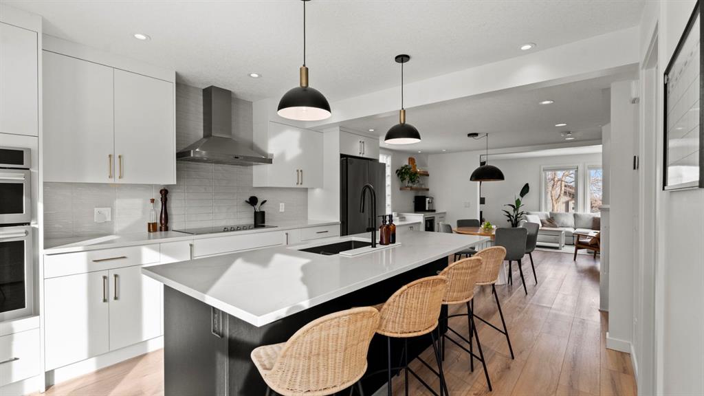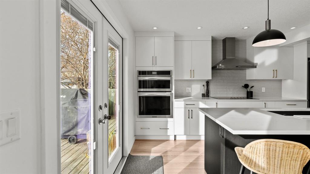 The main floor has been fully renovated and showcases a bright, modern open-concept layout ideal for both everyday living and entertaining. Wide-plank flooring, recessed lighting, and large windows create a warm and welcoming atmosphere throughout. The living room flows seamlessly into the stunning kitchen, where crisp white cabinetry, quartz countertops, contrasting dark accents, and a large centre island with seating take centre stage. High-end stainless steel appliances include an induction cooktop, built-in wall ovens, and a statement range hood, while stylish pendant lighting and a sleek tile backsplash complete the space. The adjacent dining area offers direct access to the west-facing backyard, perfect for enjoying afternoon sun and evening sunsets. A convenient powder room completes the main level.