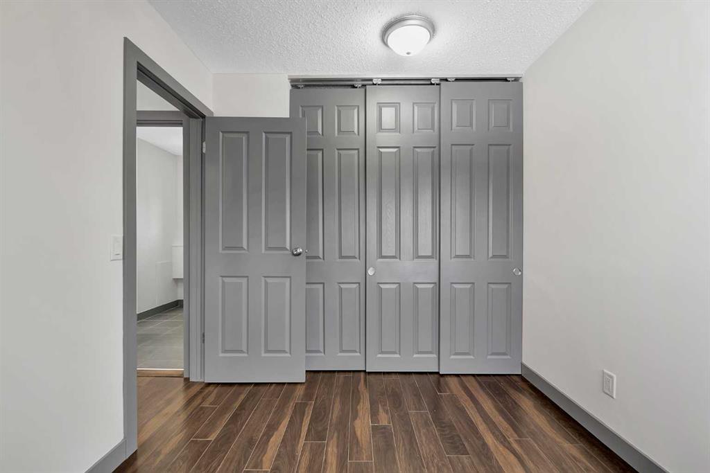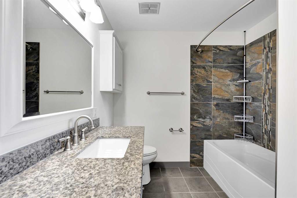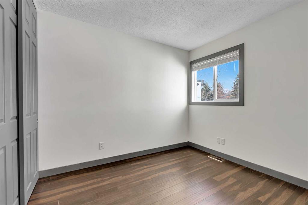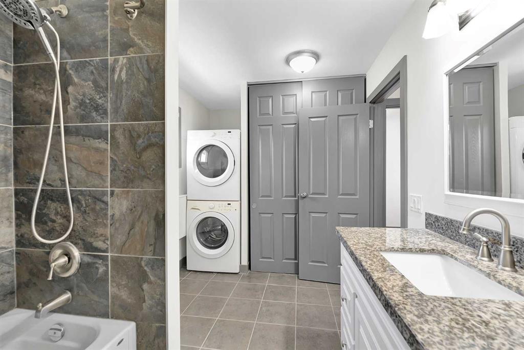 Updated stair rails lead to the upper level, where you’ll find two generous bedrooms, both featuring custom built-in closet systems. The renovated bathroom offers a spacious vanity with drawers, medicine cabinet, and a soaker tub. You’ll also appreciate the conveniently located stacked washer and dryer, linen closet, and dedicated hot water tank closet. Durable laminate flooring runs throughout the home for a clean, cohesive look. *
