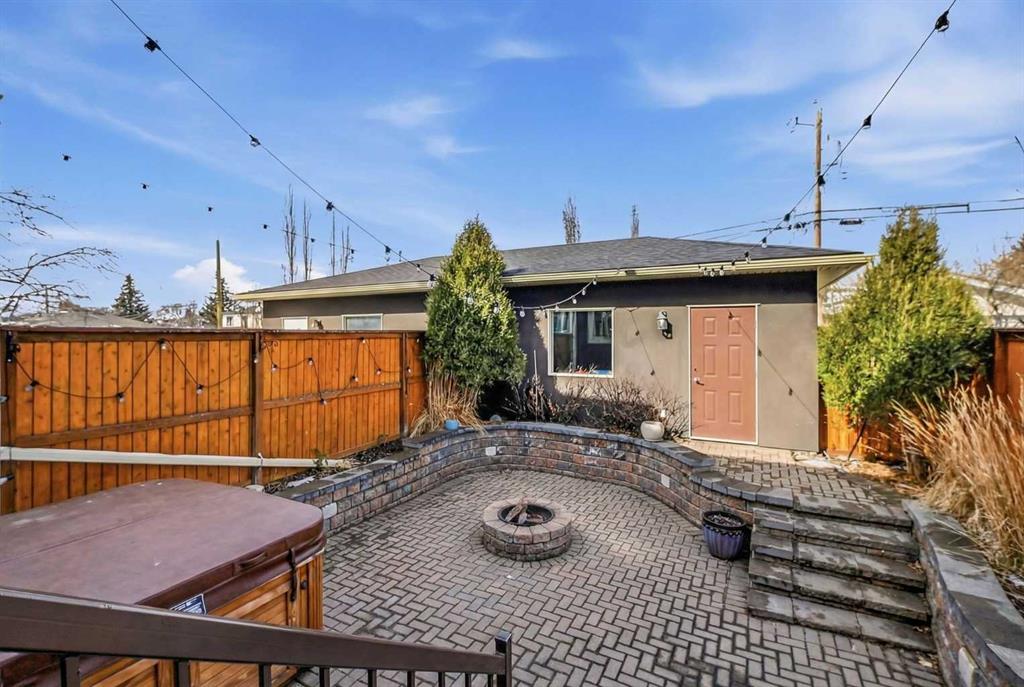 The sunken backyard offers added privacy and is beautifully landscaped with patio pavers, a natural gas fire pit, and a hot tub, creating an ideal outdoor space.