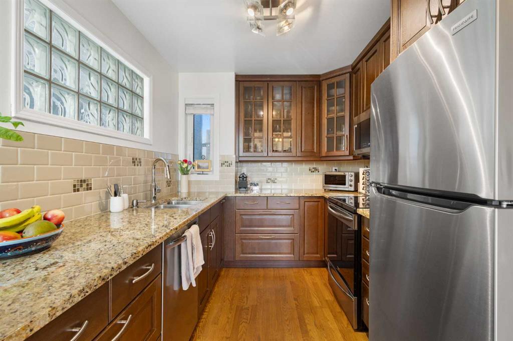 Incredible value at $800,000! This fully developed 2,550+ sq. ft. detached Marda Loop home sits just one block from South Calgary Park’s pool, library, and rinks. Meticulously maintained, it features a new Class 4 roof (2025), triple-pane windows, and a full suite of stainless appliances (2024–25). The light-filled interior shines with solid hardwood, a granite kitchen, and a cozy gas fireplace. Upstairs, the spacious primary suite offers a double closet and a walk-in closet, along with a luxurious 5-piece en-suite with glass shower and free-standing soaker tub. A second large bedroom includes a private 4-piece en-suite and ample closet space. With a separate entry for suite potential (subject to city approval). The fully developed lower level features recently installed vinyl plank flooring throughout and includes a large rec room with bar, bedroom, office, and 3-piece bath. Outdoors, enjoy a south-facing, low-maintenance backyard with a composite deck, aluminum railings, and fenced perimeter providing ample space for play or gardening with an over-height double garage, this is modern living at its finest. Don’t miss out!