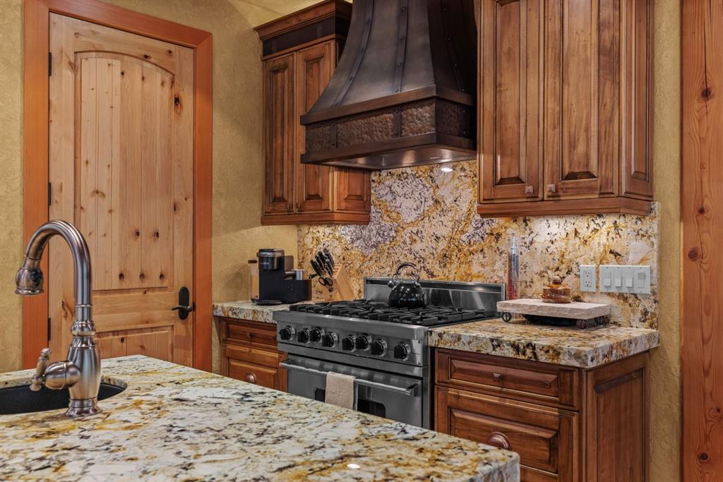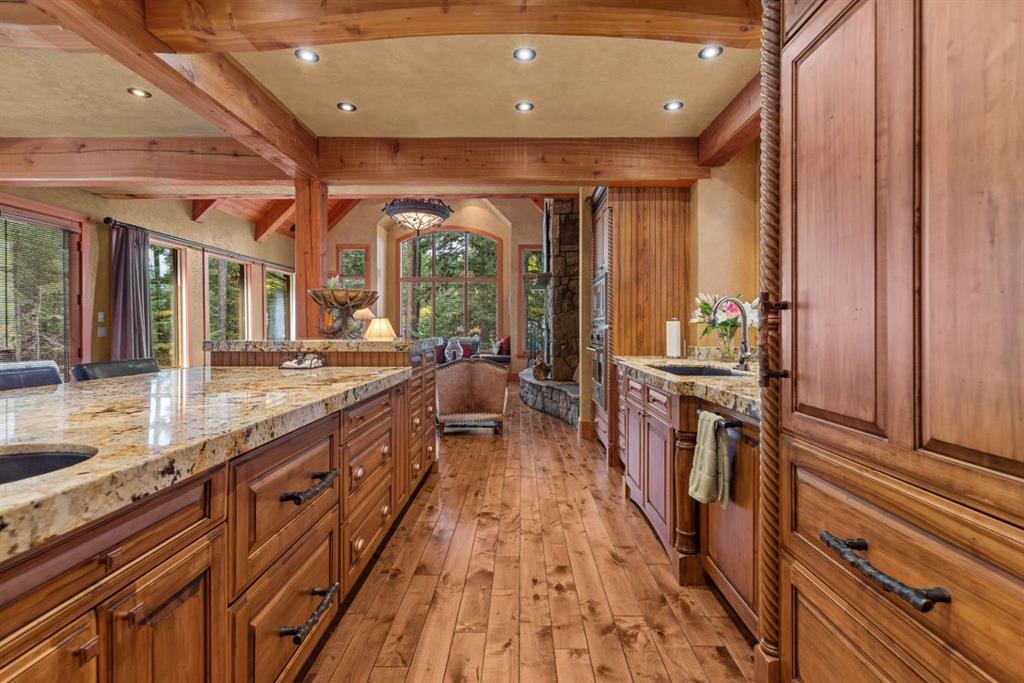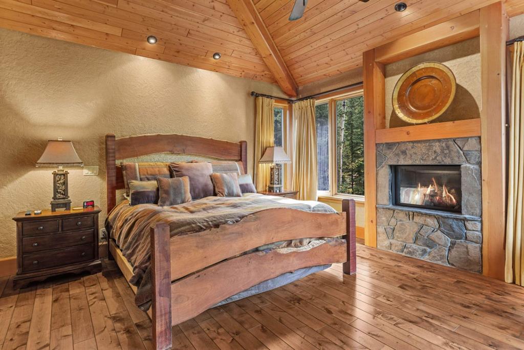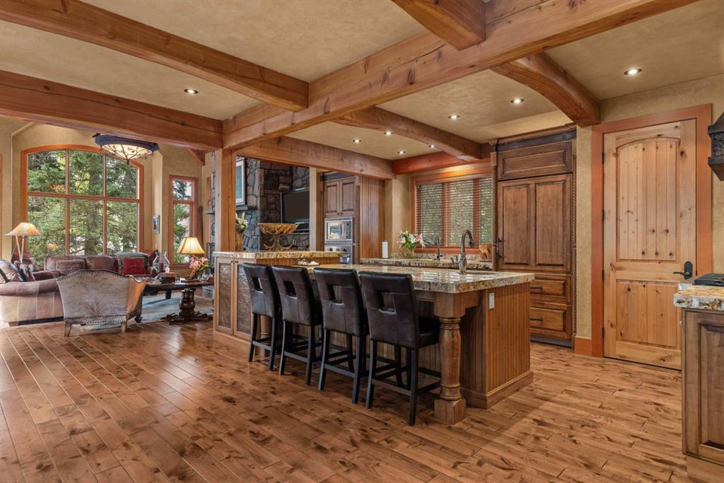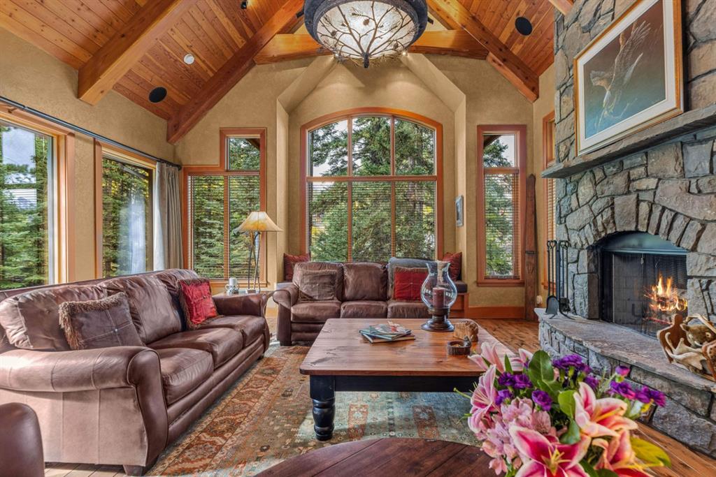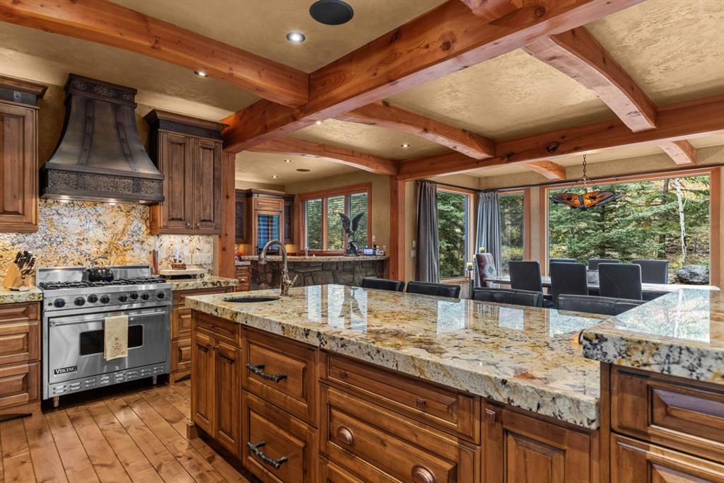 Inside, soaring fir-paneled ceilings and the timeless elegance of Italian plaster set a warm and sophisticated tone throughout. The open-concept layout seamlessly connects the principal living spaces, ideal for both intimate family moments and grand entertaining. The great room is anchored by a striking Rundle stone wood-burning fireplace, creating a natural gathering space that radiates warmth and character. The kitchen pairs custom cabinetry with Sub-Zero and Viking appliances, thoughtfully designed for everyday living and effortless entertaining. The primary suite offers a peaceful retreat with treetop views and a spa-inspired ensuite finished in Marinace granite and travertine, complete with a jetted tub.