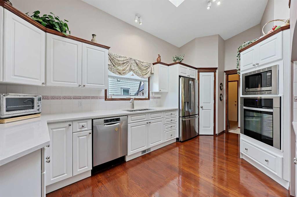 Step inside and be impressed by 14’ ceilings, vaulted family room ceilings, oversized windows, and raised skylight bays that flood the home with natural light. The heart of the home is the chef’s kitchen, featuring timeless raised-panel white cabinetry, white quartz counters, a gas cooktop, built-in wall oven, pantry, overhead skylight bay, and sleek stainless steel appliances. The kitchen flows into the dining room and breakfast nook, opening to the grand family room with soaring ceilings, a three-way fireplace, and expansive views of the private backyard. Gleaming hardwood floors and a flared staircase add a sense of elegance and warmth throughout.