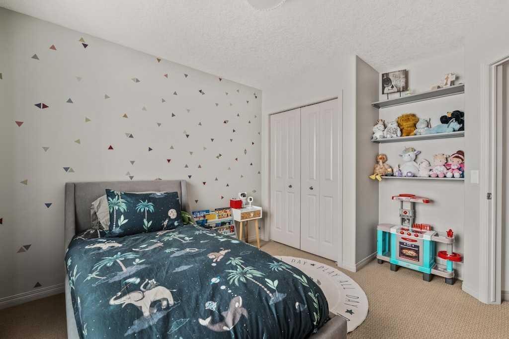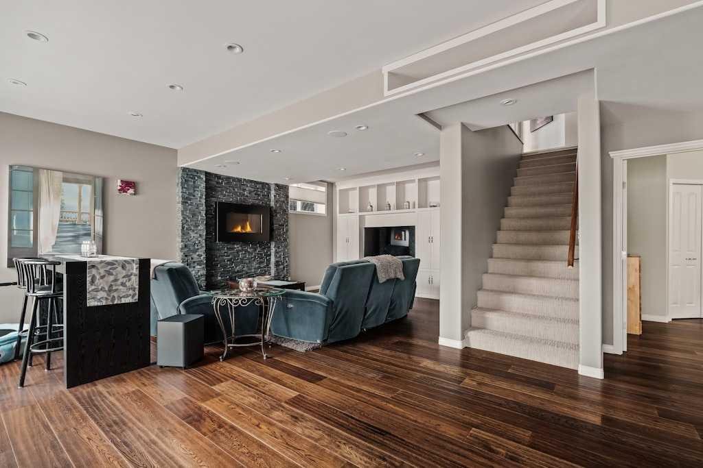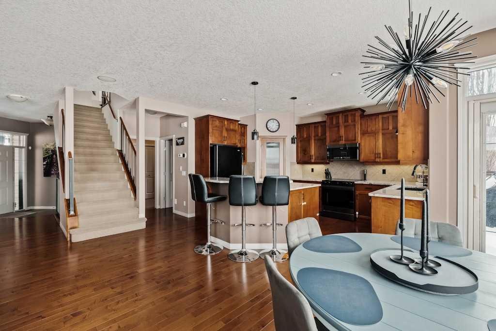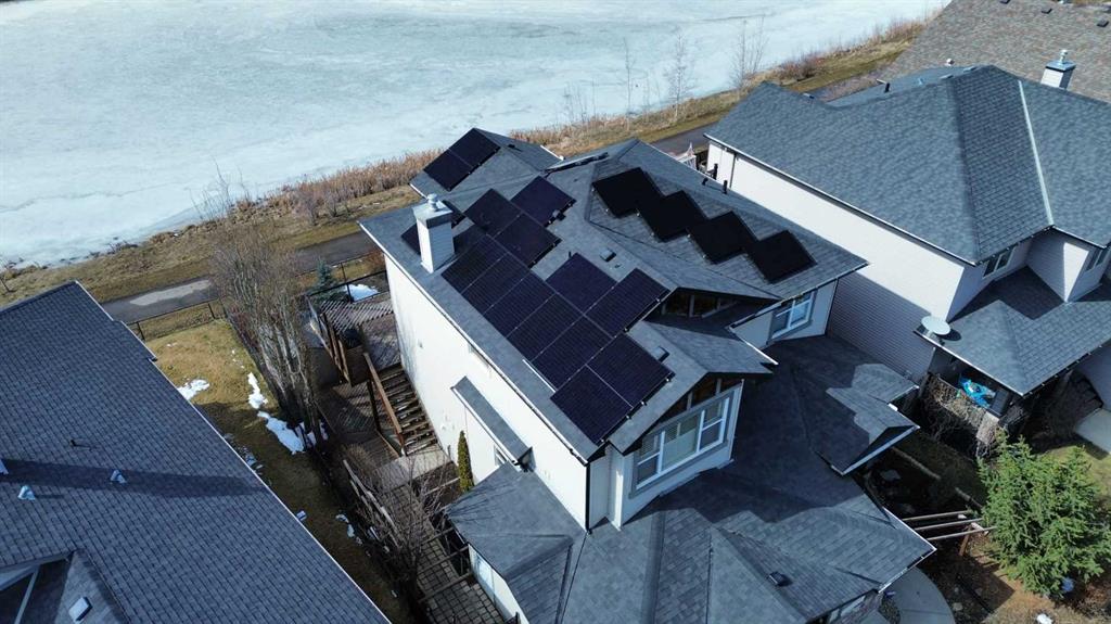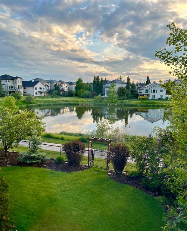 Set on a quiet cul-de-sac and backing onto the walking path surrounding an 8-acre pond, this beautifully appointed two-storey home offers an exceptional setting with peaceful views and a thoughtful layout designed for everyday functionality. The main floor welcomes you with 9′ ceilings, rich hardwood flooring, and a bright open-concept design. At the heart of the home, the kitchen is both stylish and functional, featuring warm cinnamon stained maple cabinetry, granite countertops, black and black stainless steel appliances, a walk-through pantry, and a large island with breakfast bar seating. From there, the space flows effortlessly into the dining area, surrounded by windows and perfectly positioned to take in the views, before opening into the inviting living room where a cozy fireplace adds warmth and a cozy ambiance. Step out from the dining space onto the expansive upper deck, an ideal place to relax, entertain, or simply enjoy the tranquil backdrop. A private office, 2-piece powder room, and laundry room complete the main floor. Upstairs, a spacious family room provides the perfect place to unwind, while a full bathroom and three well-sized bedrooms offer excellent space for family or guests. The primary suite is a true retreat, complete with a large walk-in closet and a beautifully appointed 5-piece ensuite featuring double sinks, a deep soaker tub, and a separate shower. The professionally developed walkout basement extends the home’s living space with an expansive rec room, with space for a home theatre area, wet bar, fourth bedroom, full stylish bath with multi-head shower and in-floor heating, and plenty of storage. From here, step directly outside to the lower deck and beautifully landscaped lush west facing backyard beyond where mature trees, a tiered garden, and a shed create a private and inviting outdoor setting, all backing onto the pathway that winds around the pond. Additional highlights include gemstone lighting at the front and back of the home, a smart underground sprinkler system with Wi-Fi and Bluetooth capability, a fully paid-for solar panel system, and an oversized double attached garage. Surrounded by pathways, ponds, nearby schools, parks, and everyday shopping and services, this is a home that offers both a peaceful setting and exceptional convenience within one of Chestermere’s most established family communities.