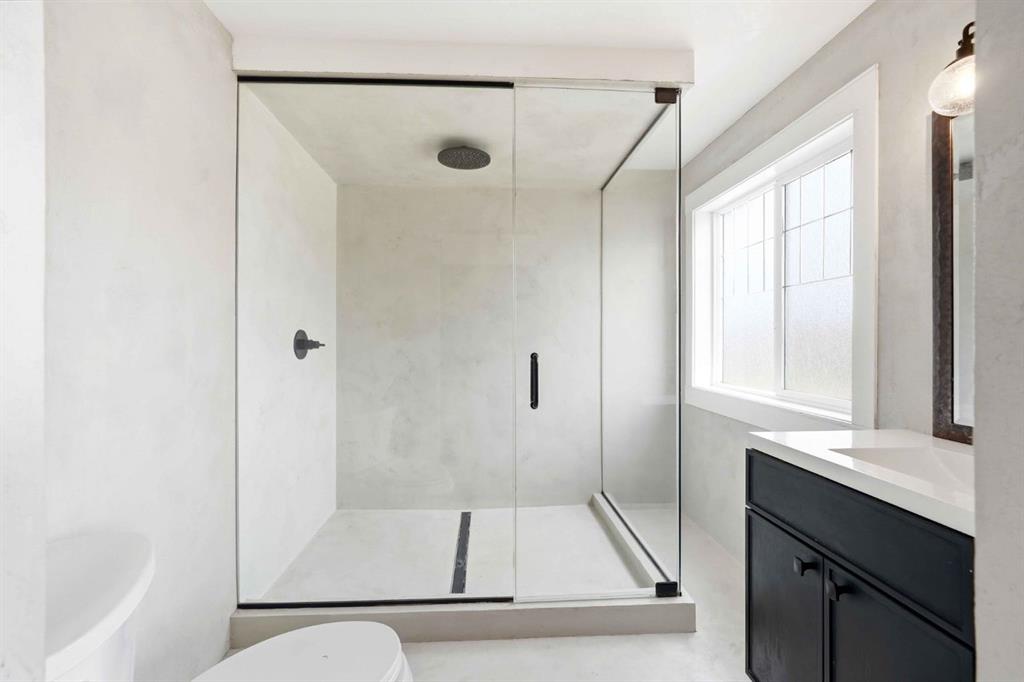 This level offers two generously sized bedrooms and a recently renovated 3-piece bathroom, fully finished in sleek microcement, offering a clean, refined, modern finish.