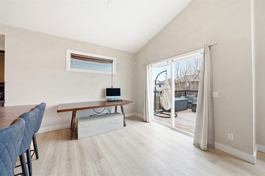 Step inside to a spacious foyer with soaring vaulted ceilings that continue throughout the entire home, creating an airy, open feel paired with luxury vinyl plank flooring completed in recent updates. The main level opens into a bright, open-concept living space designed for both everyday living and entertaining. The recently updated kitchen features a massive microcement countertop and matching backsplash, delivering a seamless modern finish that flows into the south-facing dining area and spacious living room filled with natural light. From the kitchen, step out onto a large elevated deck with stair access to the walk-out basement and backyard, creating an effortless indoor-outdoor lifestyle. The living room is anchored by a striking Venetian plaster feature wall with custom niche, while Venetian plaster detailing continues throughout the main level for a cohesive and elevated design aesthetic.