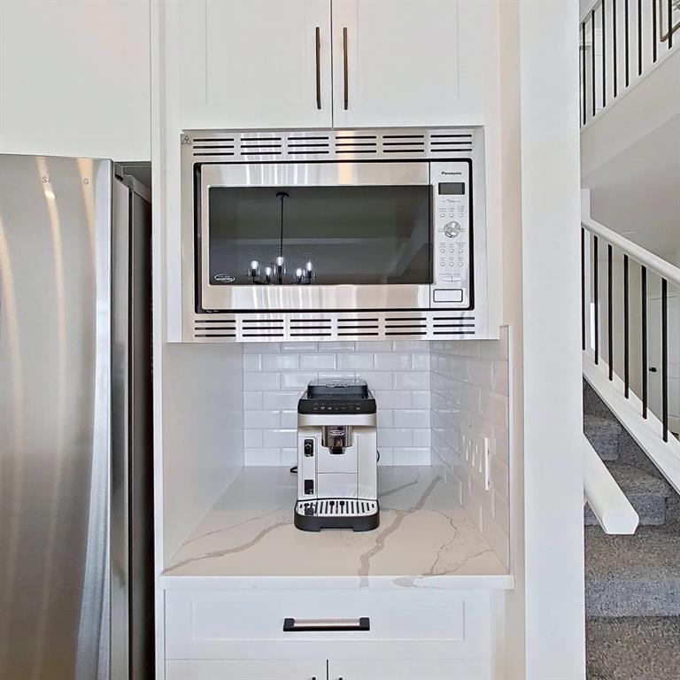 The kitchen is thoughtfully designed, featuring a SILGRANITE undermount sink, GAS stove, built-in microwave, chimney hood fan, 2 TONE cabinetry and elegant GLASS upper cabinets. You’ll love the abundance of storage, including pot and pan drawers and a large recycling pullout integrated into the island.