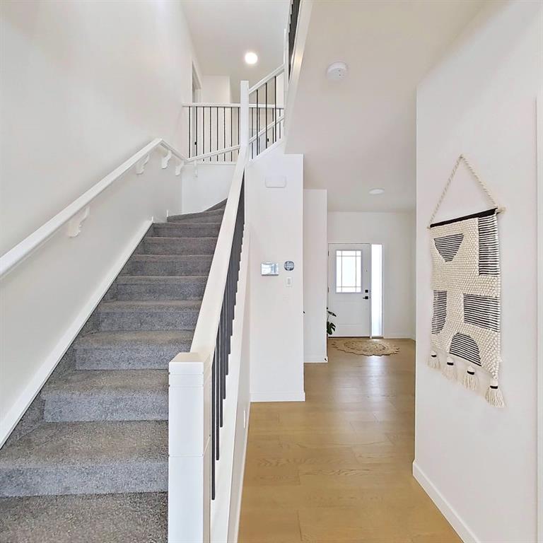 Inside, the home is finished with upgraded window coverings, including remote-controlled blinds in the dining and living rooms. TRENDY HARDWOOD flooring extends throughout the main floor (with tile in the mudroom) and into the den, replacing standard carpet for a more elevated feel. Check out the floor to ceiling TILED Fireplace as well as the black METAL SPINDLE railings on your way upstairs.