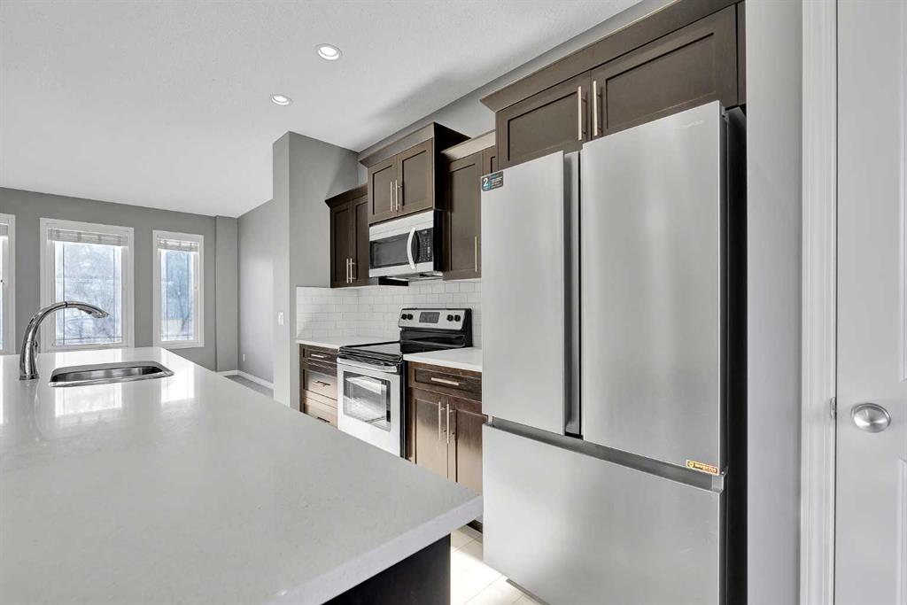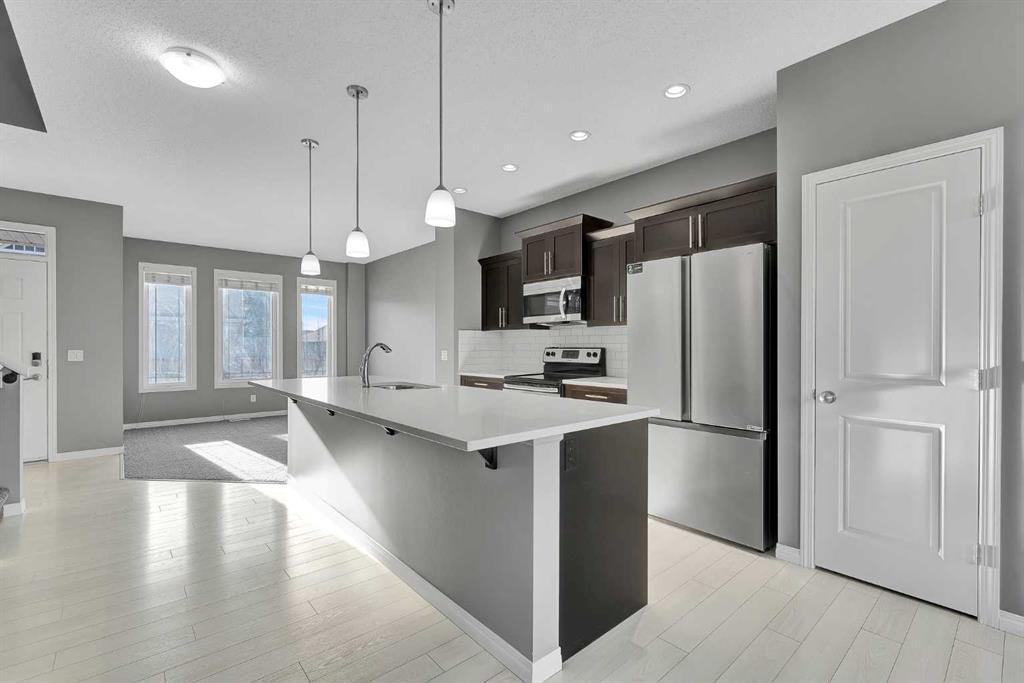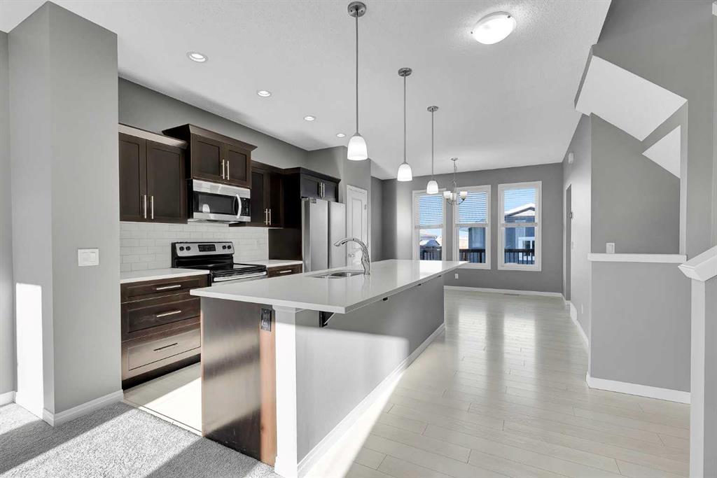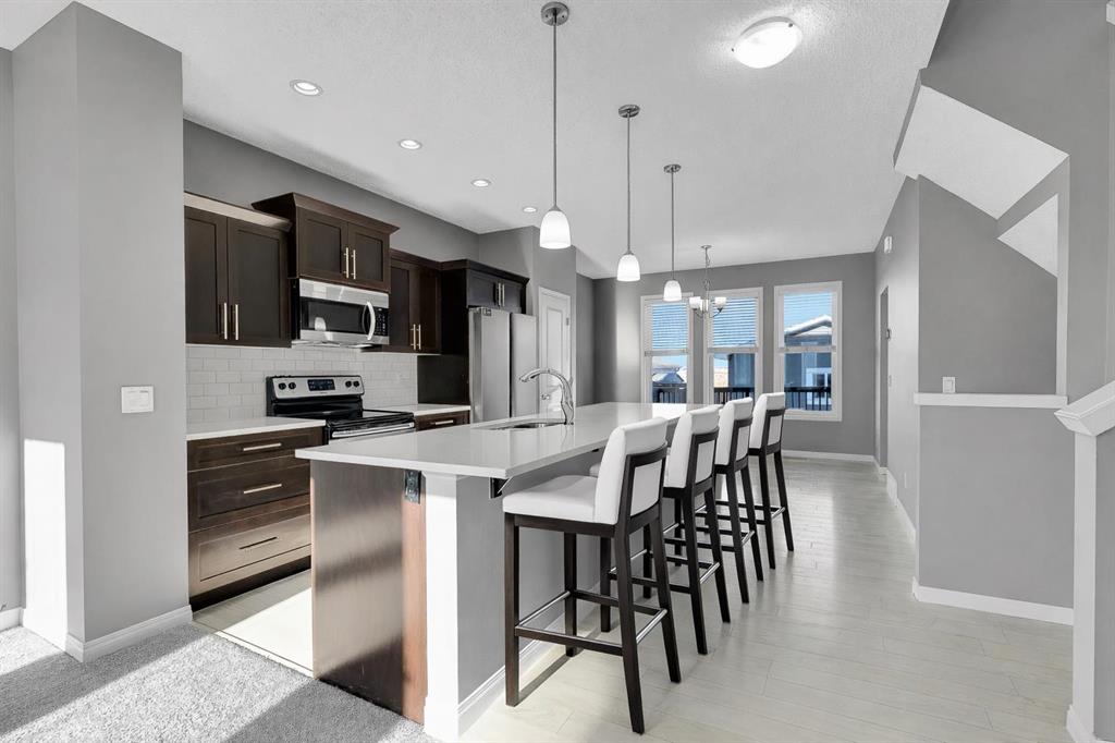 **Open House: 1 -4 pm, Sun, Jan 25**. Modern upgrades and bright, functional living come together in this fully finished and MOVE-IN READY 2-storey detached home in the award-winning lake community of Mahogany. Offers 3+1 bedrooms, 3.5 bathrooms, a double detached garage, a fully developed basement and fresh paint throughout. Central A/C for those hot summer days. Quick possession available! The open-concept main floor is warm and welcoming, featuring a sun filled-living room with brand new carpet. a well-appointed central kitchen with a large quartz island, ample cabinetry, generous counter space, and SS appliances including a brand new fridge. Spacious dining area opens directly onto a huge 12×20 deck—perfect for summer BBQs, outdoor dining, or relaxing evenings in the private and fenced backyard (no neighbours behind). A convenient 2-pc bathroom completes the main level. Upstairs, the primary bedroom offers a private retreat with a walk-in closet and 4-piece ensuite, and a sunny balcony is great for morning coffee or reading a book. Complemented by 2 additional bedrooms and another full bath on this level. The fully developed basement adds excellent versatility with a large family/rec room, a 4th bedroom, and a 4pc bath—ideal for guests or a home office. Lots of storage space in the mechanical room and under the stairs. Outside, the backyard leads to the double detached garage, providing both parking and extra storage. Ideally located with easy access to Mahogany’s lake and beaches, residents enjoy amazing four-season amenities, plus access to nearby schools, parks, playgrounds, scenic pathways, and quick access to Mahogany Village Market, shopping, restaurants, transit, and major roadways. An outstanding opportunity to enjoy lake living at its best!