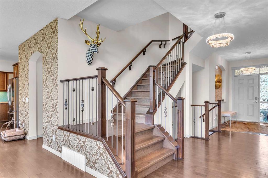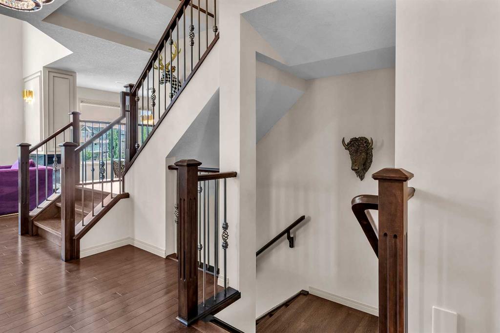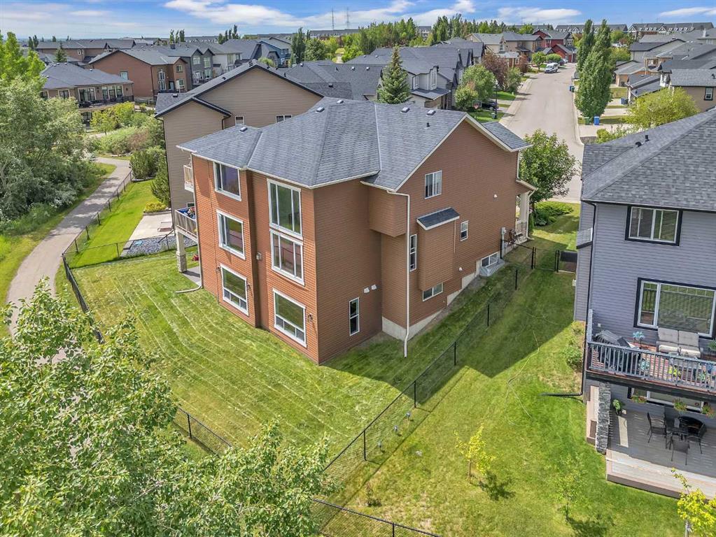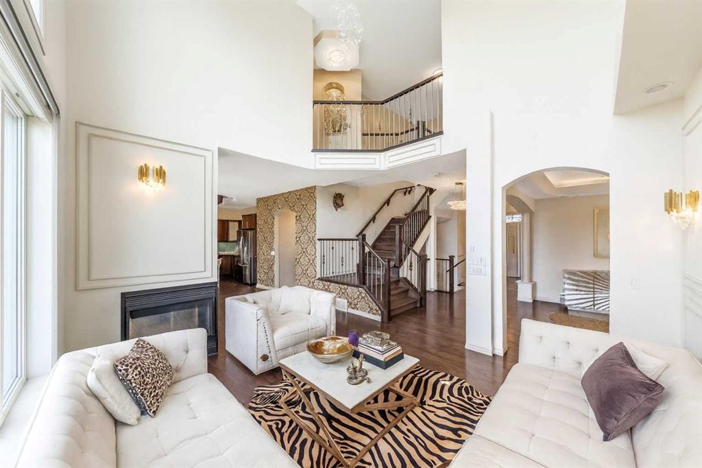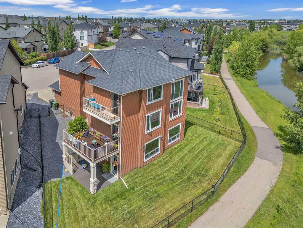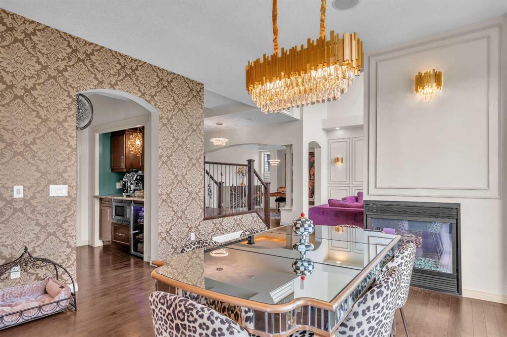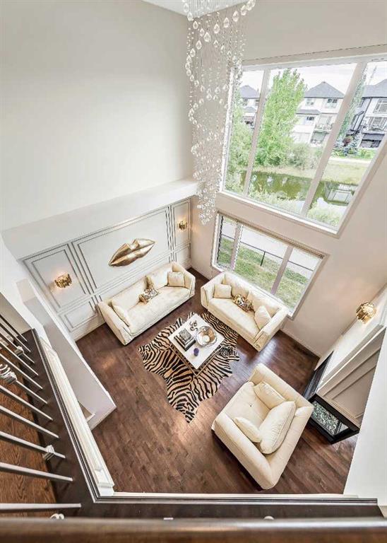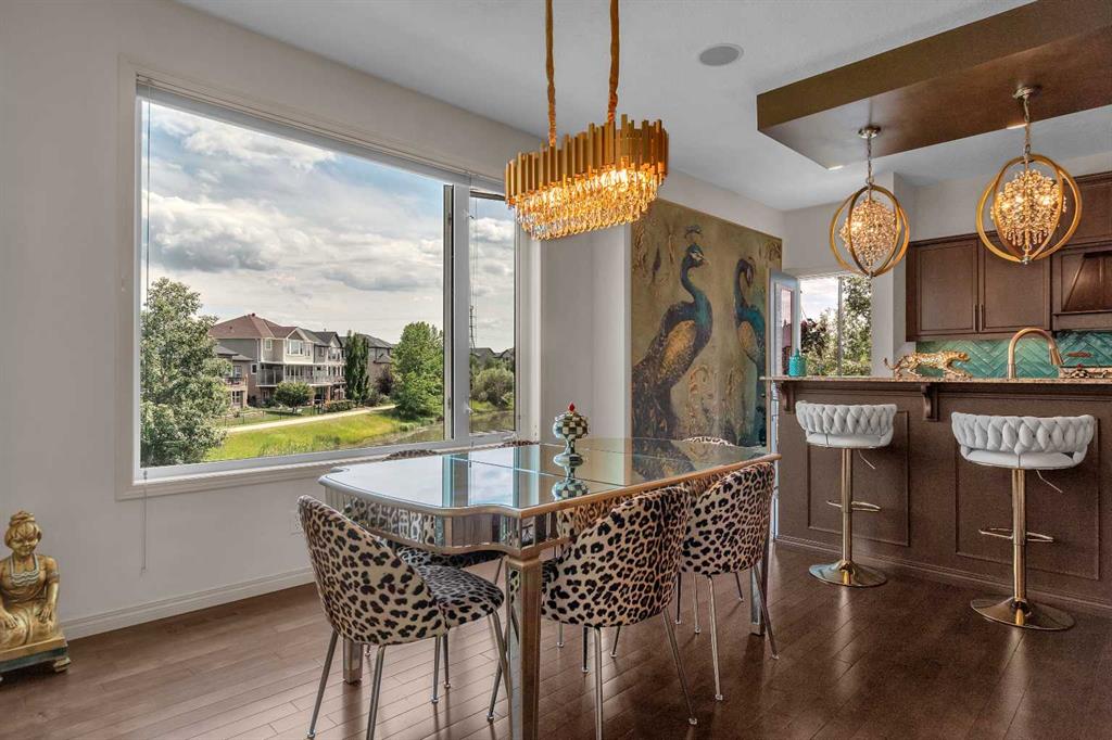 This STUNNING walkout onto Rainbow Falls pond is a must see! Featuring 5 bedrooms, theatre room, and panoramic water views, at 3850 sq.ft of space, this executive home blends size, style, and serenity in one of Chestermere’s most sought-after communities. Step inside to a bright and open main level with soaring ceilings, expansive windows framing the water, and a chef-inspired kitchen with granite counters, rich cabinetry, and a large centre island—perfect for family living and entertaining. The living room is anchored by a cozy fireplace, while the dining area opens to a deck overlooking the pond, creating an effortless indoor-outdoor flow. A second formal dining room, front office and sleek butler’s pantry round out the main floor. Upstairs, the spacious primary suite offers breathtaking views, a spa-like ensuite, and a generous walk-in closet, complemented by two additional bedrooms, full bath and incredible media bonus room. The walkout lower level is fully finished with spacious rec room with fireplace, wet bar, two additional bedrooms and full bathroom. Outside, the landscaped yard and covered patio invite year-round enjoyment of the peaceful waterfront setting. New items as of 2022 are Hot Water Tank, Thermadore Gas Stove, Microwave, Washer, Dryer, Bar Fridge, Dishwasher, basement fridge and microwave. With its refined updates, theatre and entertainment spaces, in-floor heated basement, and unbeatable location, this property delivers the lifestyle buyers dream about—whether it’s hosting friends, relaxing by the fire, or watching sunsets over the pond.