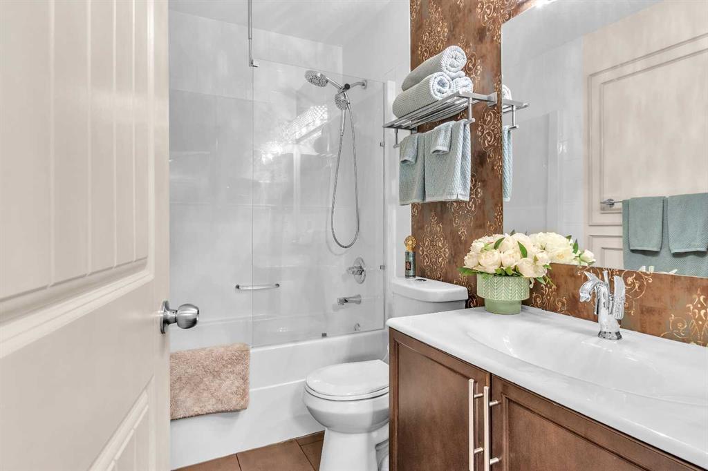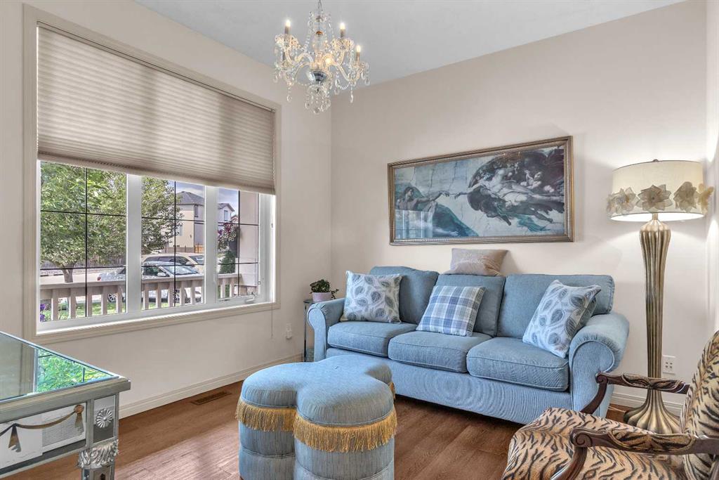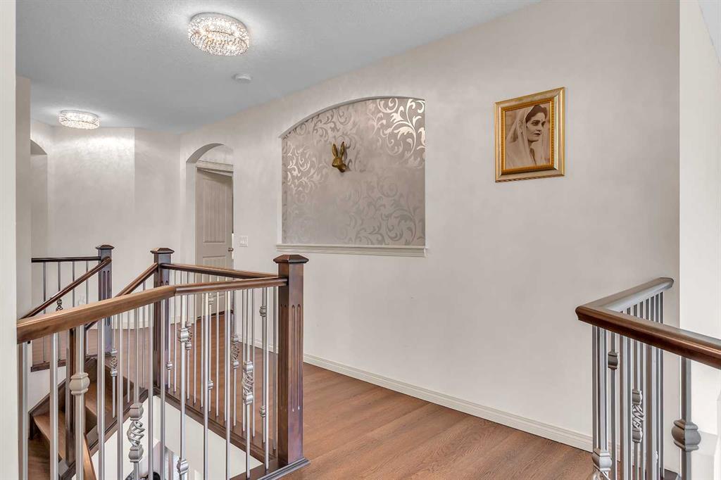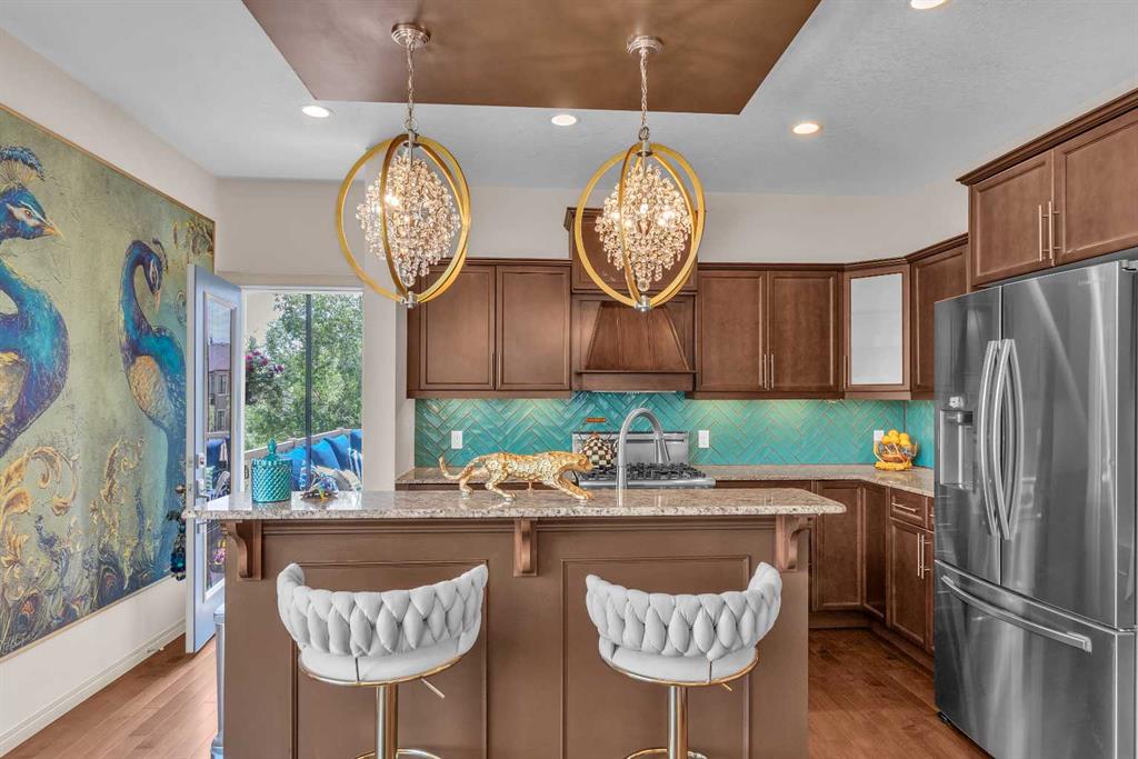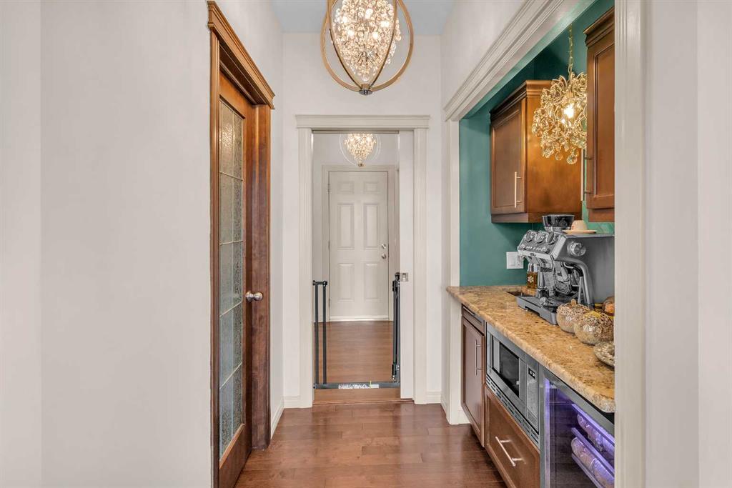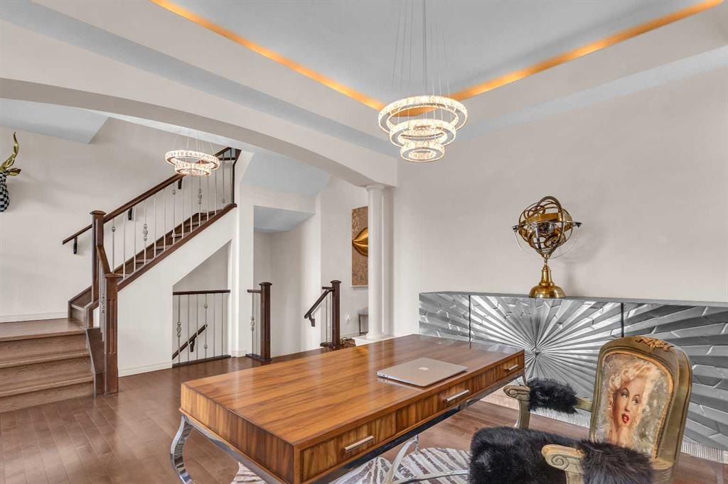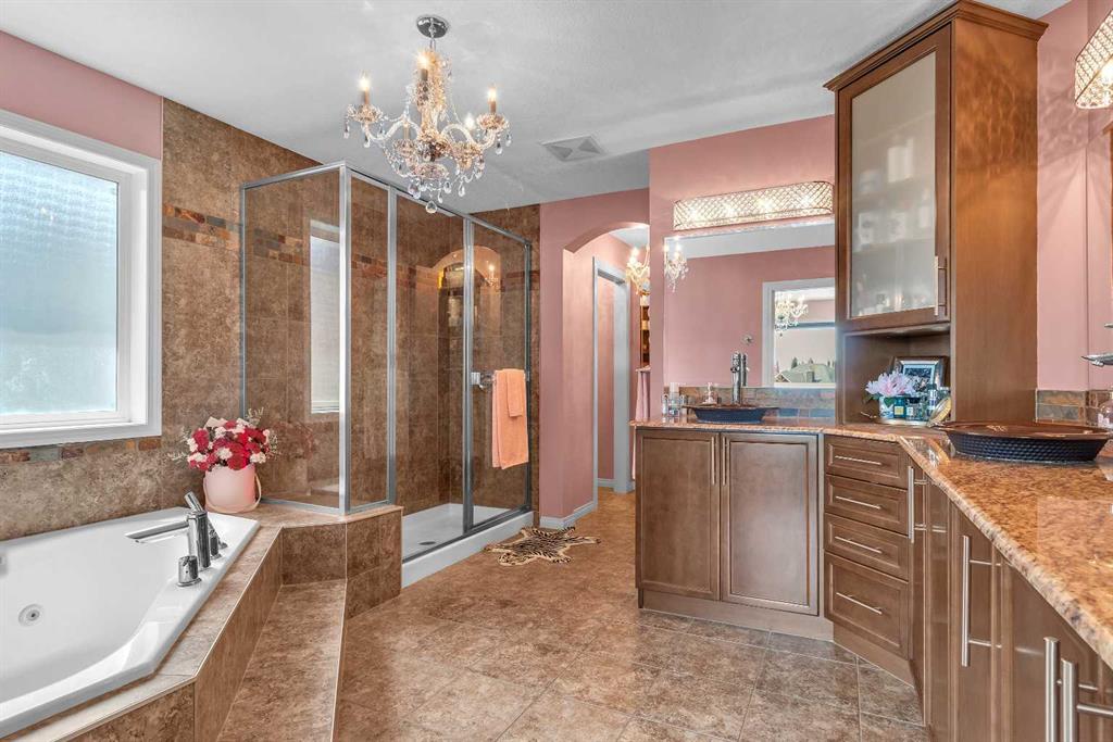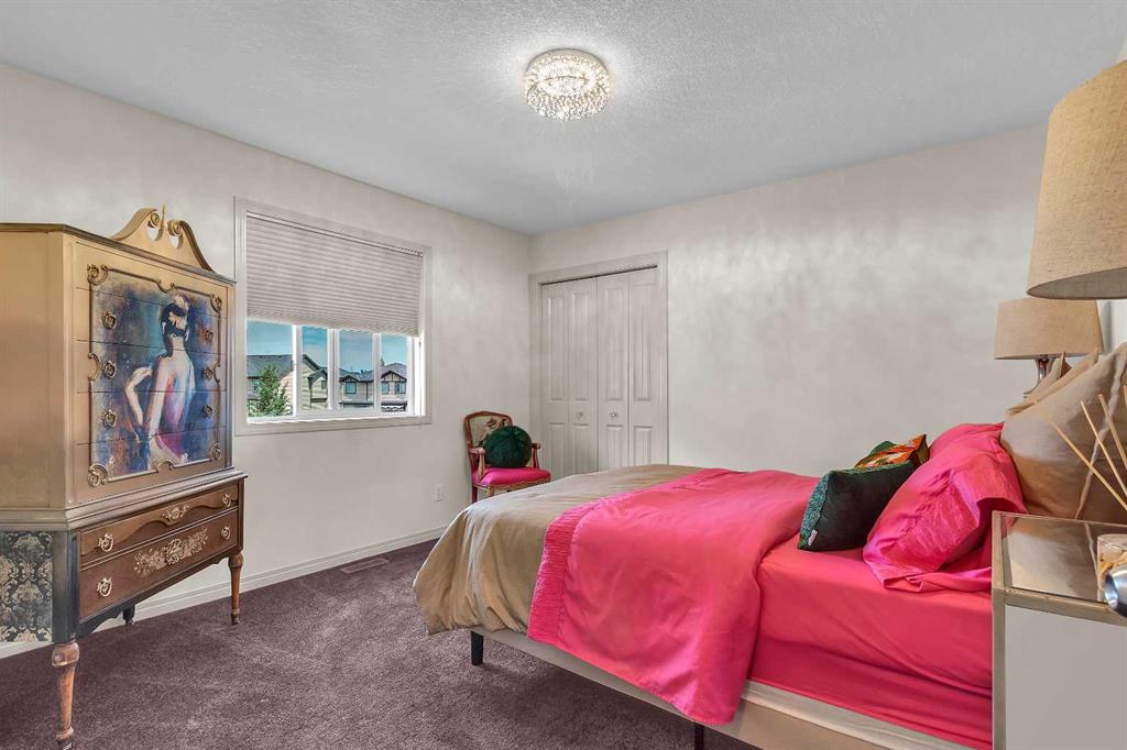 This STUNNING walkout onto Rainbow Falls pond is a must see! Featuring 5 bedrooms, theatre room, and panoramic water views, at 3850 sq.ft of space, this executive home blends size, style, and serenity in one of Chestermere’s most sought-after communities. Step inside to a bright and open main level with soaring ceilings, expansive windows framing the water, and a chef-inspired kitchen with granite counters, rich cabinetry, and a large centre island—perfect for family living and entertaining. The living room is anchored by a cozy fireplace, while the dining area opens to a deck overlooking the pond, creating an effortless indoor-outdoor flow. A second formal dining room, front office and sleek butler’s pantry round out the main floor. Upstairs, the spacious primary suite offers breathtaking views, a spa-like ensuite, and a generous walk-in closet, complemented by two additional bedrooms, full bath and incredible media bonus room. The walkout lower level is fully finished with spacious rec room with fireplace, wet bar, two additional bedrooms and full bathroom. Outside, the landscaped yard and covered patio invite year-round enjoyment of the peaceful waterfront setting. New items as of 2022 are Hot Water Tank, Thermadore Gas Stove, Microwave, Washer, Dryer, Bar Fridge, Dishwasher, basement fridge and microwave. With its refined updates, theatre and entertainment spaces, in-floor heated basement, and unbeatable location, this property delivers the lifestyle buyers dream about—whether it’s hosting friends, relaxing by the fire, or watching sunsets over the pond.