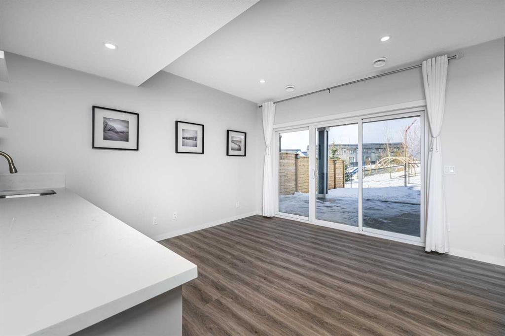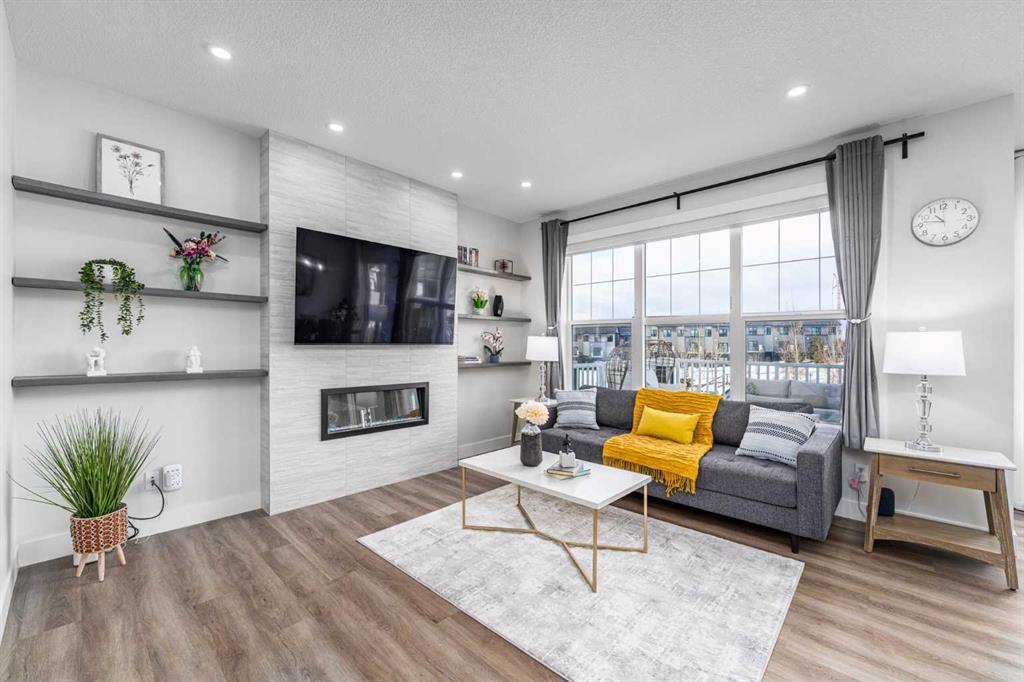 The south-facing living area is filled with natural light and centered around a sleek electric fireplace. The spacious dining room opens onto a large balcony overlooking the mountains, green space, pond, and playground — the perfect spot to enjoy your morning coffee while keeping an eye on the kids playing nearby.