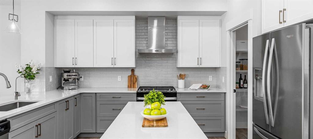 The main floor features a bright and spacious office, perfect for working from home. The modern kitchen is designed for both everyday living and entertaining, featuring a huge island, gas stove, and a large walk-through pantry conveniently connected to the garage.
