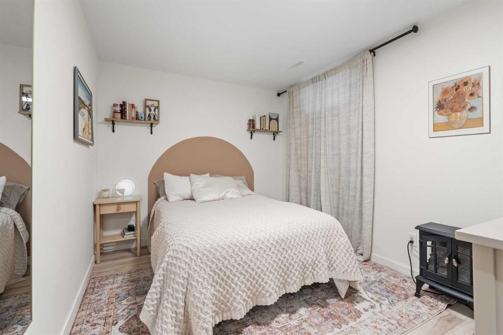 The finished basement adds exceptional living space, featuring a cozy electric fireplace with rock tile surround, a basement bedroom (non-egress window), and ample storage including space under the stairs and additional storage beside the staircase. There is also space for a potential future bathroom.