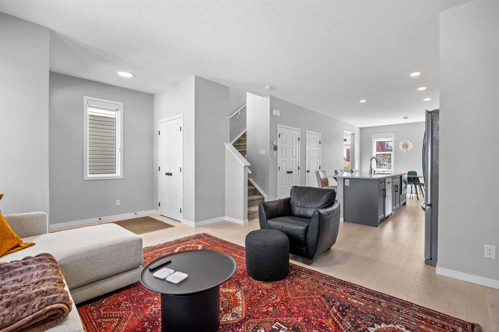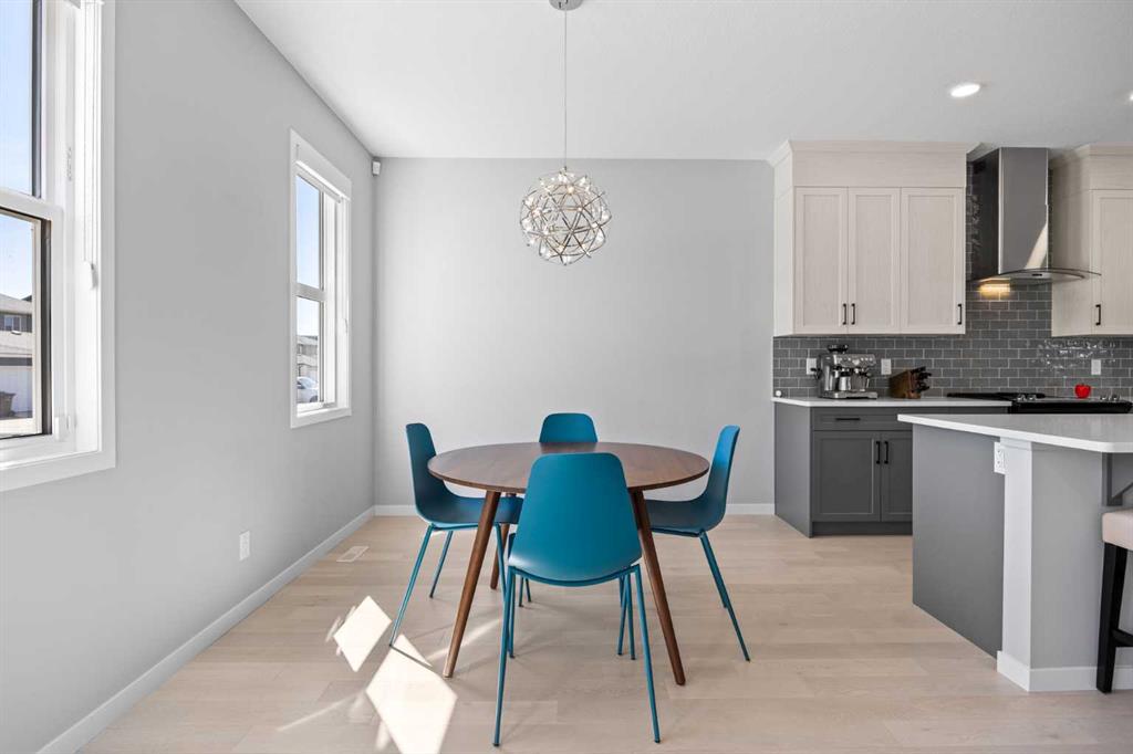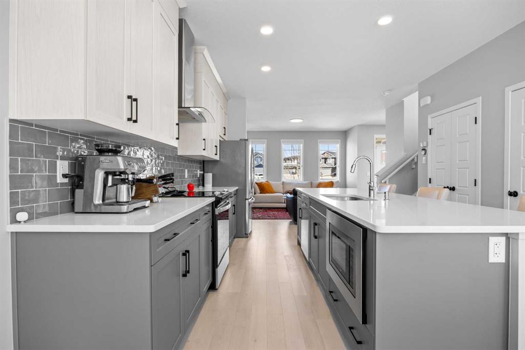 The bright OPEN-CONCEPT MAIN FLOOR features RICH HARDWOOD FLOORING and a thoughtfully designed layout centered around a stunning CHEF-inspired kitchen—complete with QUARTZ countertops, TILE Backsplash, full height white cabinetry, a HUGE modern grey island, STAINLESS STEEL appliances + plenty of workspace. The kitchen flows seamlessly into the spacious living room and SUN-FILLED dining area, creating the perfect setup for both everyday living and entertaining.