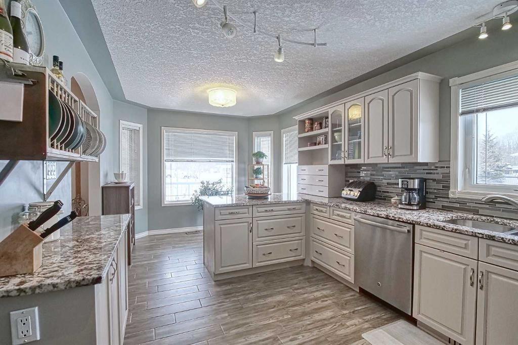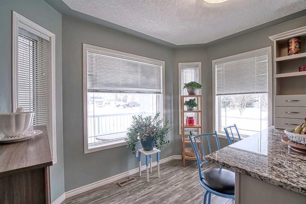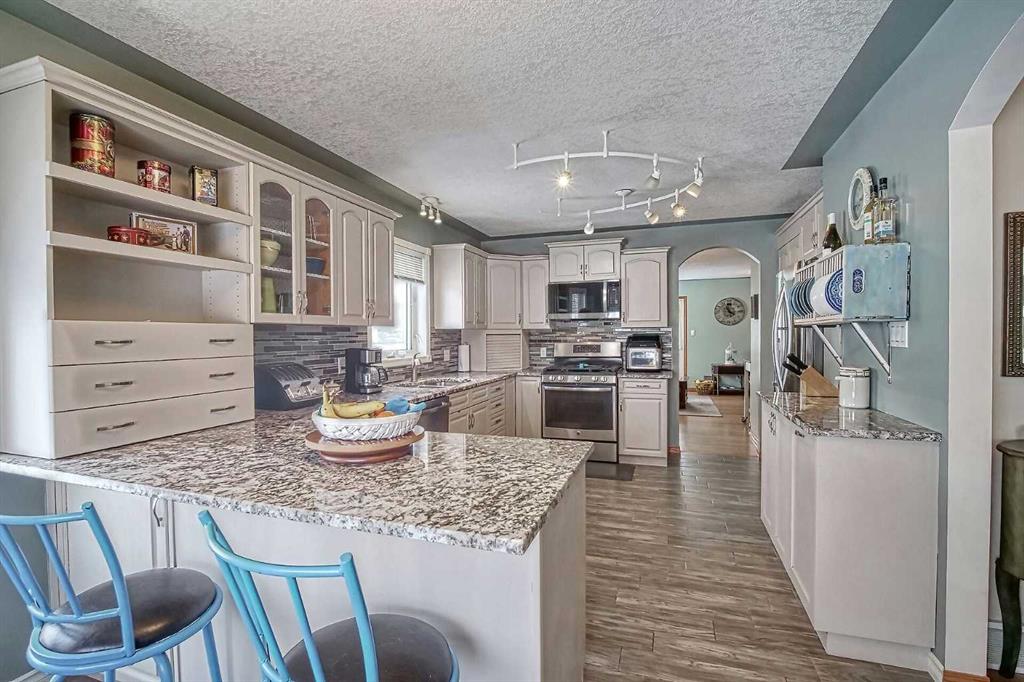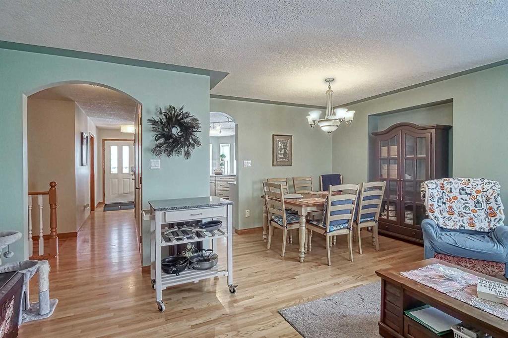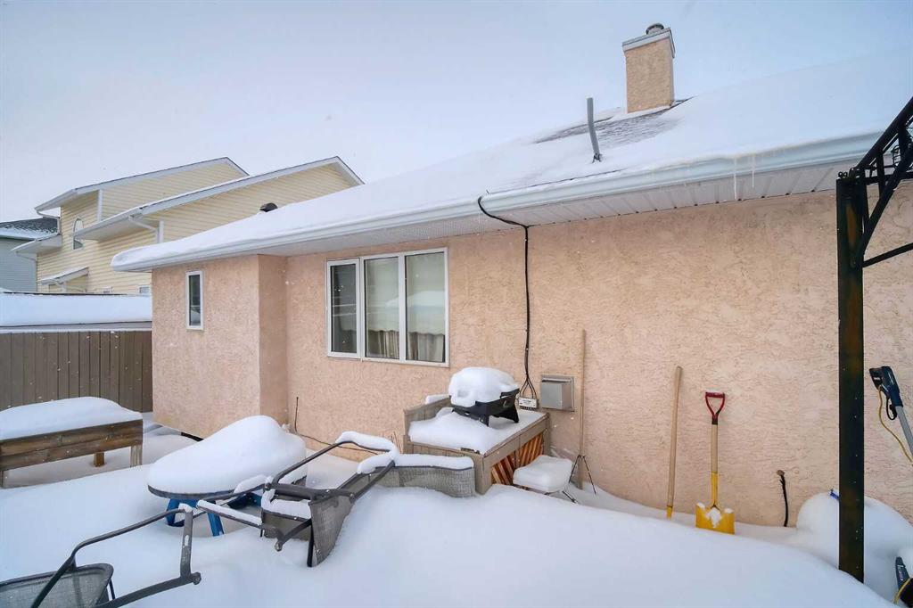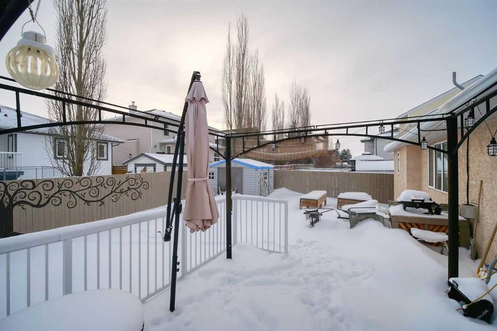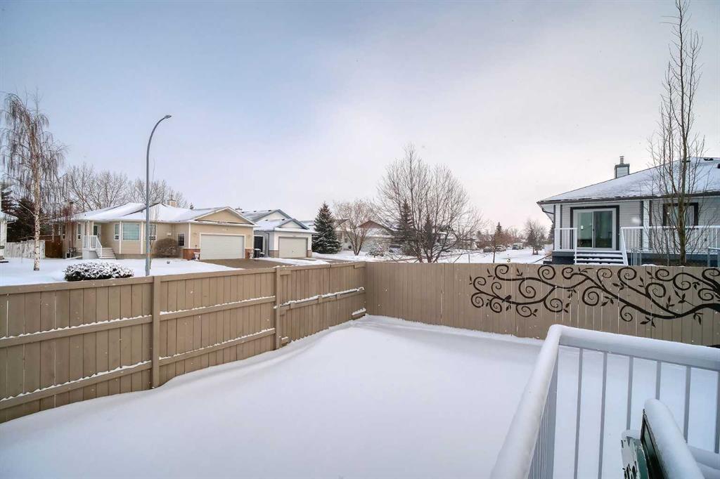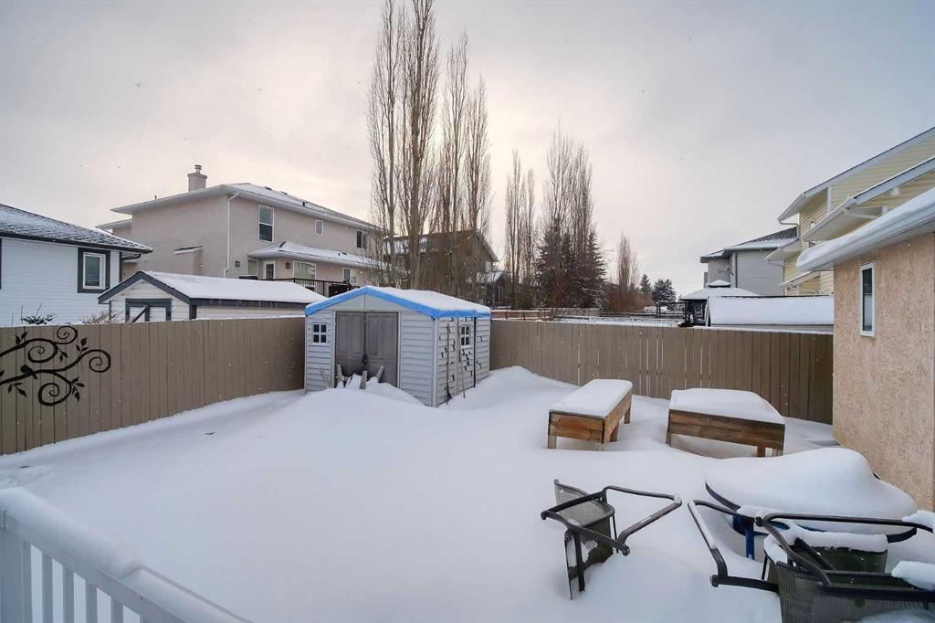 BEAUTIFULLY MAINTAINED BUNGALOW ON A HUGE CORNER LOT IN Crossfield, ideally located near parks and green spaces in a quiet neighbourhood. LOTS OF FRONT PORCH SITTING in this charming 4 bedroom, 3 bath home with a HEATED DOUBLE ATTACHED GARAGE features an updated kitchen with refreshed paint, flooring and lighting, some newer upper cabinetry, GRANITE COUNTERTOPS AND UPGRADED STAINLESS STEEL APPLIANCES INCLUDING A GAS RANGE, plus a two-seat breakfast bar and bright bay window nook for casual dining. The adjoining dining room has space for a large table and hutch and flows seamlessly into the inviting living room with a COZY GAS FIREPLACE. Patio doors lead to the SPACIOUS BACK DECK WITH PERGOLA overlooking the fully fenced yard with plenty of room for kids and pets to run. Down the hall are a 4 piece bathroom, two bedrooms, and a generous primary retreat with a LARGE WALK-IN CLOSET and oversized windows. Hardwood runs throughout the main floor with newer carpet in the bedrooms. There is A MAIN FLOOR LAUNDRY/MUDROOM just as you come in from the heated garage. The fully finished basement includes a LARGE MEDIA/RECREATION ROOM, a fourth bedroom with cheater access to a 4 piece bath (ideal for teens or guests), a flex room with built-in bookcases, a spacious utility area set up as a craft room, and dedicated cold storage. Complete with a newer deck and storage shed, this MOVE-IN READY HOME offers space, comfort, and functionality inside and out.