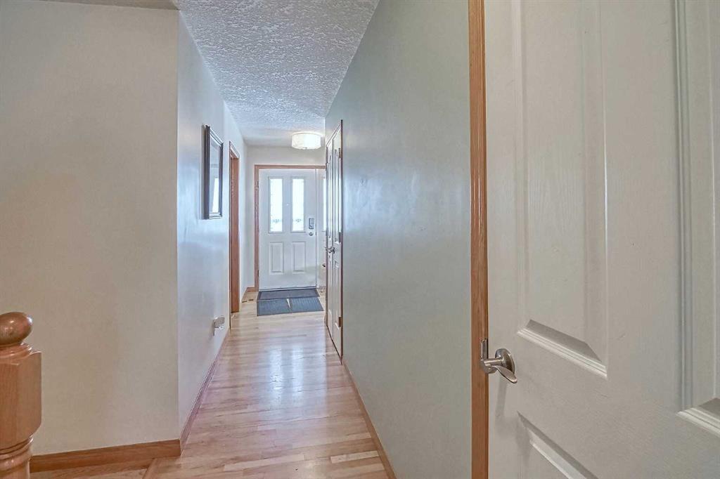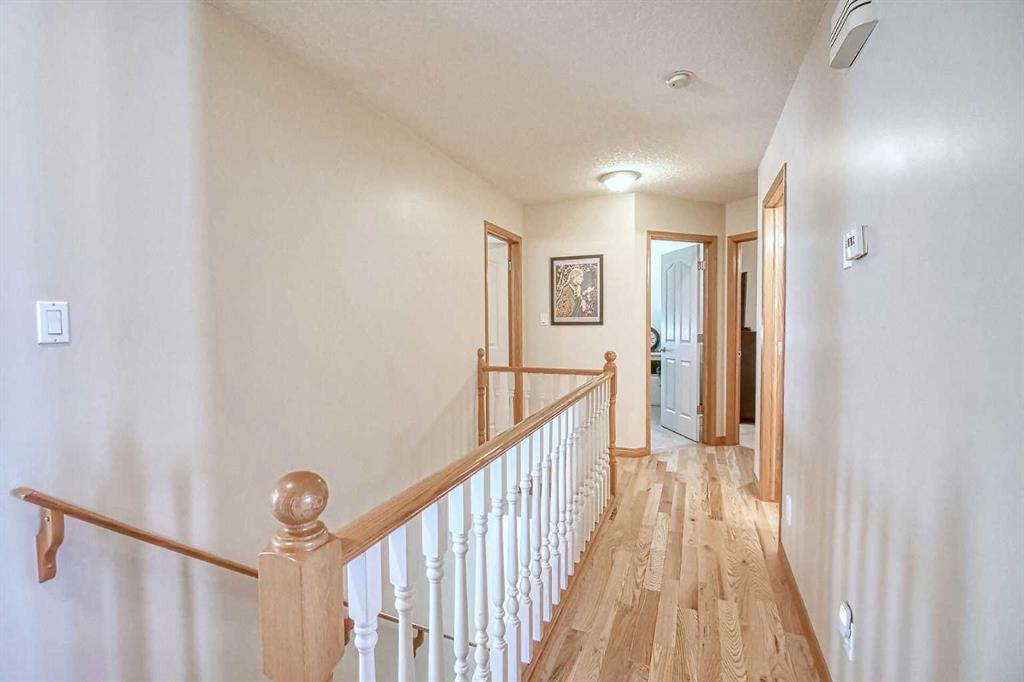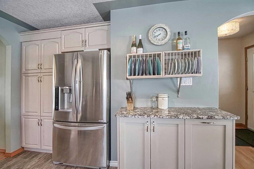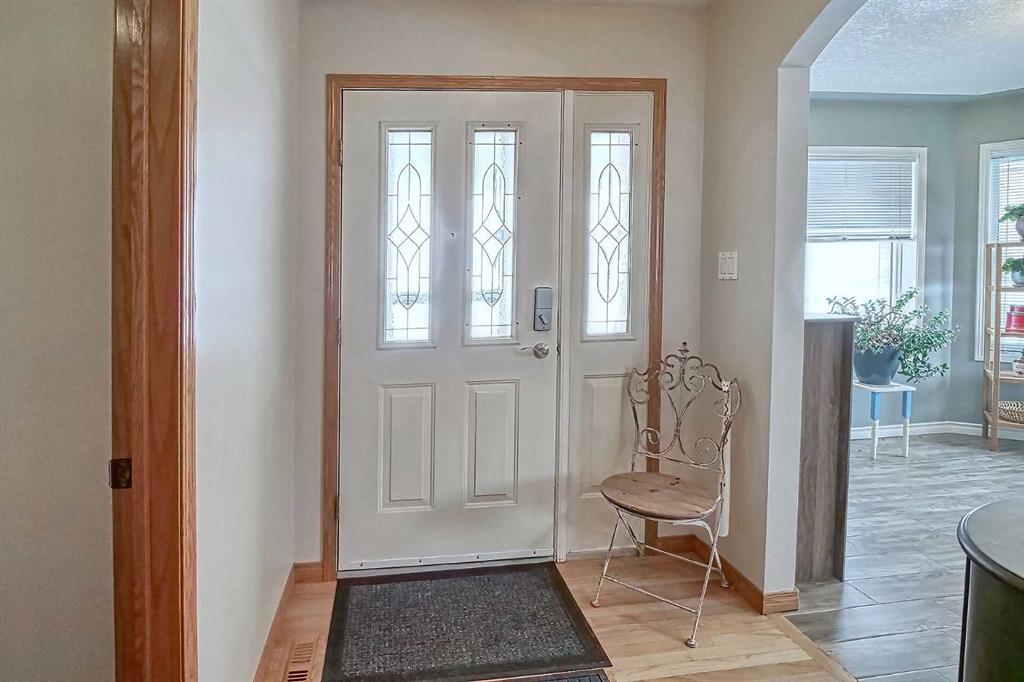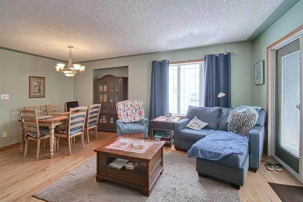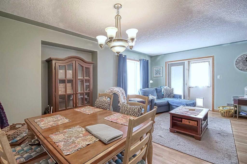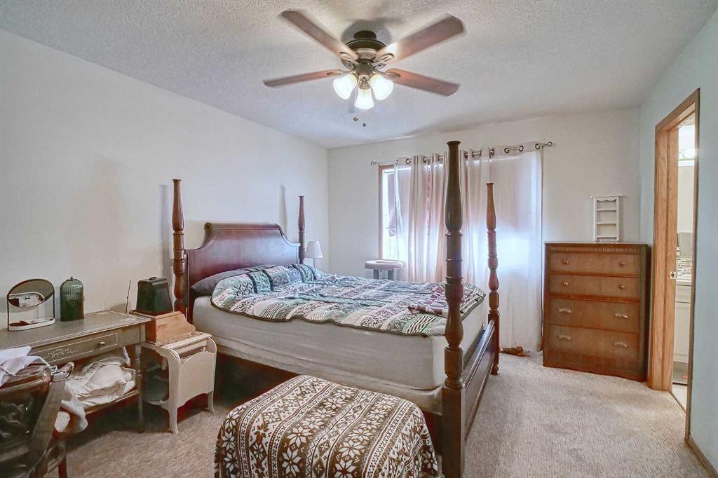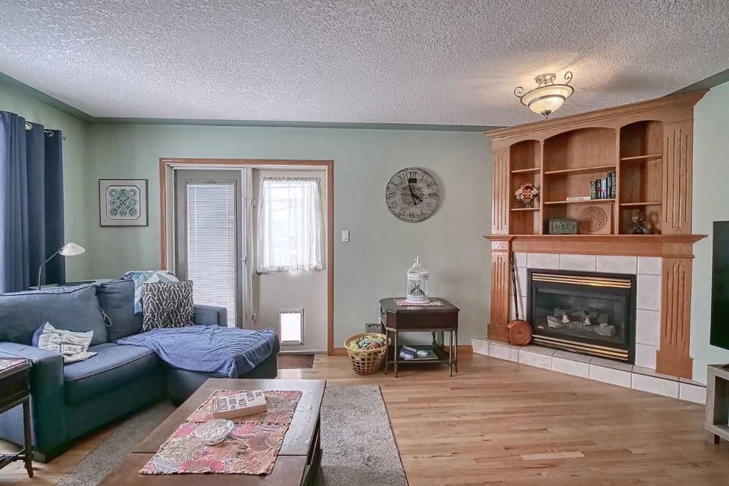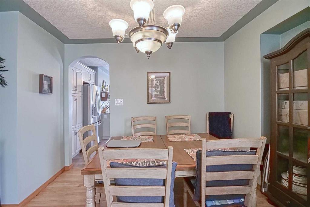 BEAUTIFULLY MAINTAINED BUNGALOW ON A HUGE CORNER LOT IN Crossfield, ideally located near parks and green spaces in a quiet neighbourhood. LOTS OF FRONT PORCH SITTING in this charming 4 bedroom, 3 bath home with a HEATED DOUBLE ATTACHED GARAGE features an updated kitchen with refreshed paint, flooring and lighting, some newer upper cabinetry, GRANITE COUNTERTOPS AND UPGRADED STAINLESS STEEL APPLIANCES INCLUDING A GAS RANGE, plus a two-seat breakfast bar and bright bay window nook for casual dining. The adjoining dining room has space for a large table and hutch and flows seamlessly into the inviting living room with a COZY GAS FIREPLACE. Patio doors lead to the SPACIOUS BACK DECK WITH PERGOLA overlooking the fully fenced yard with plenty of room for kids and pets to run. Down the hall are a 4 piece bathroom, two bedrooms, and a generous primary retreat with a LARGE WALK-IN CLOSET and oversized windows. Hardwood runs throughout the main floor with newer carpet in the bedrooms. There is A MAIN FLOOR LAUNDRY/MUDROOM just as you come in from the heated garage. The fully finished basement includes a LARGE MEDIA/RECREATION ROOM, a fourth bedroom with cheater access to a 4 piece bath (ideal for teens or guests), a flex room with built-in bookcases, a spacious utility area set up as a craft room, and dedicated cold storage. Complete with a newer deck and storage shed, this MOVE-IN READY HOME offers space, comfort, and functionality inside and out.