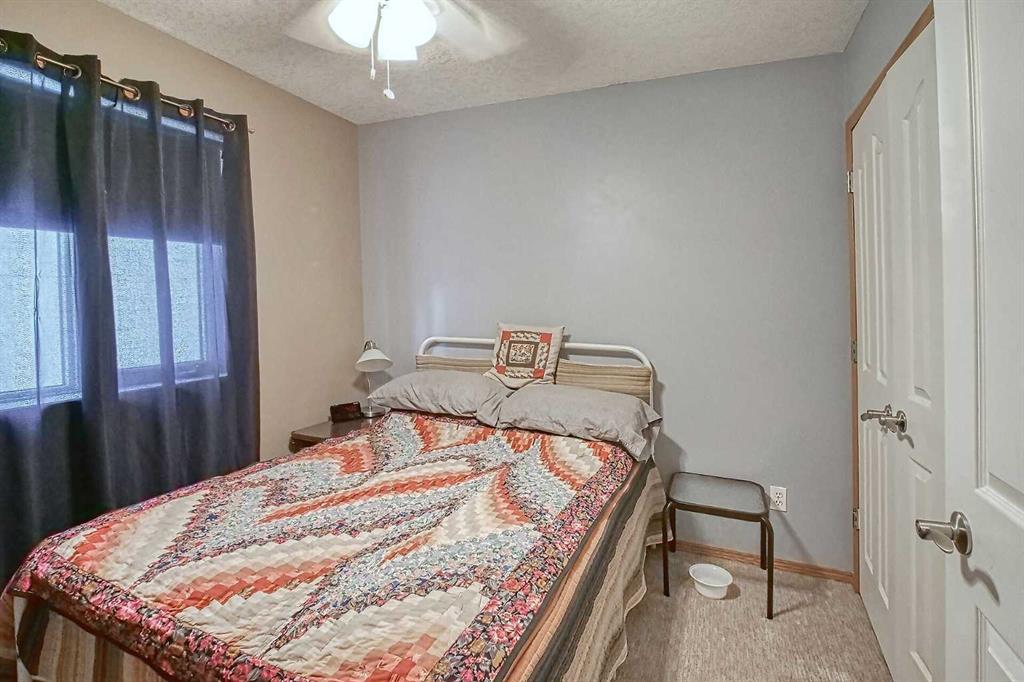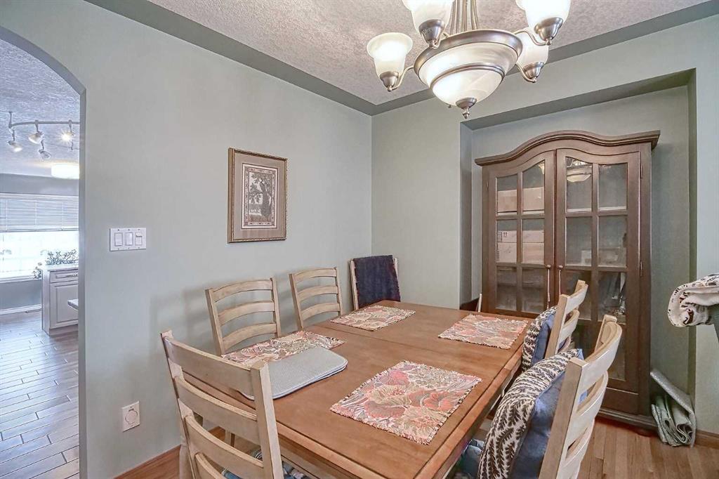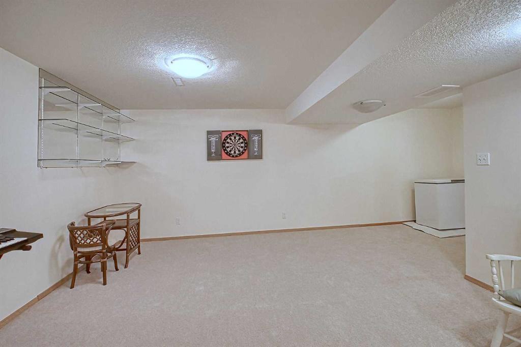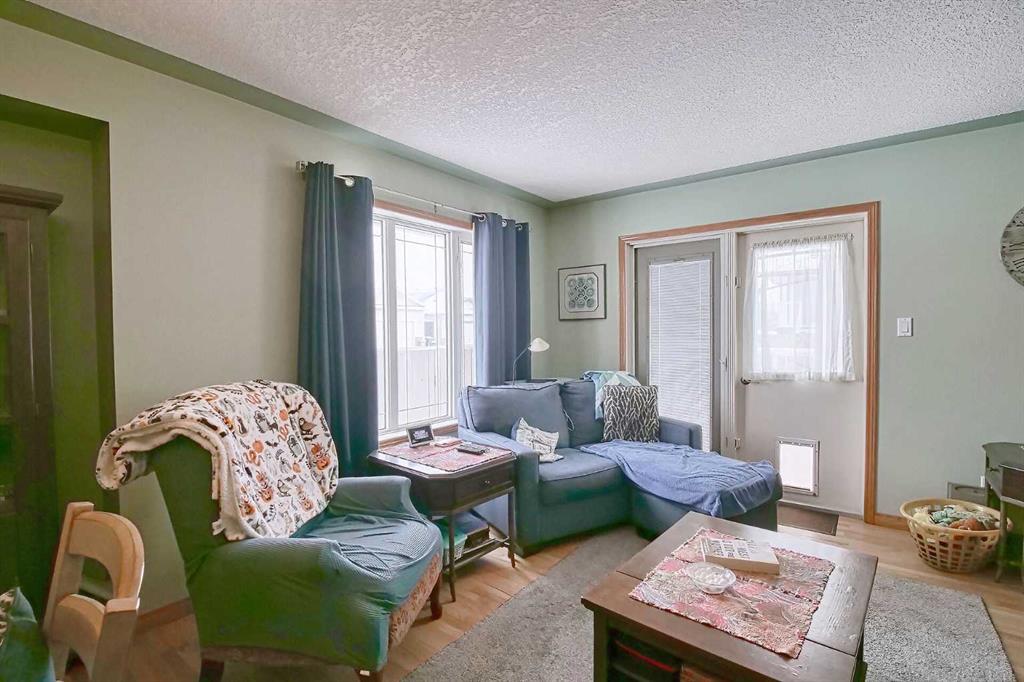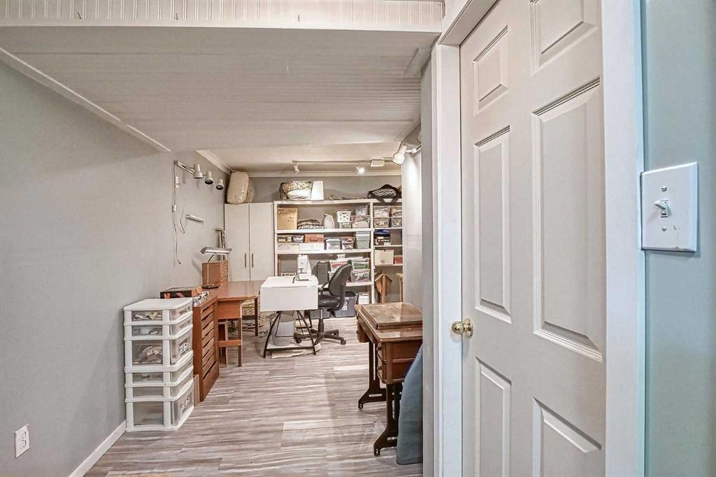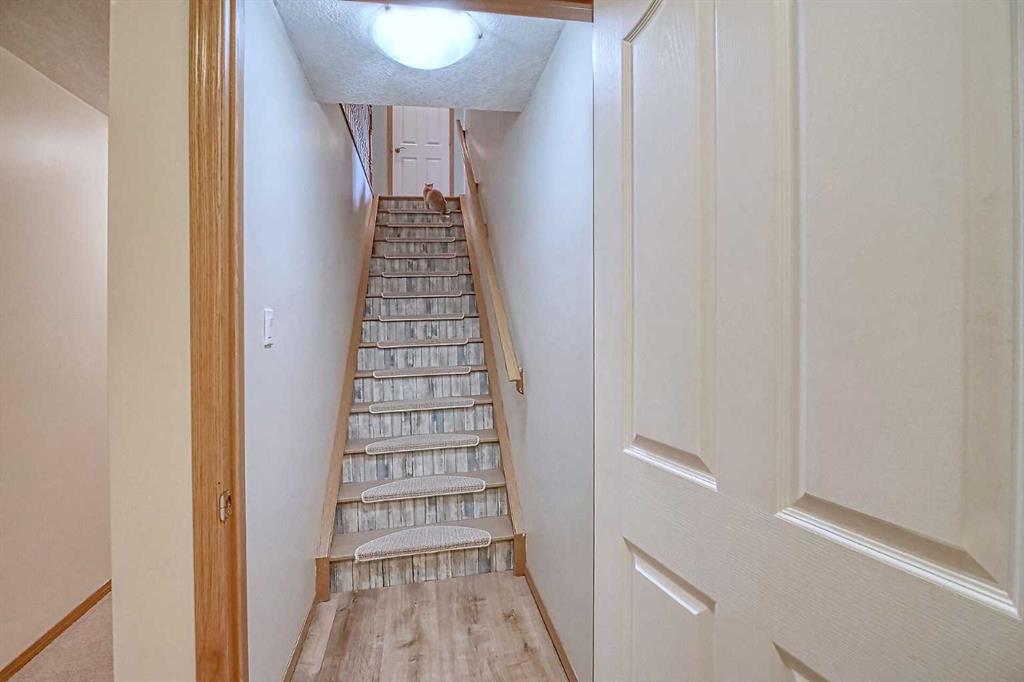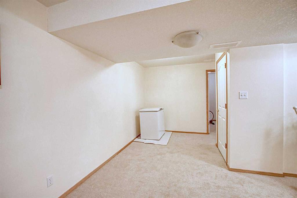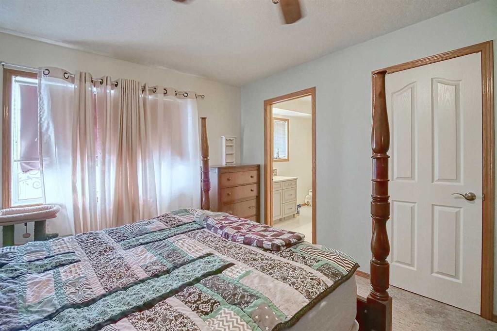 BEAUTIFULLY MAINTAINED BUNGALOW ON A HUGE CORNER LOT IN Crossfield, ideally located near parks and green spaces in a quiet neighbourhood. LOTS OF FRONT PORCH SITTING in this charming 4 bedroom, 3 bath home with a HEATED DOUBLE ATTACHED GARAGE features an updated kitchen with refreshed paint, flooring and lighting, some newer upper cabinetry, GRANITE COUNTERTOPS AND UPGRADED STAINLESS STEEL APPLIANCES INCLUDING A GAS RANGE, plus a two-seat breakfast bar and bright bay window nook for casual dining. The adjoining dining room has space for a large table and hutch and flows seamlessly into the inviting living room with a COZY GAS FIREPLACE. Patio doors lead to the SPACIOUS BACK DECK WITH PERGOLA overlooking the fully fenced yard with plenty of room for kids and pets to run. Down the hall are a 4 piece bathroom, two bedrooms, and a generous primary retreat with a LARGE WALK-IN CLOSET and oversized windows. Hardwood runs throughout the main floor with newer carpet in the bedrooms. There is A MAIN FLOOR LAUNDRY/MUDROOM just as you come in from the heated garage. The fully finished basement includes a LARGE MEDIA/RECREATION ROOM, a fourth bedroom with cheater access to a 4 piece bath (ideal for teens or guests), a flex room with built-in bookcases, a spacious utility area set up as a craft room, and dedicated cold storage. Complete with a newer deck and storage shed, this MOVE-IN READY HOME offers space, comfort, and functionality inside and out.