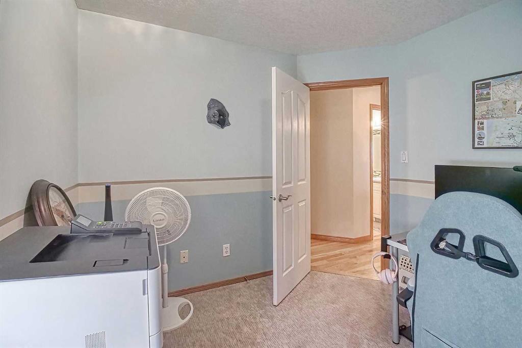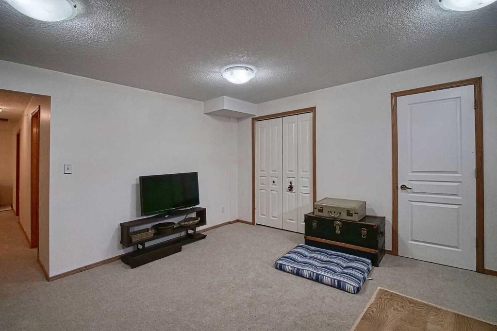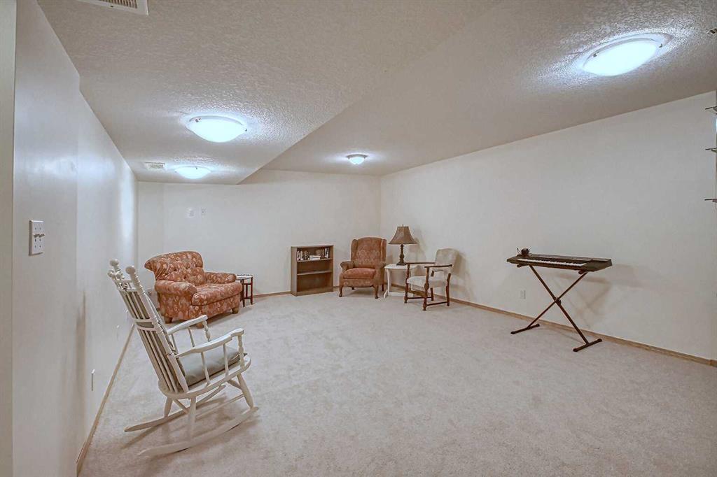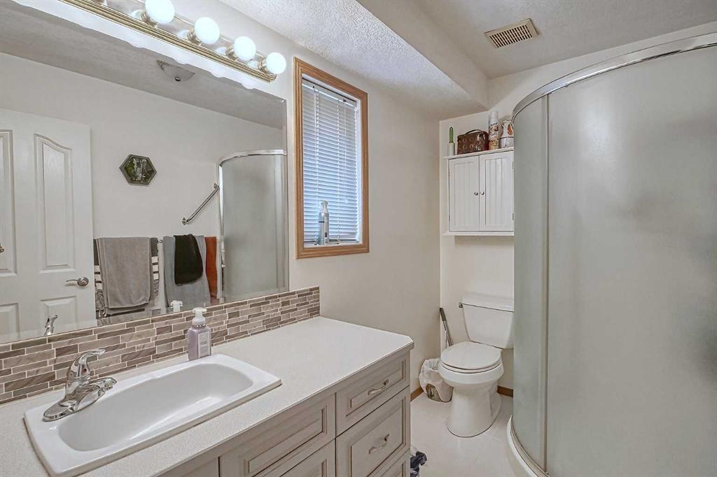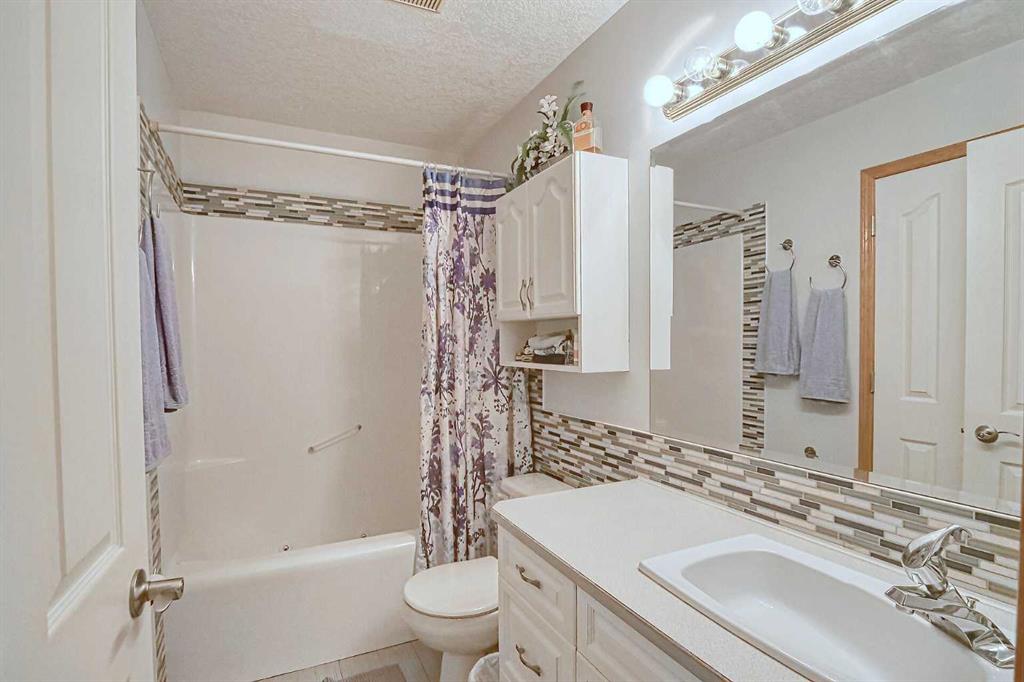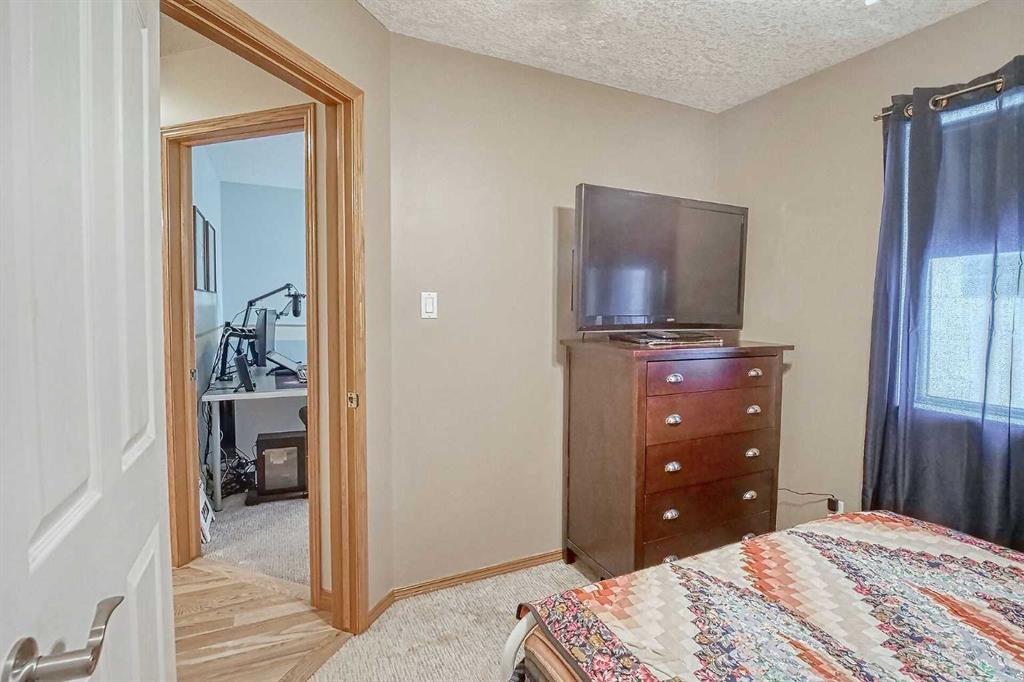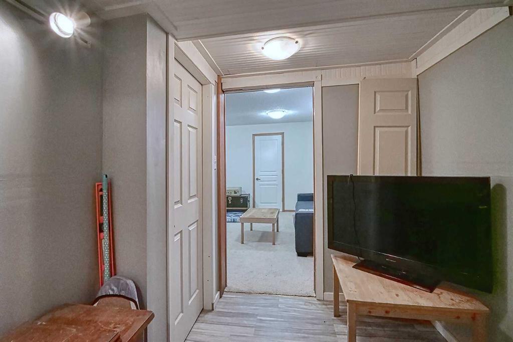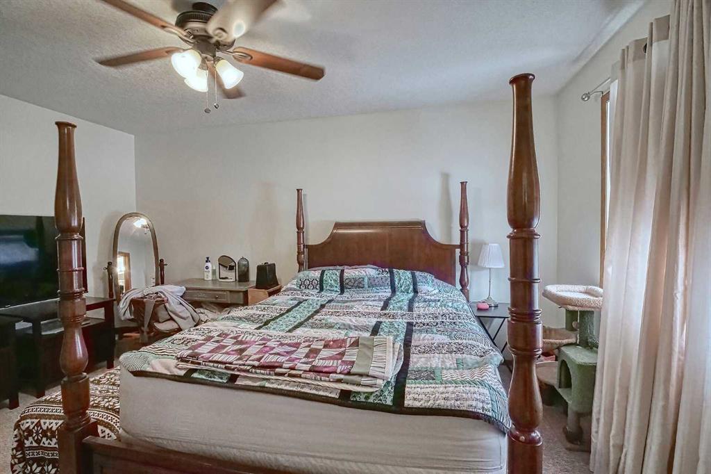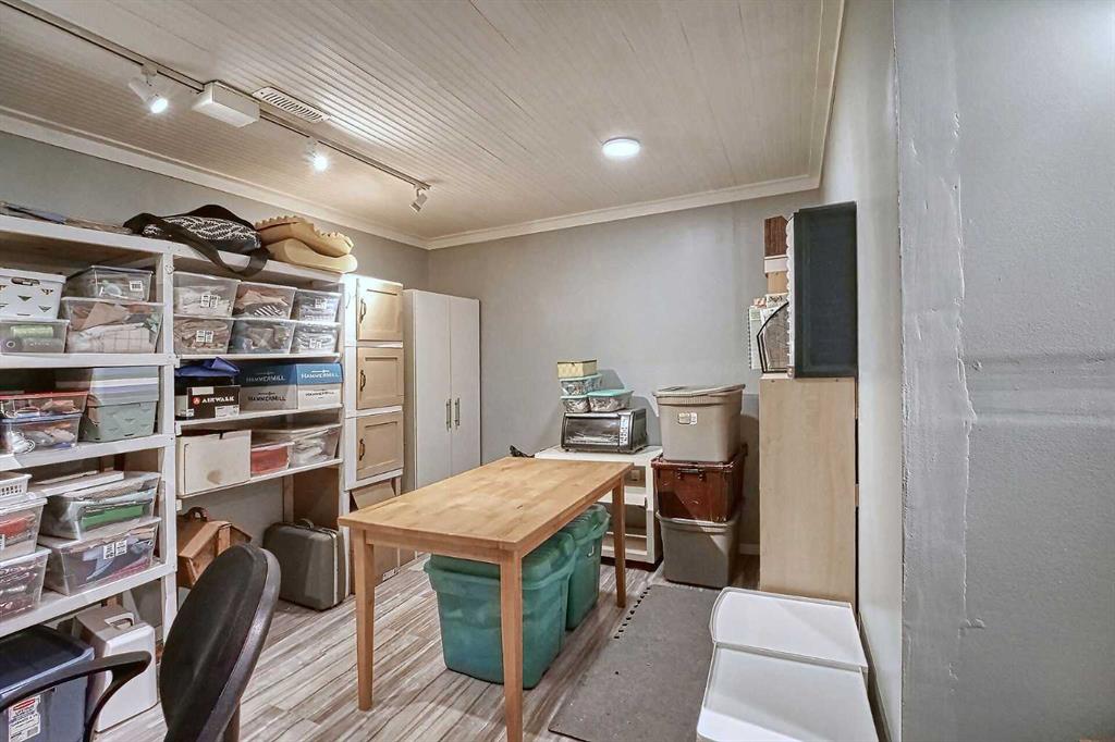 BEAUTIFULLY MAINTAINED BUNGALOW ON A HUGE CORNER LOT IN Crossfield, ideally located near parks and green spaces in a quiet neighbourhood. LOTS OF FRONT PORCH SITTING in this charming 4 bedroom, 3 bath home with a HEATED DOUBLE ATTACHED GARAGE features an updated kitchen with refreshed paint, flooring and lighting, some newer upper cabinetry, GRANITE COUNTERTOPS AND UPGRADED STAINLESS STEEL APPLIANCES INCLUDING A GAS RANGE, plus a two-seat breakfast bar and bright bay window nook for casual dining. The adjoining dining room has space for a large table and hutch and flows seamlessly into the inviting living room with a COZY GAS FIREPLACE. Patio doors lead to the SPACIOUS BACK DECK WITH PERGOLA overlooking the fully fenced yard with plenty of room for kids and pets to run. Down the hall are a 4 piece bathroom, two bedrooms, and a generous primary retreat with a LARGE WALK-IN CLOSET and oversized windows. Hardwood runs throughout the main floor with newer carpet in the bedrooms. There is A MAIN FLOOR LAUNDRY/MUDROOM just as you come in from the heated garage. The fully finished basement includes a LARGE MEDIA/RECREATION ROOM, a fourth bedroom with cheater access to a 4 piece bath (ideal for teens or guests), a flex room with built-in bookcases, a spacious utility area set up as a craft room, and dedicated cold storage. Complete with a newer deck and storage shed, this MOVE-IN READY HOME offers space, comfort, and functionality inside and out.