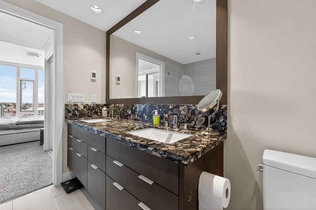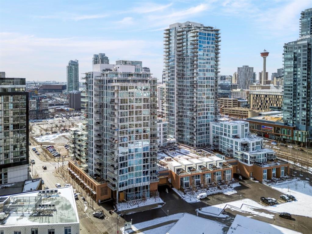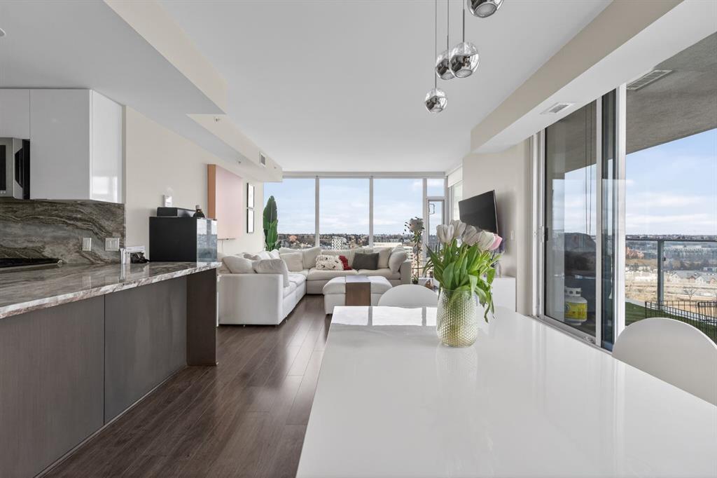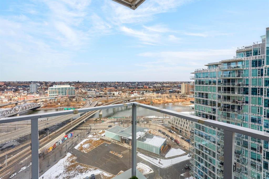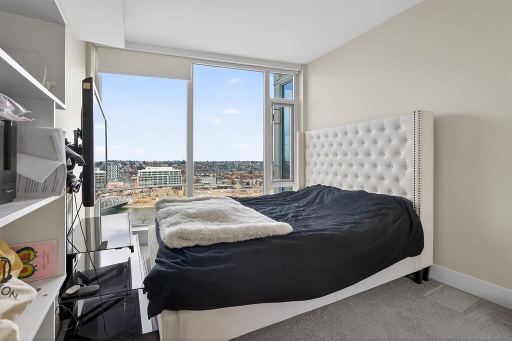 Perched on the 17th floor, this executive residence offers breathtaking views overlooking the Bow River and the vibrant city skyline. Designed with both comfort and style in mind, this spacious 2-bedroom, 2-bathroom suite features soaring ceilings, expansive floor-to-ceiling windows, rich hardwood and tile flooring, and plush carpeting in the primary bedroom. The open-concept layout seamlessly connects the kitchen, dining, and living areas—perfect for hosting guests or enjoying everyday living. The chef-inspired kitchen is equipped with a gas range, stainless steel appliances, granite countertops, and a sleek modern backsplash, delivering both functionality and sophistication. Retreat to the luxurious primary suite, complete with a spa-like 5-piece ensuite showcasing dual vanities, a deep soaker tub, and a fully tiled glass shower. Step outside to your oversized, nearly 20-foot-wide balcony—an ideal space for summer evenings, complete with room for lounging and BBQing while soaking in the incredible river views. Residents enjoy access to exceptional amenities, including a stunning rooftop courtyard, two fully equipped fitness centers, a sauna, and an expansive party room. With 24-hour concierge and security, peace of mind comes standard. This unit also includes a titled parking stall, a secure storage locker, and access to convenient visitor parking. Located in the heart of East Village, you’re just steps from river pathways, dining, shopping, and everything downtown living has to offer.