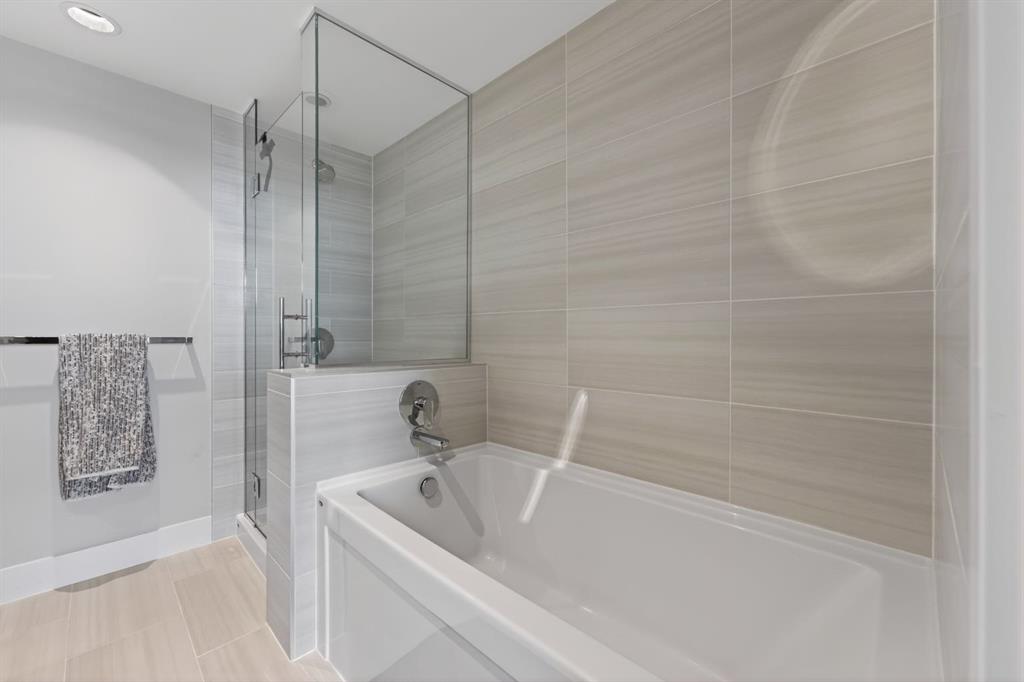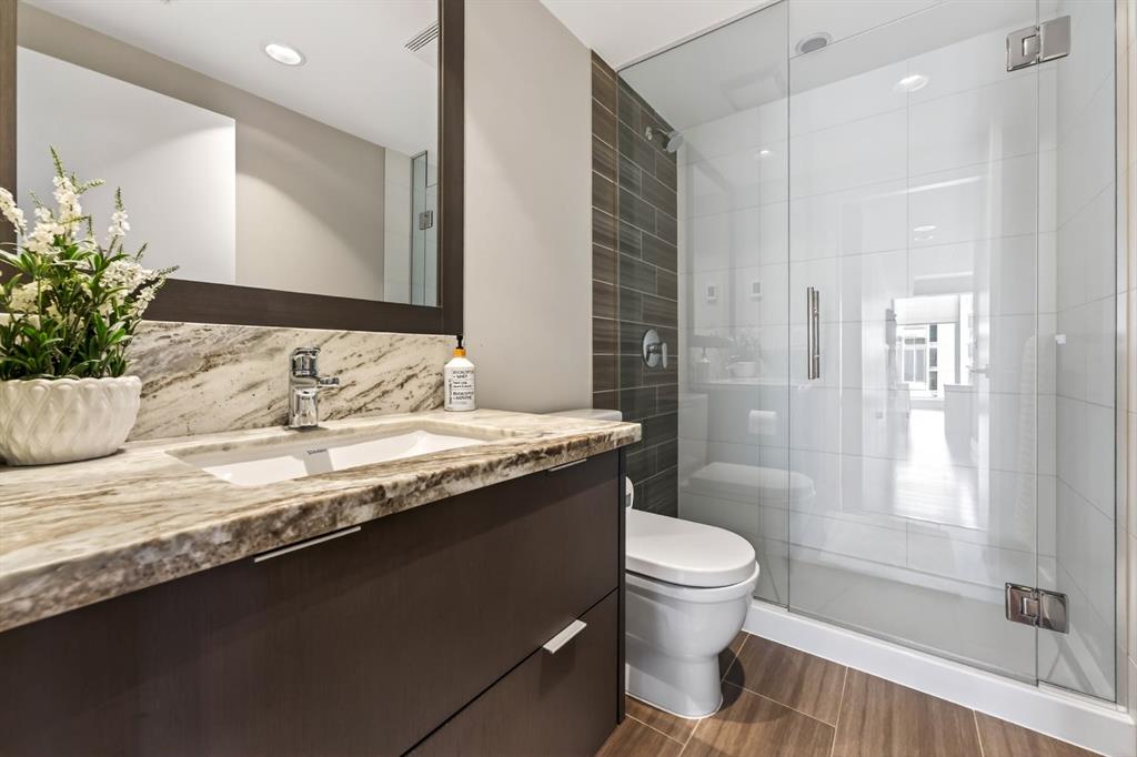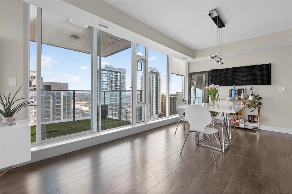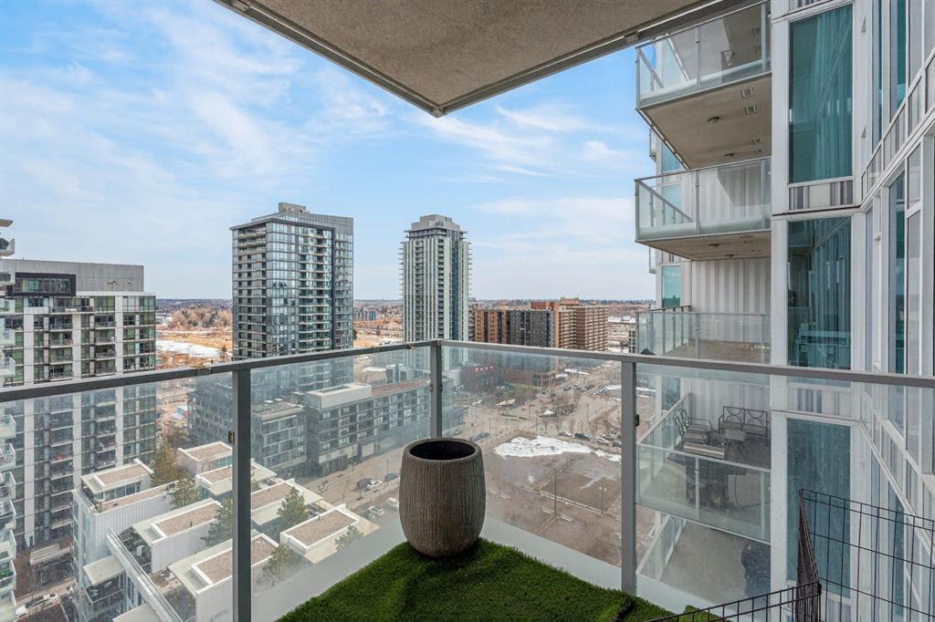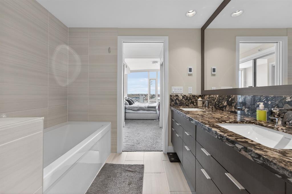Perched on the 17th floor, this executive residence offers breathtaking views overlooking the Bow River and the vibrant city skyline. Designed with both comfort and style in mind, this spacious 2-bedroom, 2-bathroom suite features soaring ceilings, expansive floor-to-ceiling windows, rich hardwood and tile flooring, and plush carpeting in the primary bedroom. The open-concept layout seamlessly connects the kitchen, dining, and living areas—perfect for hosting guests or enjoying everyday living. The chef-inspired kitchen is equipped with a gas range, stainless steel appliances, granite countertops, and a sleek modern backsplash, delivering both functionality and sophistication. Retreat to the luxurious primary suite, complete with a spa-like 5-piece ensuite showcasing dual vanities, a deep soaker tub, and a fully tiled glass shower. Step outside to your oversized, nearly 20-foot-wide balcony—an ideal space for summer evenings, complete with room for lounging and BBQing while soaking in the incredible river views. Residents enjoy access to exceptional amenities, including a stunning rooftop courtyard, two fully equipped fitness centers, a sauna, and an expansive party room. With 24-hour concierge and security, peace of mind comes standard. This unit also includes a titled parking stall, a secure storage locker, and access to convenient visitor parking. Located in the heart of East Village, you’re just steps from river pathways, dining, shopping, and everything downtown living has to offer.