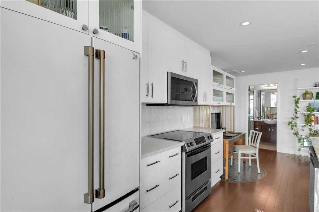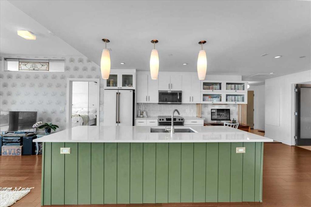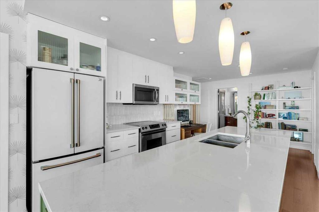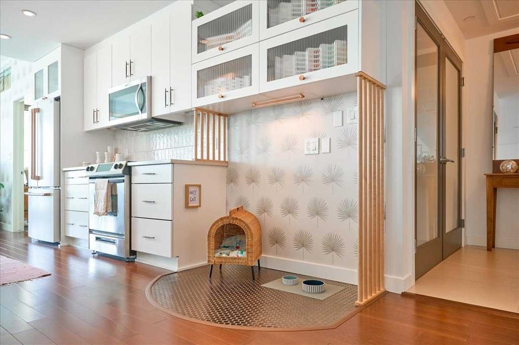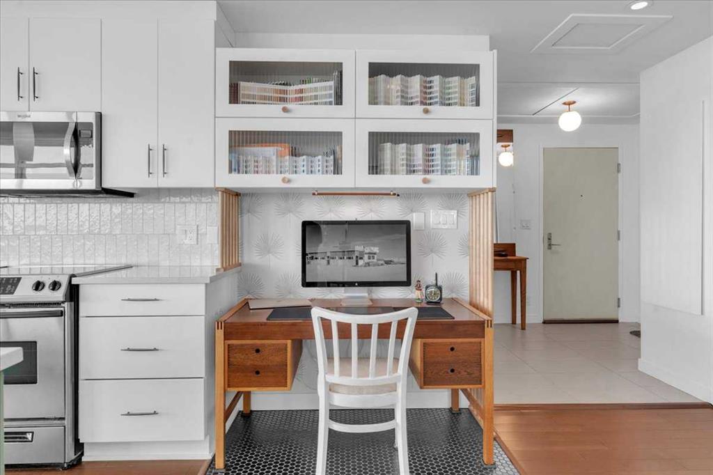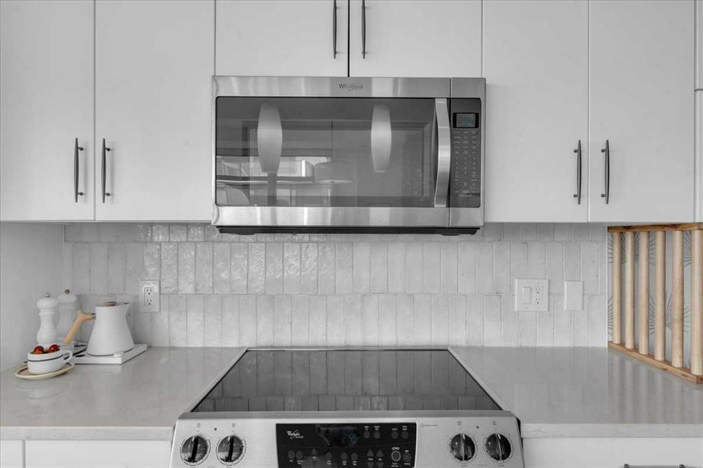 The open-concept living space has been thoughtfully updated with designer touches, including a refinished feature wall with elegant wallpaper and a beautifully transformed kitchen. Here, you’ll find freshly painted cabinetry with new hardware, a striking designer backsplash, refreshed island with shiplap accents, and upgraded appliances, including a GE Café counter-depth refrigerator. A cleverly designed desk area in the kitchen doubles as a discreet, water-resistant spot for dog or cat dishes, keeping your furry friend’s essentials tucked neatly out of the way.