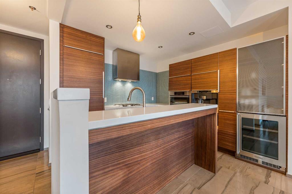 The open kitchen is finished with white quartz countertops and includes built-in appliances such as a gas cooktop, wall oven, microwave, and wine fridge. The living room is bright and inviting, with floor-to-ceiling south-facing windows that bring in plenty of natural light throughout the day. Step out onto the balcony and enjoy a unique downtown view, including a direct sightline to one of Calgary’s iconic buildings.