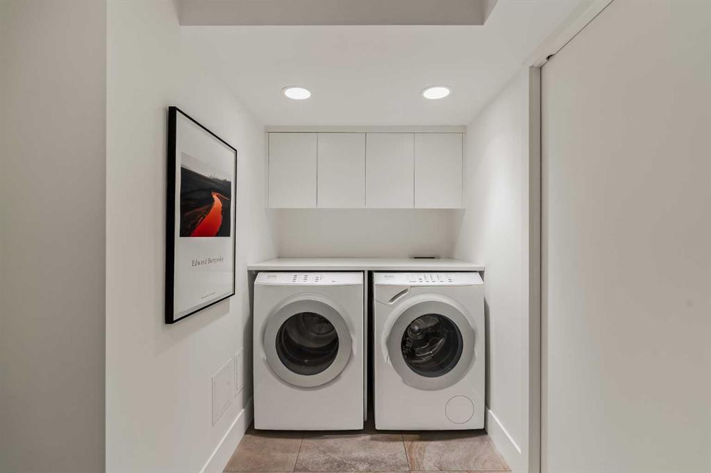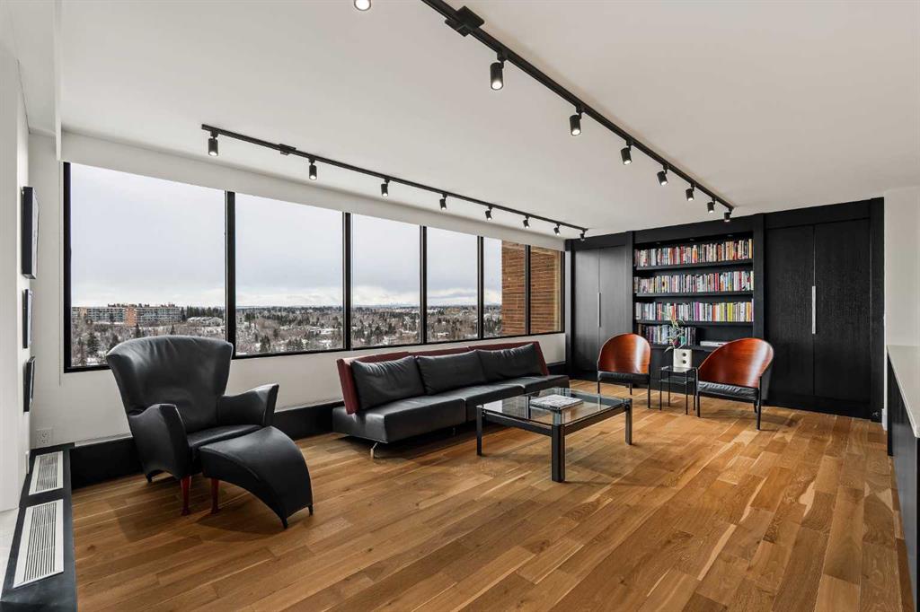 Architecturally renovated, this remarkable 2 storey penthouse delivers over 2,300 sq ft of refined living space with sweeping river valley and mountain views in the heart of Mission. Positioned within Roxboro House, one of Calgary’s most established concrete buildings, the home places river pathways, restaurants, cafés and downtown access within an easy walk while maintaining a quiet elevated setting above the city. Dramatic double height ceilings define the main living space where floor to ceiling windows frame expansive views and fill the interior with natural light throughout the day. Custom millwork and built-in library shelving introduce architectural character while a striking Bocci designer light installation creates a sculptural focal point above the living area. Marble fireplace surrounds add warmth and elegance while hardwood flooring extends throughout the home to create a cohesive and timeless finish. Entertaining flows easily between the living and dining areas where open sightlines toward the river valley form an impressive backdrop for gatherings. Quartz countertops and a full height quartz backsplash highlight the beautifully renovated kitchen where extensive custom cabinetry and a large central island support both daily routines and larger entertaining. Walk-in pantry storage keeps the space organized while built-in speaker wiring enhances the atmosphere for hosting. Adjacent bar cabinetry incorporates three wine fridges with capacity for approximately 750 bottles, creating a dedicated entertaining feature rarely found in condominium living. Upper level design introduces a flexible den retreat with its own fireplace and access to a second balcony, offering an ideal setting for a home office, lounge or private reading space overlooking the city skyline while an included Murphy bed allows the space to easily accommodate overnight guests when needed. Primary bedroom accommodations prioritize comfort and privacy through large windows, blackout blinds and extensive custom storage solutions. Heated floors in the lavish ensuite provide everyday comfort while modern fixtures enhance the spa-inspired atmosphere. Air conditioning supports year-round comfort and upper level laundry adds everyday convenience. Two private balconies extend the living space outdoors while showcasing panoramic mountain and river views. Tandem underground parking accommodates 2 vehicles and an assigned storage unit adds valuable extra space. Roxboro House residents enjoy secure entry with front desk service along with exceptional amenities including an indoor pool, hot tub, sauna, fitness room, woodworking shop, library and billiards lounge, party room and a beautifully landscaped sky terrace with BBQ areas and outdoor gathering spaces. Mission remains one of Calgary’s most vibrant inner-city neighbourhoods where river pathways, parks, restaurants and boutique shopping create an exceptional walkable lifestyle just minutes from downtown.