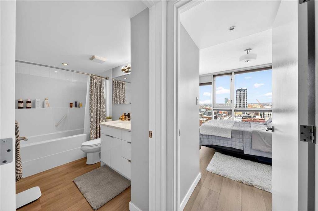 Every surface has been considered—flooring, lighting, hardware—all curated to create a cohesive, polished look that feels both fresh and timeless. Perched on the 17th floor, the unit is drenched in natural light, with expansive windows framing stunning city views that shift from vibrant daytime energy to a glowing skyline at night.