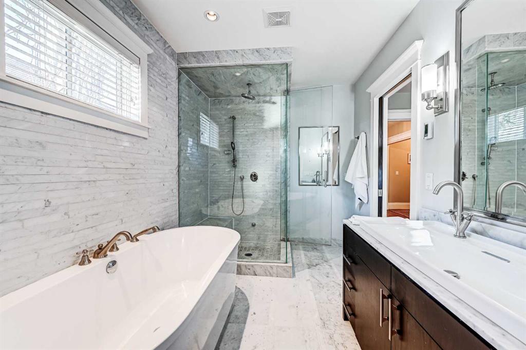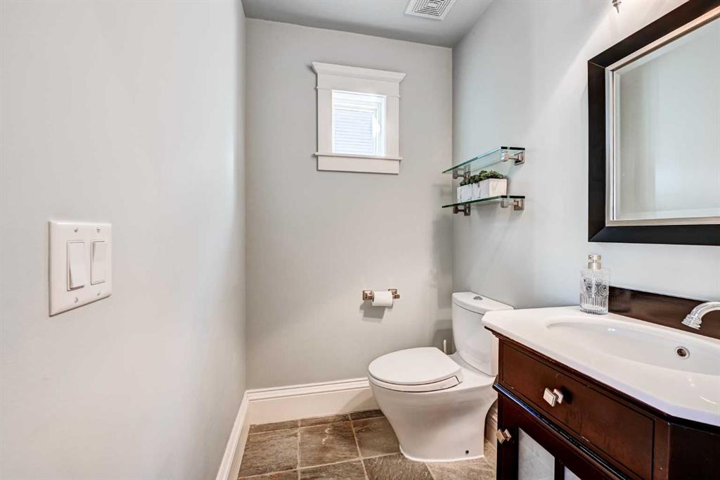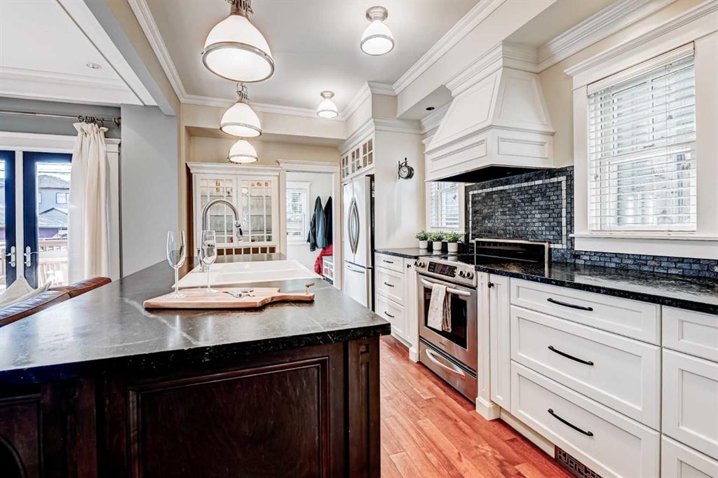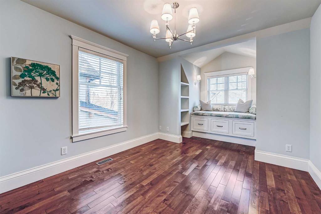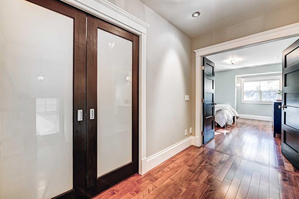 ** Open House Saturday February 14th from 11:30AM – 1:00 PM! ** Nestled in the heart of highly sought-after Hillhurst on a quiet street with a boulevard in front, this beautifully and professionally renovated character home offers the perfect blend of timeless charm and modern comfort — all on a generous 33’ x 125’ lot with a sunny south-facing backyard with A/C and just a short walk to downtown. Taken down to the studs and extensively renovated in 2008, this home preserves its heritage appeal while incorporating thoughtful upgrades throughout. The main floor features 9’ ceilings, rich gunstock-stained maple hardwood floors, and stunning coffered ceilings spanning the living, dining, and great rooms. The centre piece 2 sided fireplace separates the living room and dining room, and a striking barrel vault ceiling in the main hallway and numerous leaded glass accent windows add architectural distinction, while solid fir interior doors reinforce the home’s classic character. The custom maple kitchen offers abundant cabinetry, pantry storage, and beautiful soapstone countertops, ideal for both everyday living and entertaining. A discrete powder room and a good sized mudroom takes you to the large deck overlooking the sun drenched South facing backyard. Large French doors open from the family room to the private backyard. Upstairs, the huge primary bedroom with walk-in closet and spa inspired ensuite with heated floors overlooks the backyard. Two additional bedrooms both with built in shelving, storage, and a charming window seat provide the perfect reading nook. A dedicated office space and a second full bathroom showcasing a timeless cast iron clawfoot soaker tub and a custom-built laundry chute adds a practical touch to complete the upstairs. The exterior maintains its heritage integrity with cedar clapboard siding, a welcoming front veranda, cultured stone pillars, and period-style metal-clad wood windows. Outside, enjoy professionally designed landscaping with established perennials and bordered flower beds, new cement walkways, a 14’ x 12’ cedar deck, paving stone patio, and a fully fenced south-facing yard. Completing the property is a 22’ x 20’ double detached garage built in 2008. With a new roof (2011), air conditioning (2014), new furnace (2016) and hot water tank (2021) this is a rare opportunity to own a meticulously maintained character home in one of Calgary’s most desirable inner-city communities.