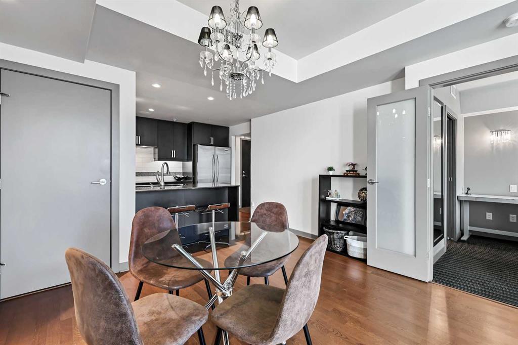 Welcome to Solaire, one of downtown Calgary’s most sought-after high-rises, offering refined urban living in the heart of the West End. This stylish 1-bedroom, 1-bathroom residence on the 17th floor captures sweeping city views through expansive floor-to-ceiling windows and features a spacious open-concept layout designed for modern living. The contemporary kitchen impresses with full-height espresso cabinetry, under-cabinet lighting, sleek granite countertops, a built-in pantry, a generous island with breakfast bar, and premium stainless steel appliances. The bright and inviting living area is anchored by a modern gas fireplace and provides ample space for dining beneath an elegant chandelier. The bedroom is a serene retreat, enhanced by upgraded carpeting, French doors, and matching wall-mounted chandeliers. The well-appointed bathroom showcases extended tile detailing, and a granite vanity. Additional highlights include engineered hardwood flooring, built-in closet organizers, central air conditioning, and an integrated in-ceiling audio system. This residence comes complete with a titled underground parking stall and an assigned storage locker. Solaire offers professional management, full-time concierge service and a fully equipped fitness centre. Perfectly positioned just steps from the Bow River pathways, Eau Claire Park, the LRT station, and a short stroll to Kensington, this exceptional home is ideal for first-time buyers or investors seeking a blend of luxury, style, and convenience. Contact your favourite Realtor to arrange a private viewing today.