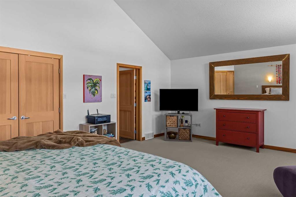 The five-bedroom home features vaulted ceilings, exposed wood beams, a stone fireplace, and large windows that flood the main level with natural light and mountain views. The open layout connects seamlessly to the kitchen and dining area, perfect for everyday living and entertaining. A unique lofted space accessed by ladder offers flexibility as a yoga retreat, office, or quiet escape. The main level also includes a primary bedroom with ensuite and private balcony, plus two additional bedrooms and a full bathroom.