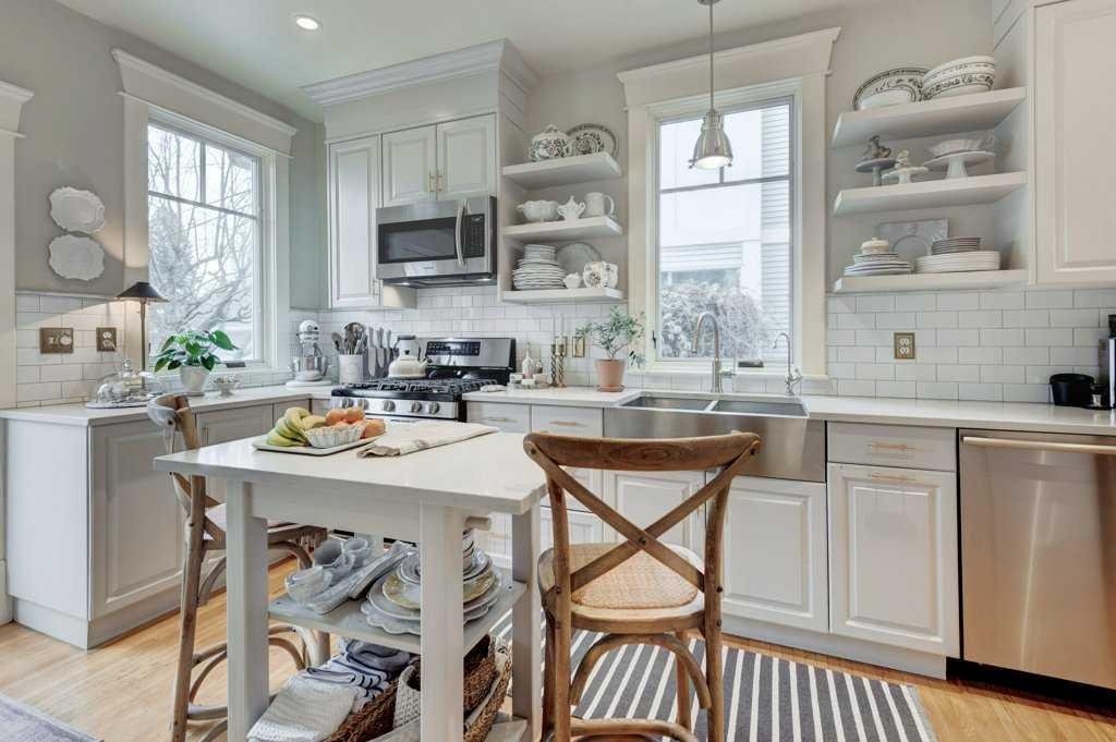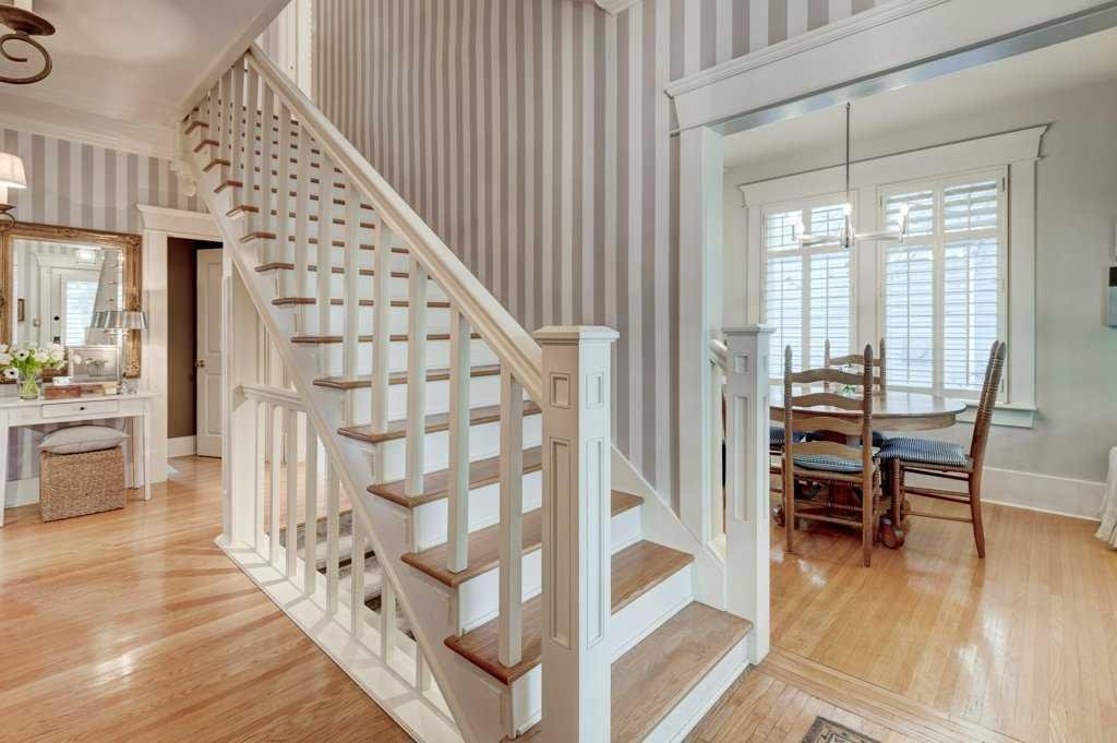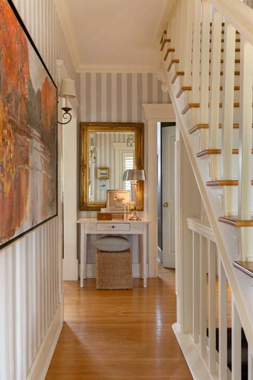 The main floor welcomes you with a warm and inviting living room featuring crown molding, recessed lighting, a gas fireplace with a mantle, and original wood flooring that continues throughout the main and upper levels. Custom California wood shutters on the windows and French door add both style and function, while the dining room creates an elegant setting for gatherings with direct access to the private backyard. The kitchen is both functional and refined, complete with quartz countertops, a metal farmhouse sink, stainless steel appliances, a wine rack, pantry, extensive cabinetry, and built-in shelving. A charming breakfast nook provides the perfect spot for casual mornings, while a bright powder room with a window adds convenience to the level. Custom wallpaper throughout the central hall and entire home adds a unique and tasteful design element.