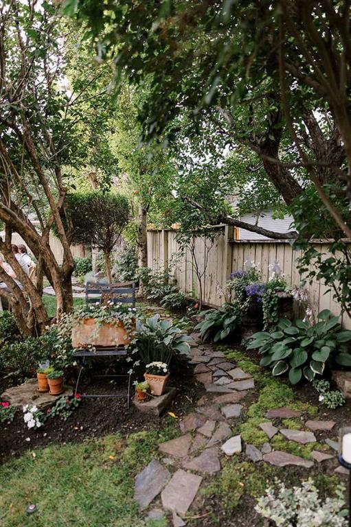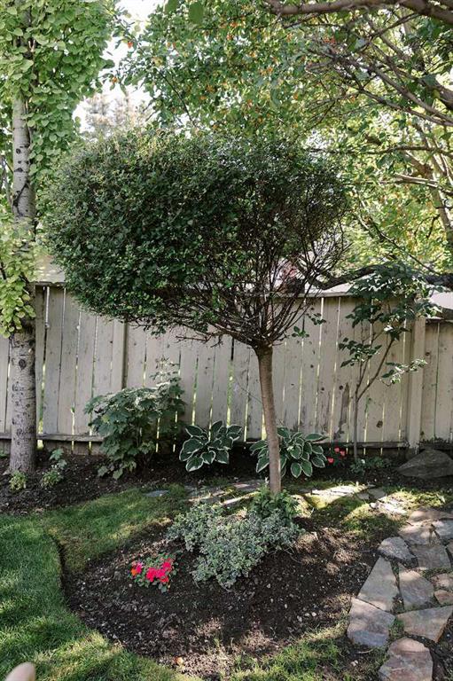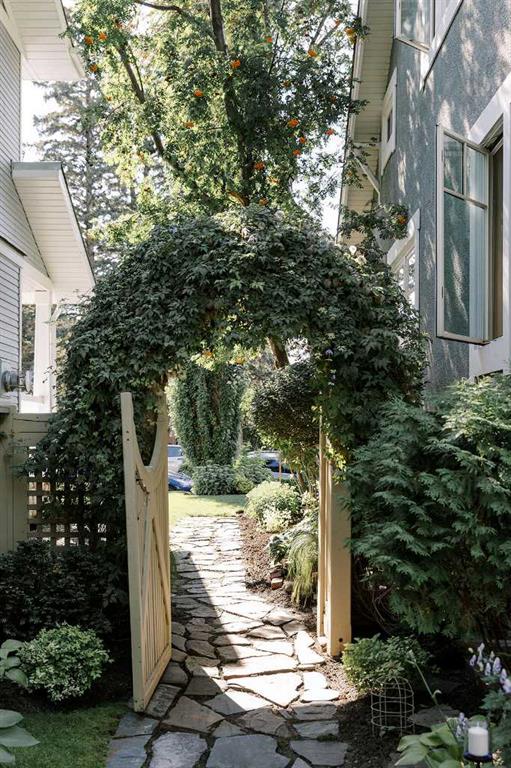 Step outside to your private, east-facing backyard oasis, where mature landscaping, custom exterior stonework, stone pathways, and garden beds with drip lines create a peaceful setting. An irrigation system in both the front and back yard ensures easy maintenance, while custom copper gutters and downspouts adds beauty and durability. The detached double garage is complemented by a paved back lane, offering clean and convenient access.