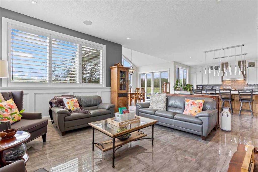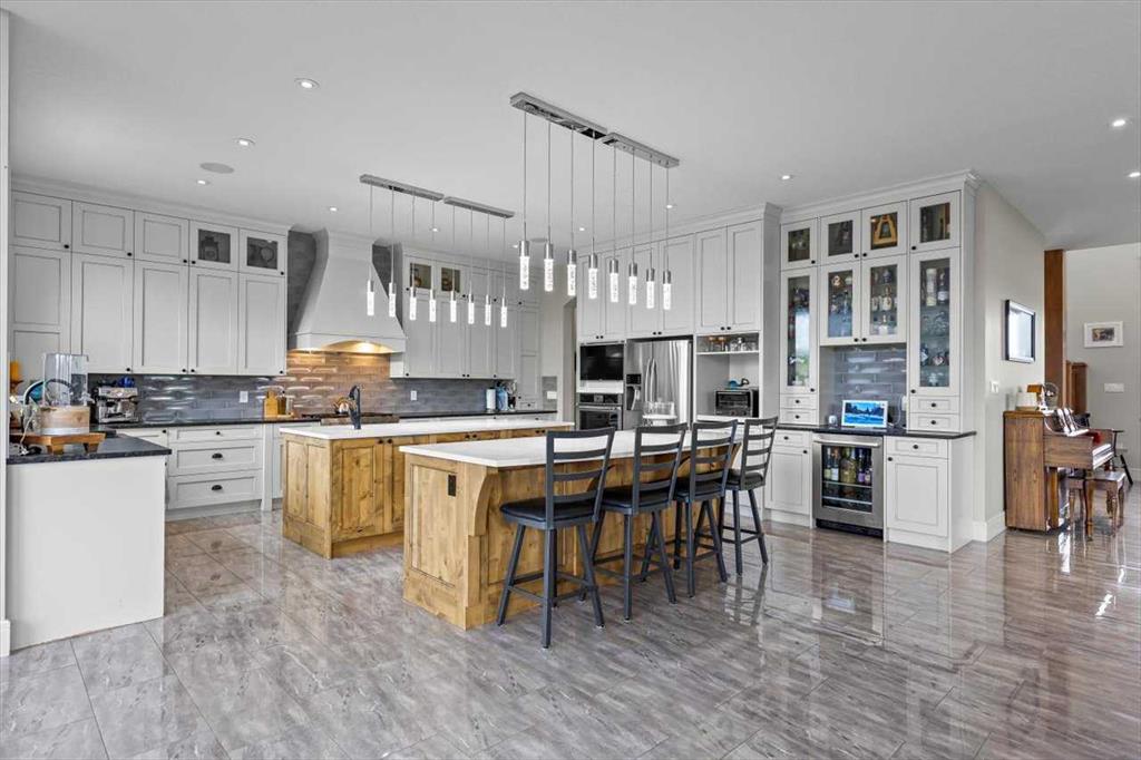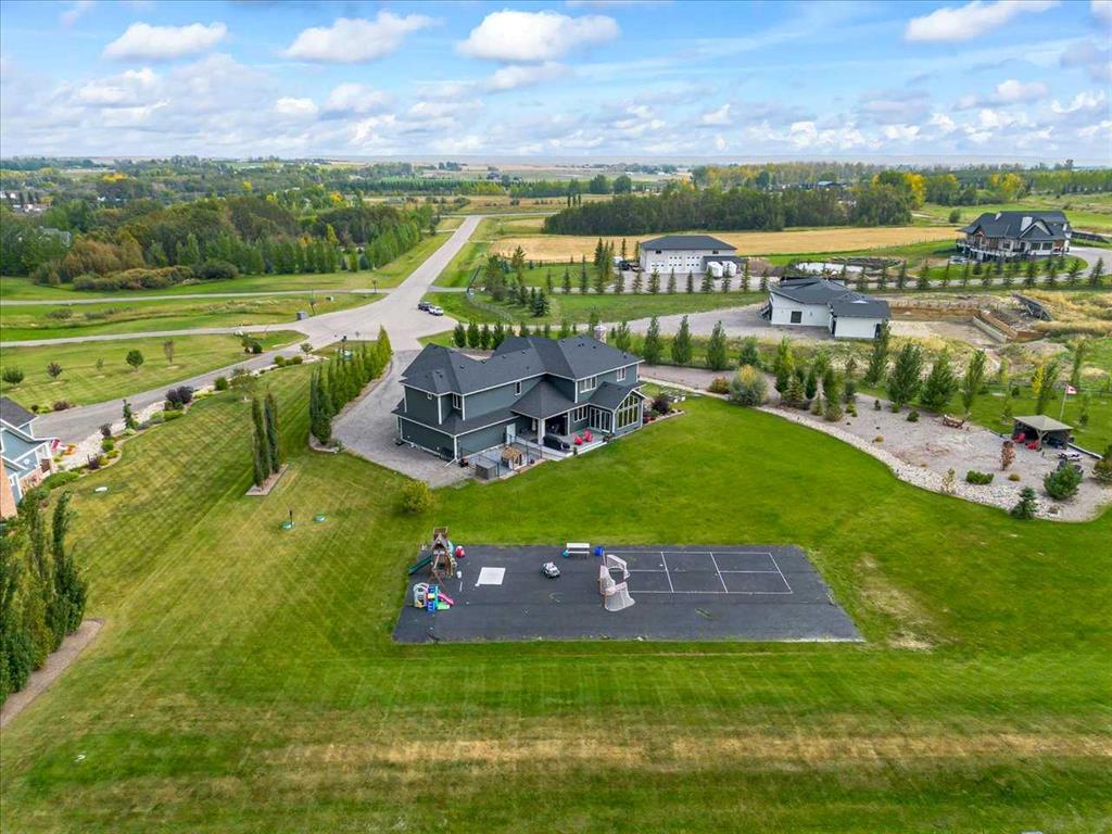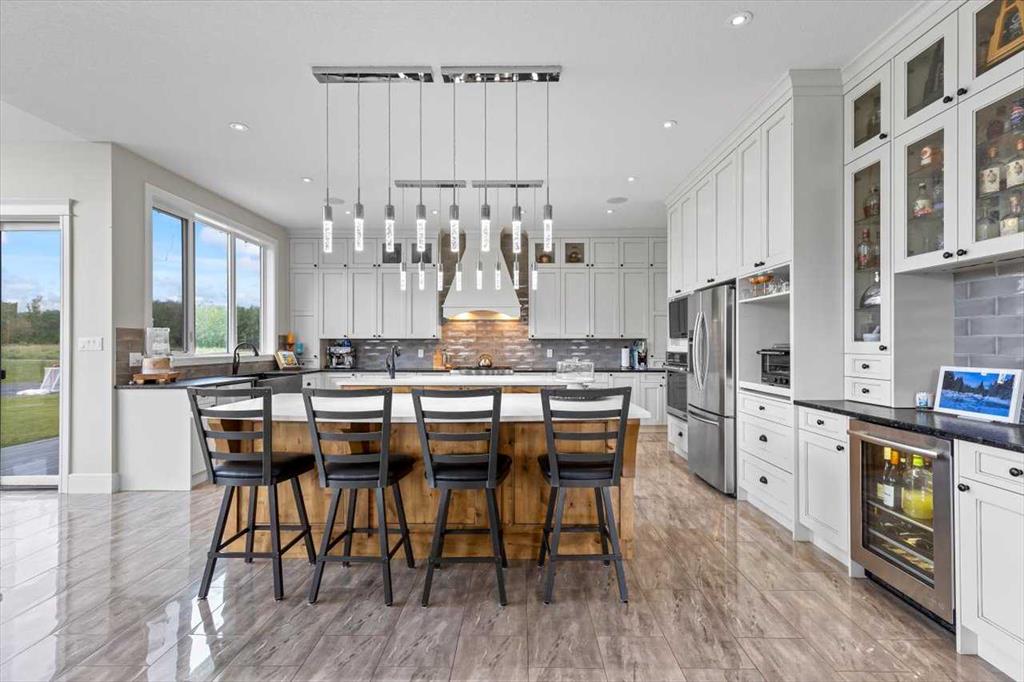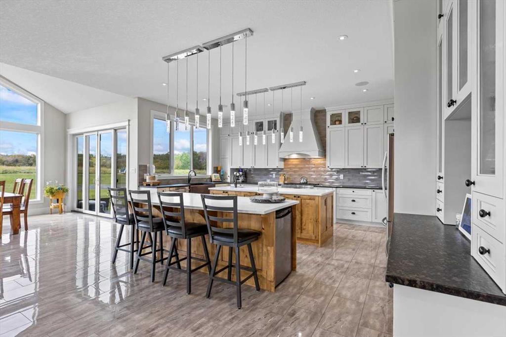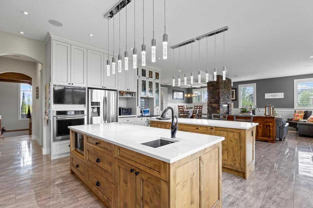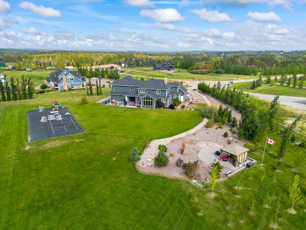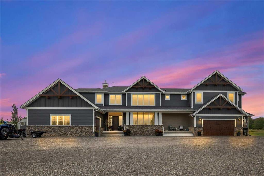 Welcome to an extraordinary CUSTOM-BUILT estate where functional luxury and privacy meet in perfect harmony. Set on 3.12 acres at the end of a quiet cul-de-sac with no neighbours behind, this residence offers more than 7,000 sqft of impeccably designed living space across three levels and a seamless balance of serene country living with city convenience. As you step inside the foyer, the 20-foot ceilings might be the last thing you notice as the adjacent awe-inspiring floating Alderwood staircase immediately grabs your attention and sets a tone of refined craftsmanship. While still standing in the foyer, the open concept design allows you to look past the raised dining room with coffered ceiling, double-sided stone fireplace and living room into the nook with its own 14-foot vaulted ceiling and a panoramic view of the backyard. The gourmet kitchen is a chef’s dream that features floor-to-ceiling custom cabinetry, double 8-foot Knotty Alder Islands, Jenn-Air Professional 36” Dual Fuel 6-Burner Range & Jenn-Air Professional Convection Wall Oven, 40” Native Trails Copper Farmhouse sink, and the striking combination of quartz and leathered granite countertops provides seemingly endless counter space. The main floor also includes a private office ideal for working from home, along with two mudrooms that provide entrance into the home from both heated garages. This magnificent home includes 8 BEDROOMS (each with its walk-in closet) and 7.5 BATHS (in total) with a fully developed basement. Upstairs, you’ll find six bedrooms, including the luxurious primary retreat with an oversized walk-in closet and a beautifully appointed ensuite, along with five bedrooms. There is room for extended family or multi-generational living. The fully finished basement boasts a massive recreation room/games room, two spacious bedrooms and storage. Comfort and efficiency are paramount with in-floor radiant heating, built-in multi-zone sound system and instant hot water throughout the house. The home comes equipped with water treatment, a dedicated sports room, ample storage and even three washers and three dryers to keep pace with an active lifestyle. Enjoy outdoor living at its finest with a large front veranda, a private gazebo surrounded by maturing trees, a firepit / BBQ area, and stunning views of the Calgary Skyline. There is room for your RV, complete with full RV hookups, along with ample parking spaces for more cars than you can imagine. The property is just outside of Okotoks corporate limits (500m), offering you the choice of public and Catholic schools within 5 minutes or private schools less than 10 minutes away from the house. This premium property delivers unrivalled space, privacy and craftsmanship making it a rare offering, add in its ideal location, it’s a one of a kind offering on the market today!