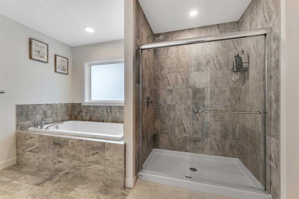 Upstairs, you’ll find a cozy bonus room, a full 4-piece bathroom, and three generously sized bedrooms, including the impressive primary suite. This serene retreat features large windows showcasing panoramic views, a luxurious 5-piece ensuite with double sinks, a standalone soaking tub, a tiled glass-enclosed shower, and a walk-in closet with custom built-in shelving.