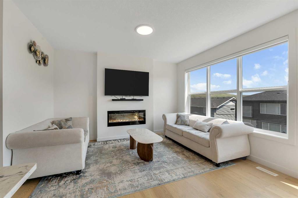 The chef-inspired kitchen is a true showstopper, complete with quartz countertops, a large island with breakfast bar, gas range with range hood, built-in microwave, and a walk-through pantry offering ample storage and ease of access. Adjacent to the kitchen is a bright and spacious living room highlighted by a sleek electric fireplace and stunning mountain views.