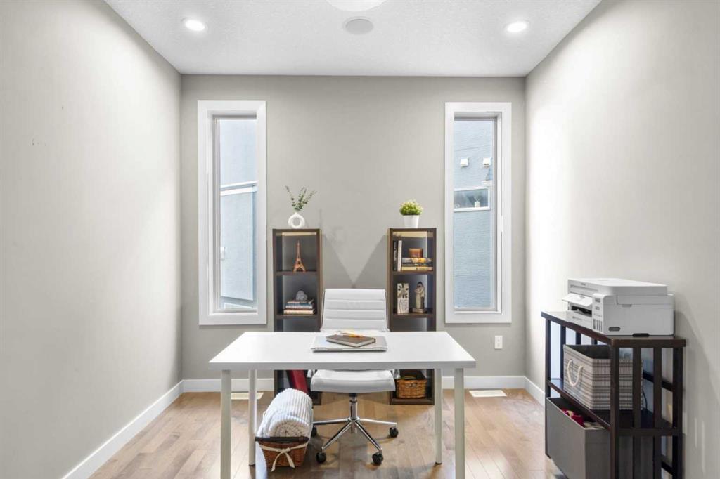 From the moment you enter, you are greeted by a spacious open foyer and a private main-floor office featuring elegant double French doors—perfect for working from home. The main living area is highlighted by a soaring double-height ceiling in the living room, complete with a striking built-in fireplace feature flanked by custom shelving, creating an impressive yet inviting space.