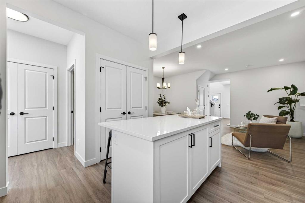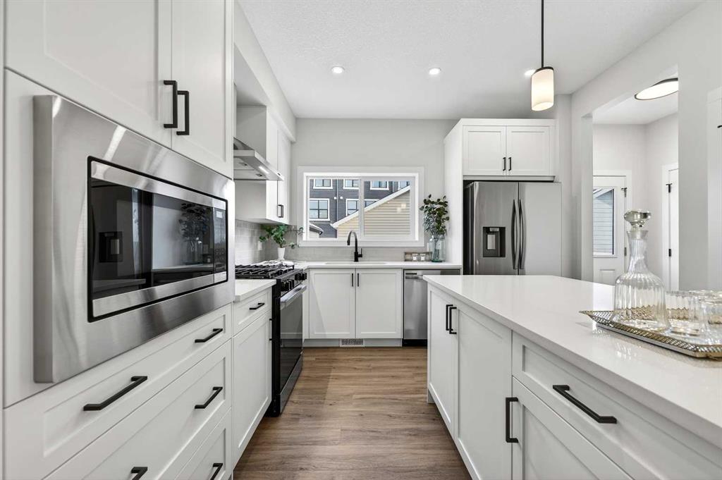 Welcome to The Amber by Genesis Builders, a beautifully designed two-story home offering 1,515 sq. ft. of comfortable living space with an additional unfinished basement with legal basement suite rough-in. The main floor features an open-concept layout with a front flex room, bright great room, and a modern kitchen complete with a central island, quartz countertops, flat-panel cabinetry, and a full stainless steel appliance package. It’s a space that feels inviting and functional, perfect for daily life or entertaining guests. Upstairs, you’ll find three bedrooms, a full bathroom, and a conveniently located laundry area. The spacious primary suite includes a walk-in closet and a private ensuite designed for everyday comfort. This home is equipped with smart-home features including a Ring doorbell, Weiser Smart Code lock, Ecobee thermostat, and Amazon Echo Show. Additional highlights include 9-foot main floor ceilings, upgraded railing, a BBQ gas line, rough-in gas line for the range and a 10′ x 10′. The exterior showcases Hardie board siding with Smartboard trim and durable vinyl accents. Located near future parks, pathways, and community amenities, The Amber combines modern design, quality craftsmanship, and lasting value in the heart of Keystone Creek. *Photos are representative and may not reflect the exact finishes of this home. Mood board for colours and selections are in the photos. Rms calculated from builder blueprints provided by the builder. Possession is tentative and scheduled for September 2026.
