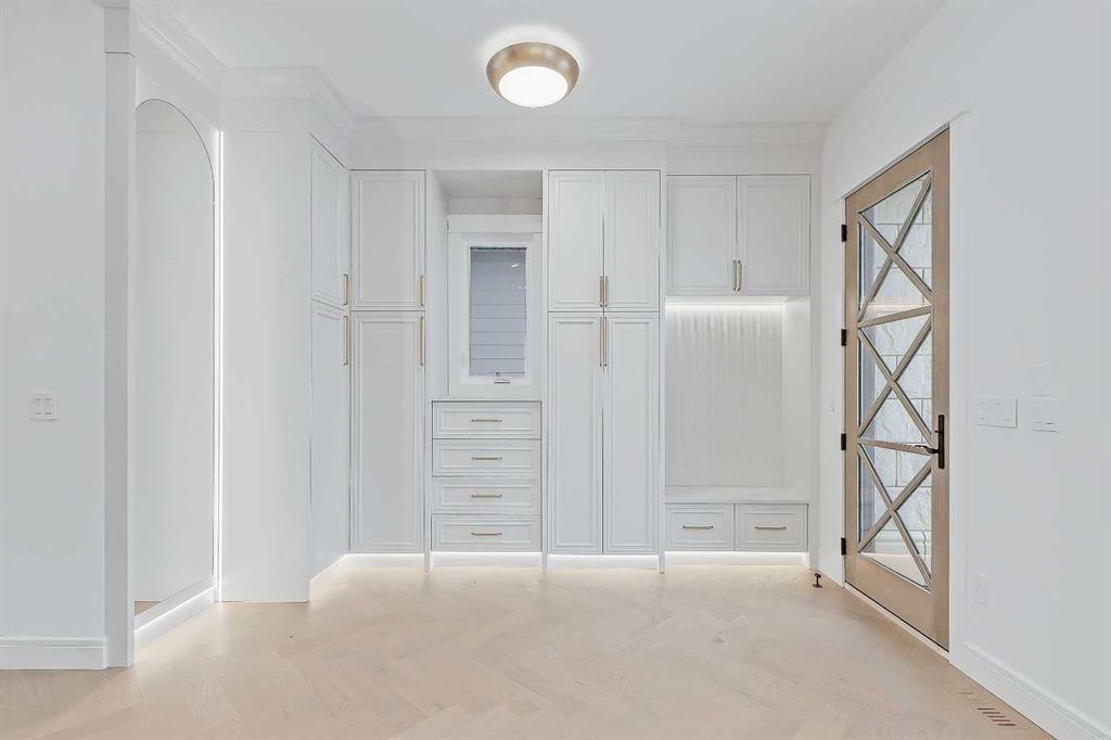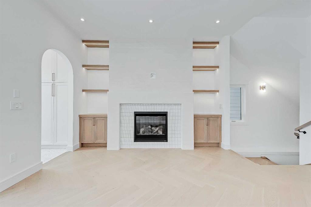 Inside, you’re greeted by a central foyer that opens into a bright, airy space with soaring ceilings and oversized windows that let in light from every angle. The dining area connects naturally to a chef-inspired kitchen past a convenient bar area with space for a beverage fridge and custom cabinetry, while the kitchen itself impresses with a full-height quartz backsplash, designer pendants, and upgraded high-end appliances, including a gas range, custom hood fan, and French door fridge/freezer. The spacious living area feels open yet cozy, grounded by a GAS FIREPLACE with built-in shelving on either side and a view of the landscaped yard, with access to the custom mudroom with built-ins, adding the kind of functional polish that makes day-to-day life feel seamless.