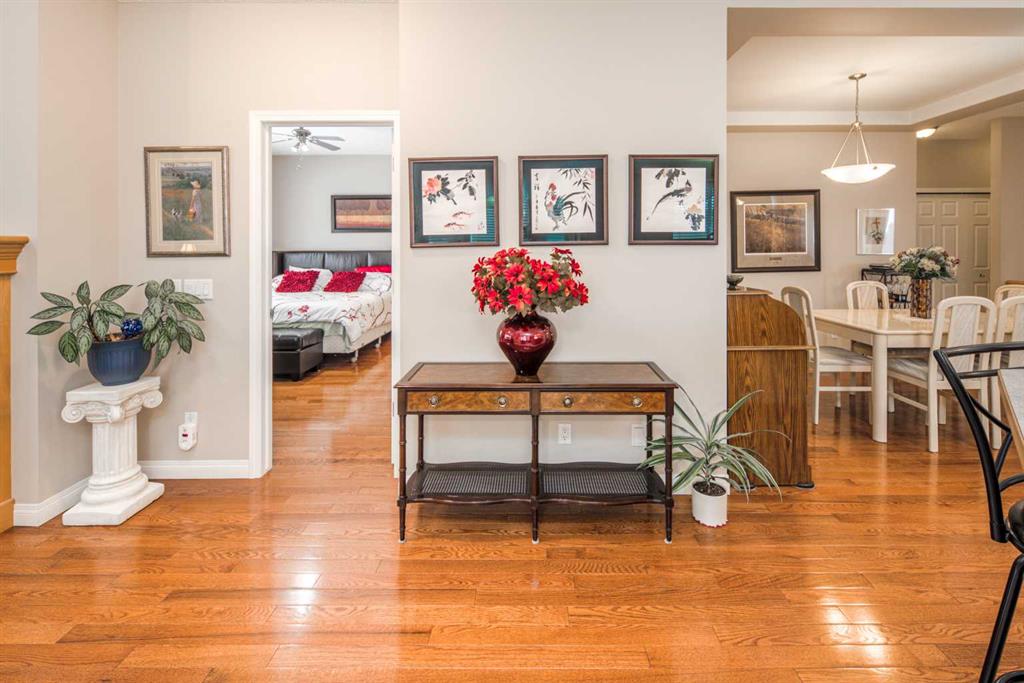 Welcome to this beautifully maintained 18+ villa, ideally located in the sought-after community of Panorama Hills. Offering approximately 2,400 sq. ft. of fully developed living space, this home provides ample room to suit all your lifestyle needs. Upon entry, you’re greeted by rich hardwood flooring that flows throughout the main level, creating a warm and elegant ambiance. The open-concept design showcases a bright and inviting living room highlighted by vaulted ceilings, a cozy fireplace, and a large window that fills the space with natural light. The kitchen is both functional and welcoming, featuring a central island, abundant cabinetry, a pantry, and a sunny eat-in nook. It connects seamlessly to the formal dining room—perfect for hosting family gatherings and entertaining guests. A versatile den or home office with a built-in Murphy bed adds flexibility to the main floor layout. The spacious primary suite offers a peaceful retreat, complete with large windows, a walk-in closet, and a well-appointed ensuite featuring a soaker tub and separate walk-in shower. You’ll also appreciate the convenience of main-floor laundry and an additional full bathroom. The fully finished basement expands your living space with a generous family room, a two-piece bathroom, and plenty of room for hobbies, games, or entertaining. Outside, the beautiful backyard creates the perfect setting for relaxing or entertaining. With central air conditioning, a double attached garage, and the benefits of low-maintenance living, this home delivers comfort in every season. Recent upgrades include a new hot water tank, new roof, and new eavestroughs. Located just steps from golf court, and minutes from shopping, dining, and recreation, this exceptional villa truly offers the best of lifestyle and location. Don’t miss this opportunity—book your private showing today!