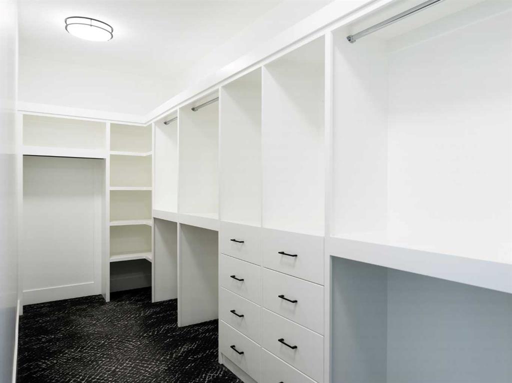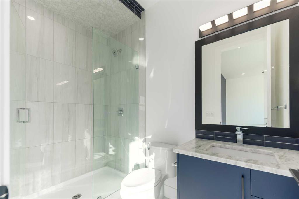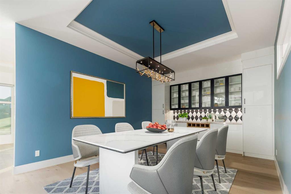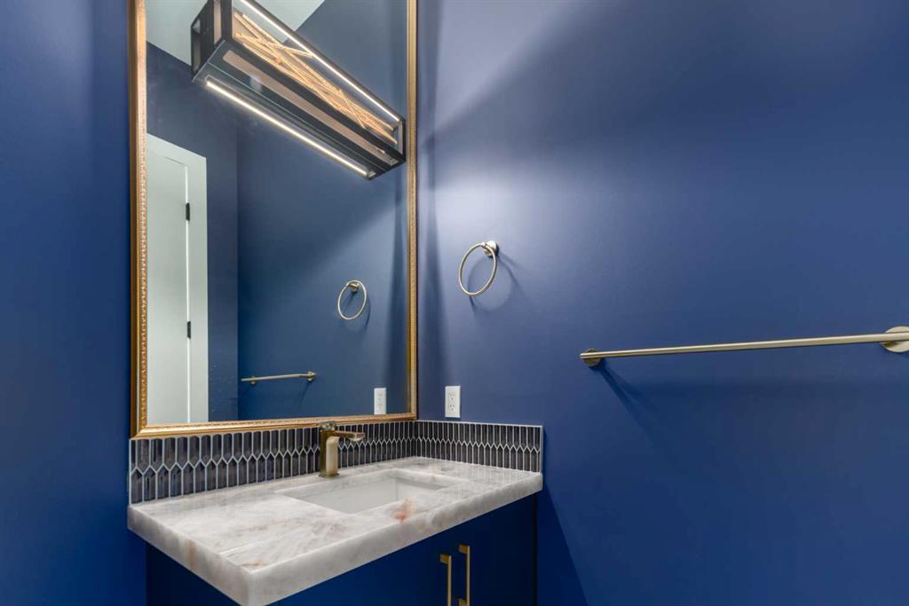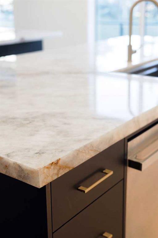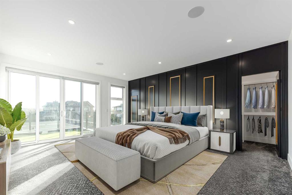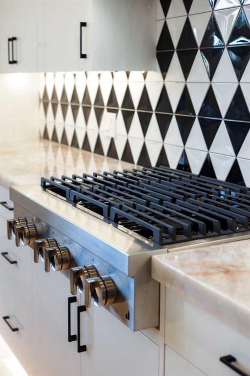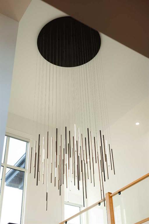 This modern estate in Calgary’s prestigious Watermark community showcases precision construction, advanced systems, and contemporary design. A heated four-car garage features a durable epoxy floor, radiant in-floor and gas heating, a half bath, and ample space for a workshop or bench setup. Inside, a residential elevator provides full accessibility across all levels, while engineered hardwood flooring, custom millwork, and an open-riser glass staircase define the home’s architectural character. The great room features a tray ceiling with recessed lighting and a linear gas fireplace framed in charcoal tile, blending form and function. The chef’s kitchen is anchored by dual onyx-clad islands, gloss-white cabinetry, brass fixtures, and Jenn-Air professional appliances, complemented by a full prep kitchen with induction cooktop, secondary refrigerator, and dishwasher for seamless entertaining. The formal dining area includes built-in cabinetry, crown detailing, and geometric backsplash, while a front sitting room with a wood-accent fireplace, glass-enclosed office, and powder room with onyx counter and brass accents complete the main level. A well-appointed mudroom offers full-height storage, marbled tile, and a built-in bench for easy transitions. Upstairs, the primary suite includes a private balcony with mountain views, dual walk-in closets, and a spa ensuite with heated floors, dual vanities, steam shower with dual rain heads, and a deep soaker tub. Three additional bedrooms feature walk-in closets, with both Jack & Jill and private ensuite layouts. The upper level also offers a loft, study nook, and laundry room with quartz counters, extending to an outdoor patio finished with glass railings and synthetic turf. The lower level is designed for recreation and fitness, with a quartz wet bar, brass fixtures, beverage fridge, custom shelving, media area, mirrored gym, and two bedrooms with walk-in closets and full baths. Finishes include luxury vinyl plank, recessed lighting, and marbled tile throughout. Mechanical highlights feature radiant in-floor heating throughout the lower level, high-efficiency HVAC, smart lighting controls, and an integrated sound system — combining craftsmanship, durability, and performance in one of Watermark’s most technically refined residences.